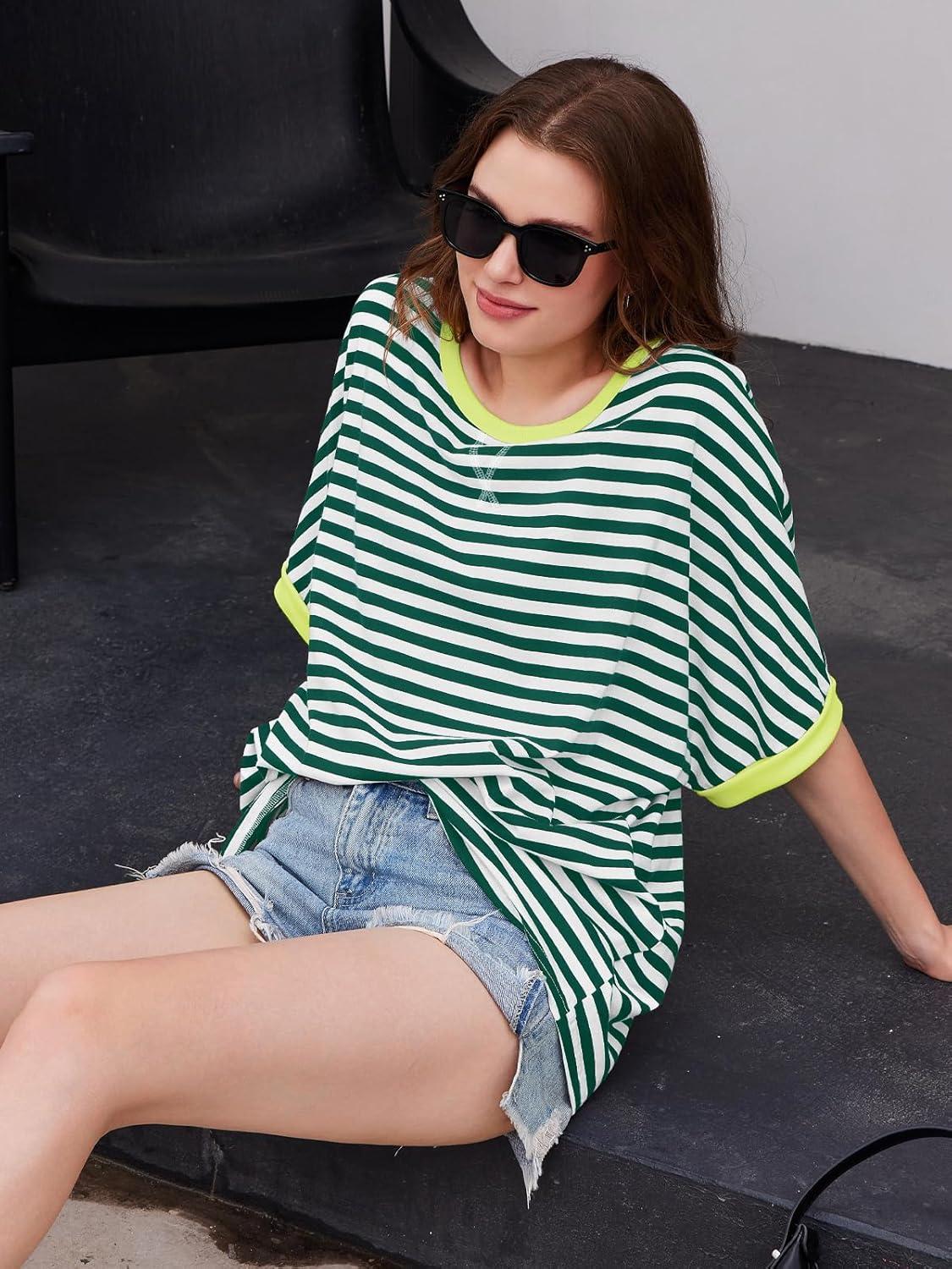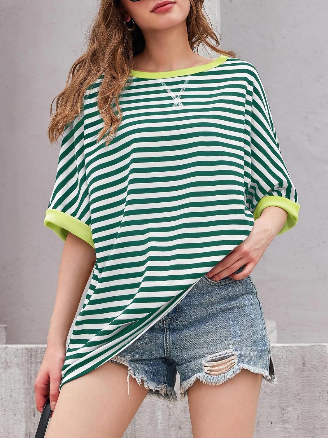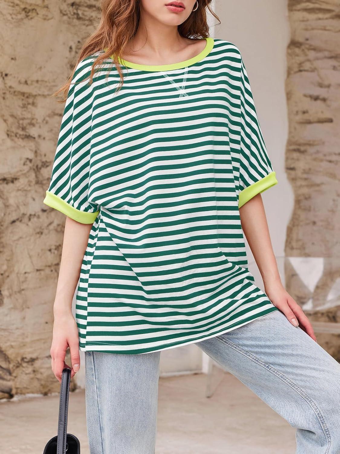 Tankaneo Womens Oversized Striped Tee Shirt Summer Casual Color Block Half Sleeve Crew Neck Tunic Tops(Dark Green)