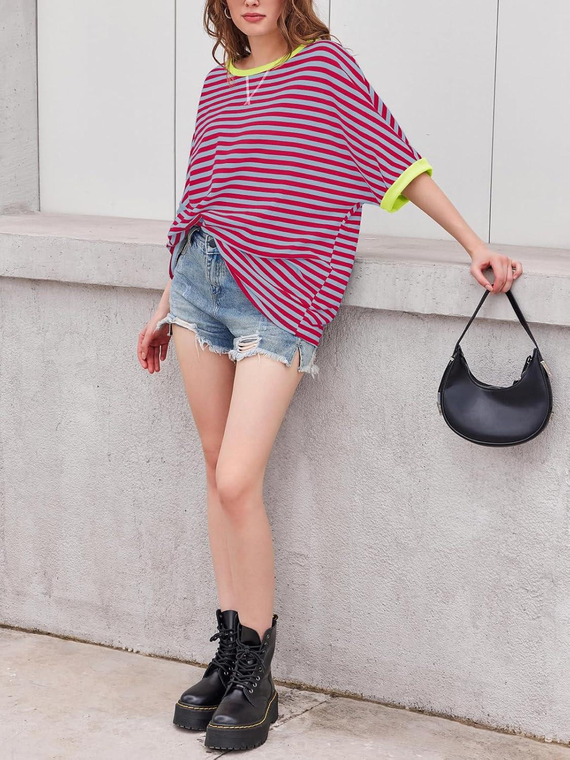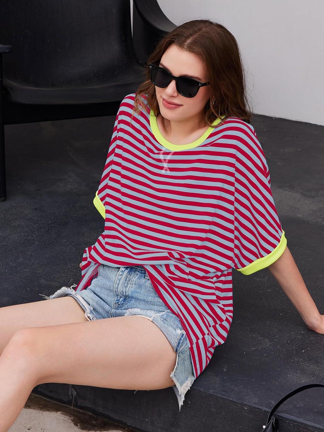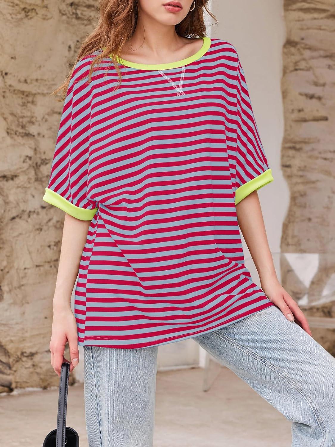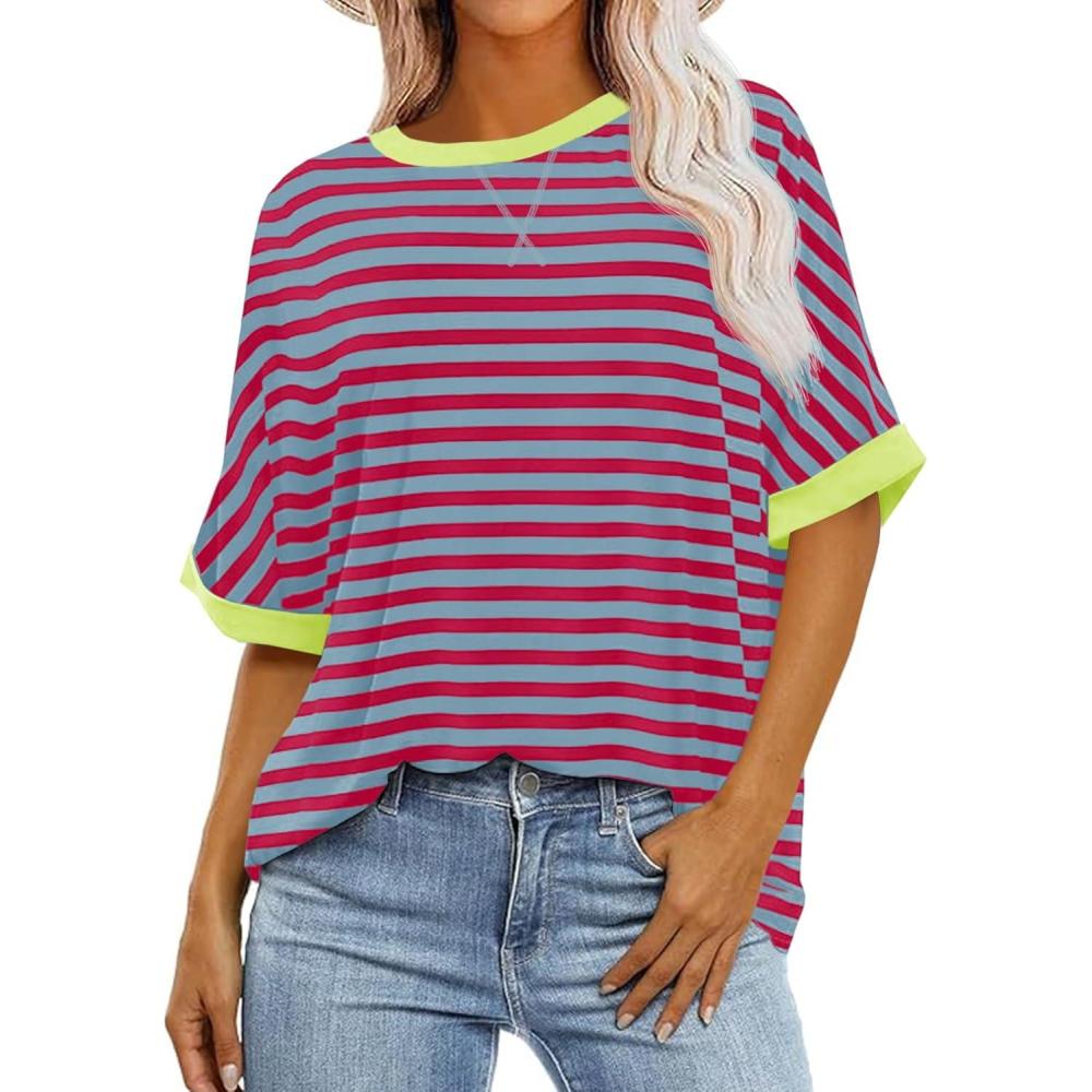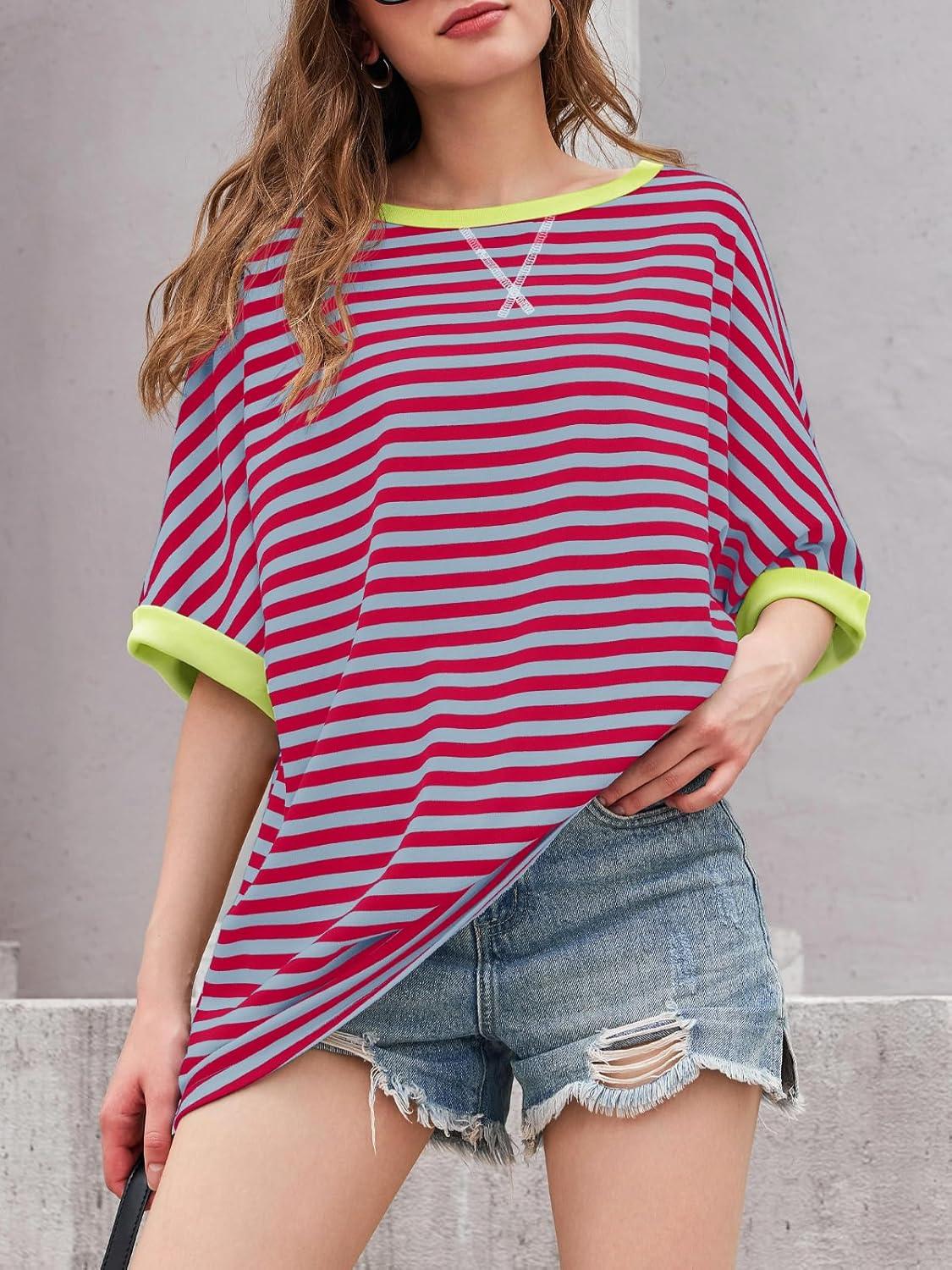 Tankaneo Womens Oversized Striped Tee Shirt Summer Casual Color Block Half Sleeve Crew Neck Tunic Tops(Light Red)