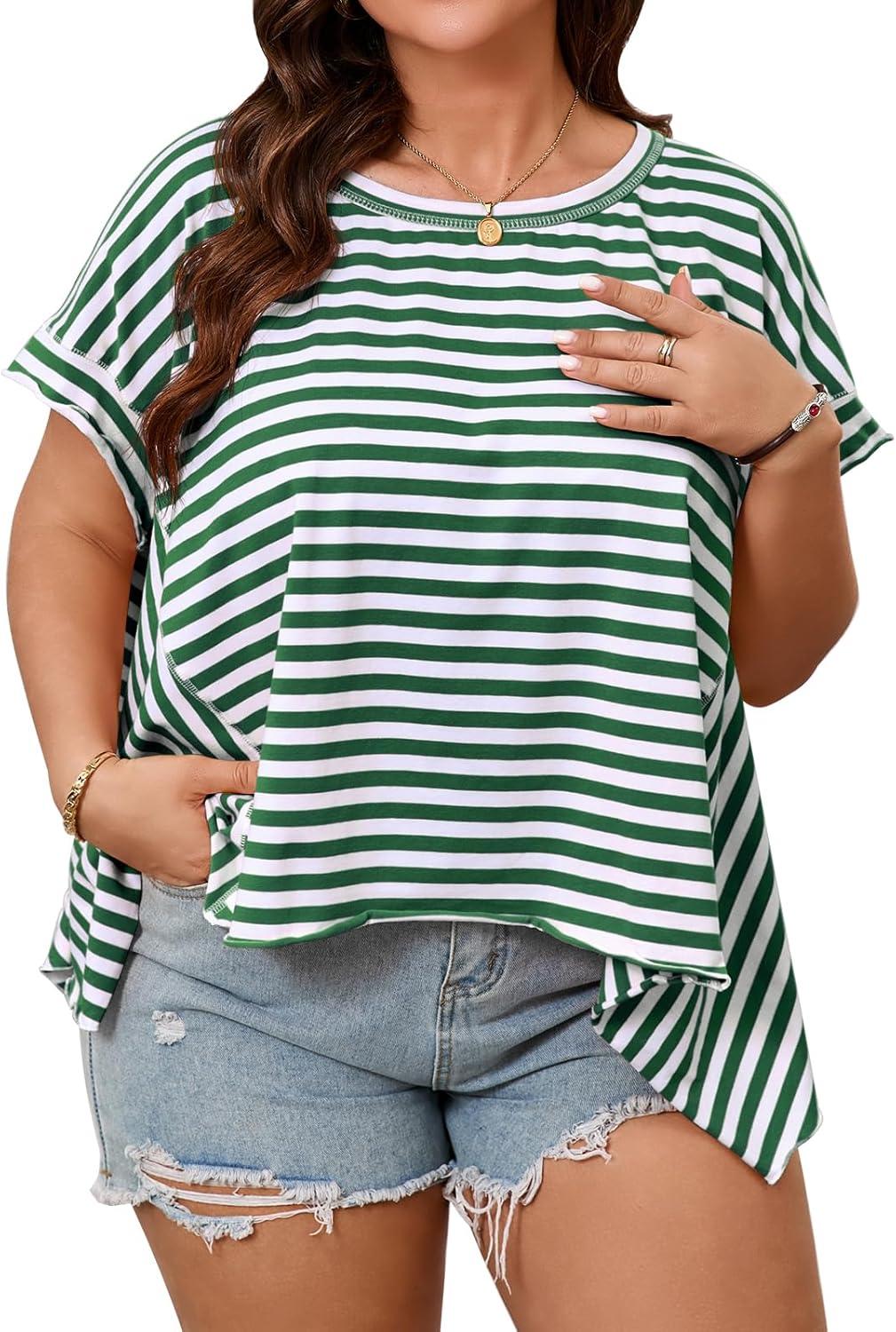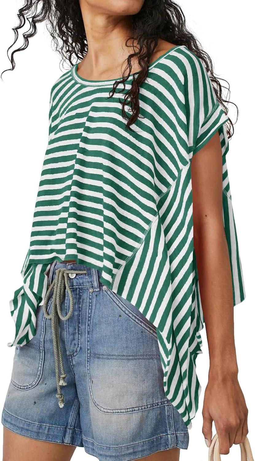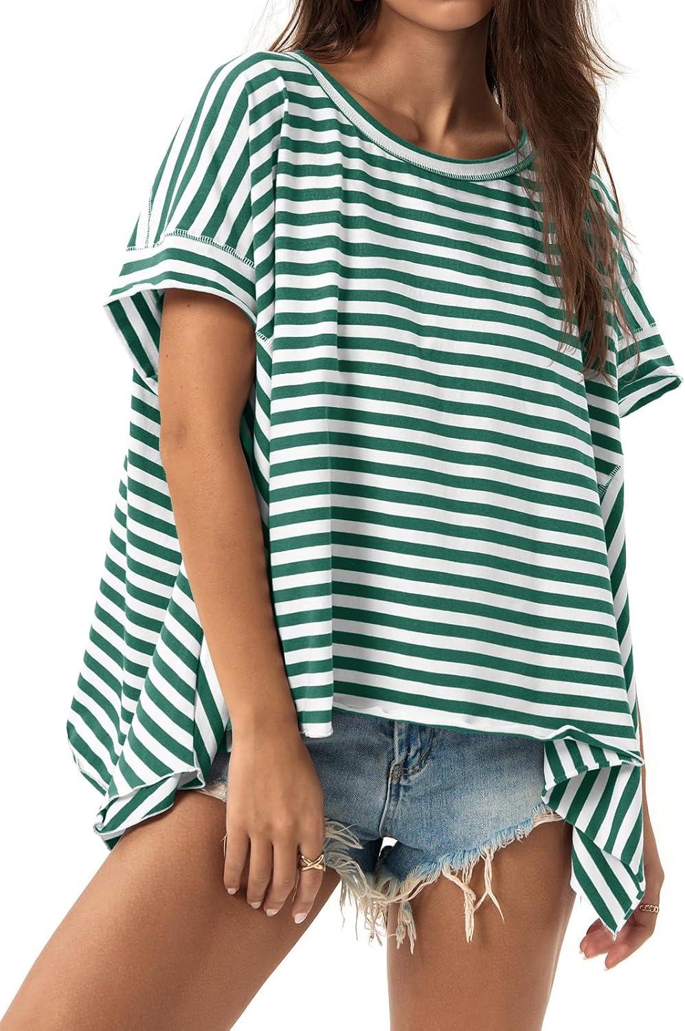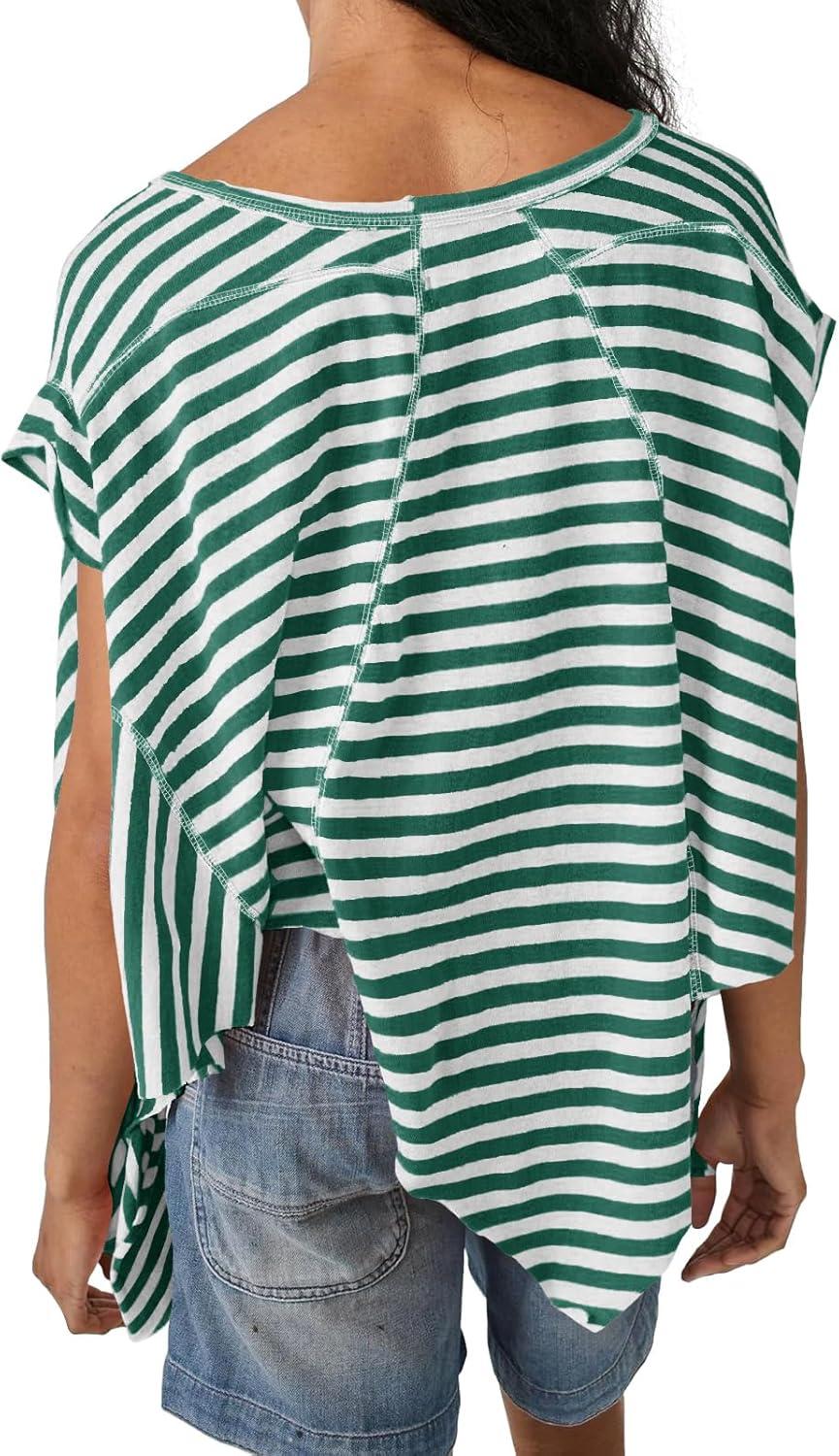 Tankaneo Womens Oversized Striped Tshirts Irregular Hem Batwing Short Sleeve Tops Summer Casual Round Neck Tee Shirts(Green)