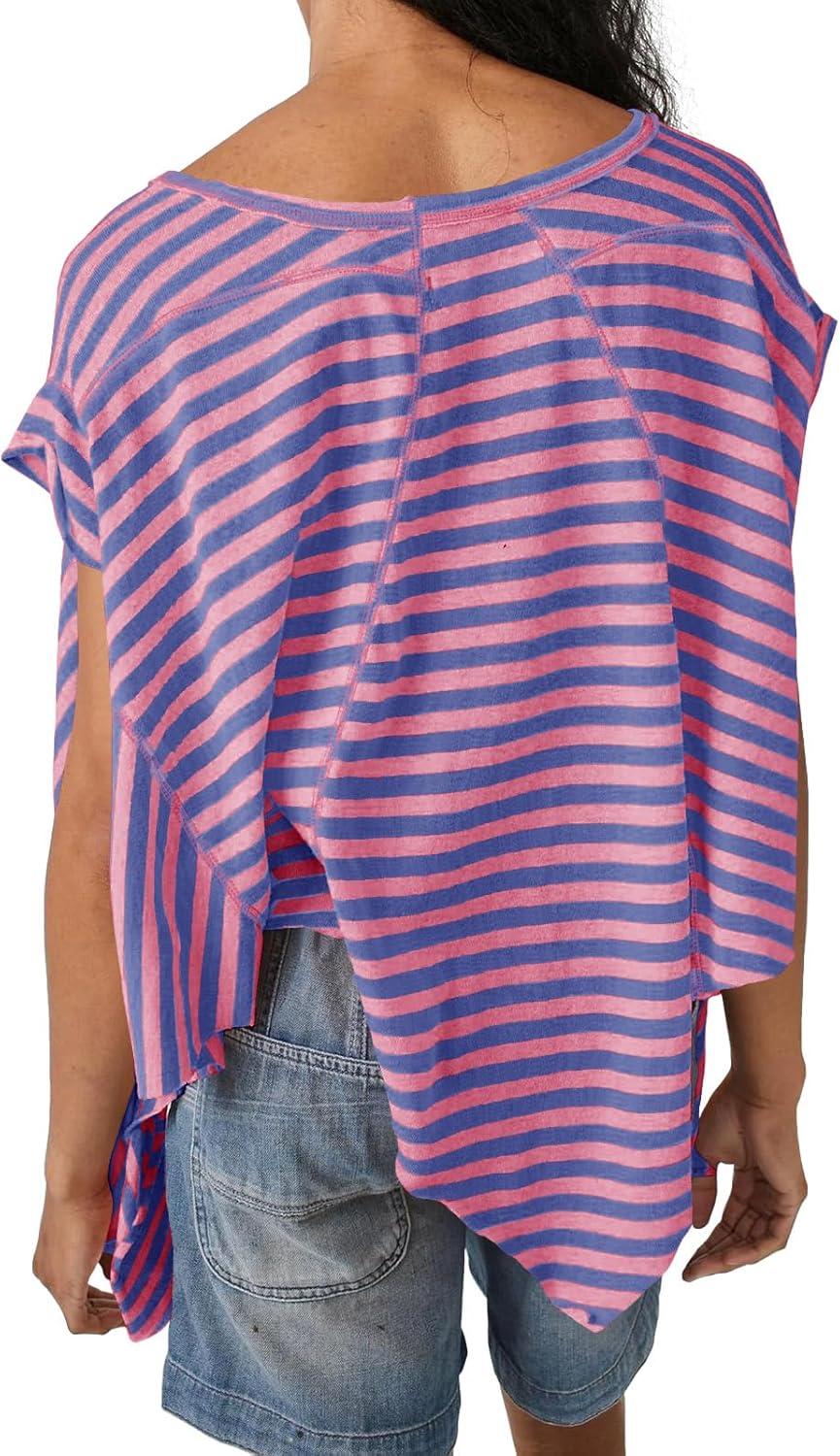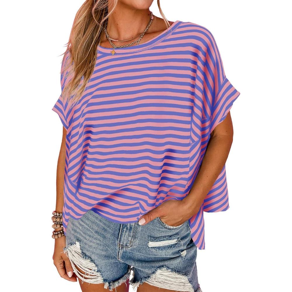 Tankaneo Womens Oversized Striped Tshirts Irregular Hem Batwing Short Sleeve Tops Summer Casual Round Neck Tee Shirts(Pink)
