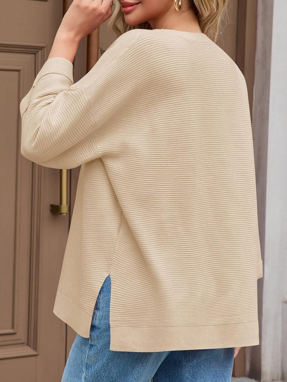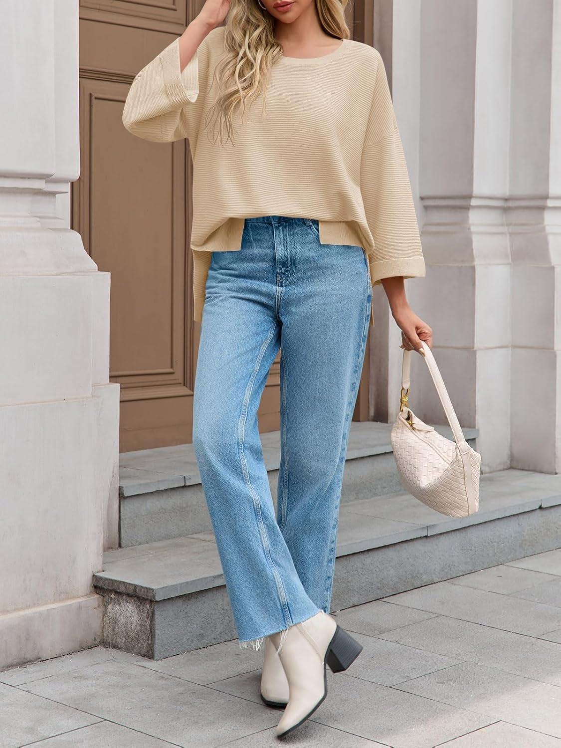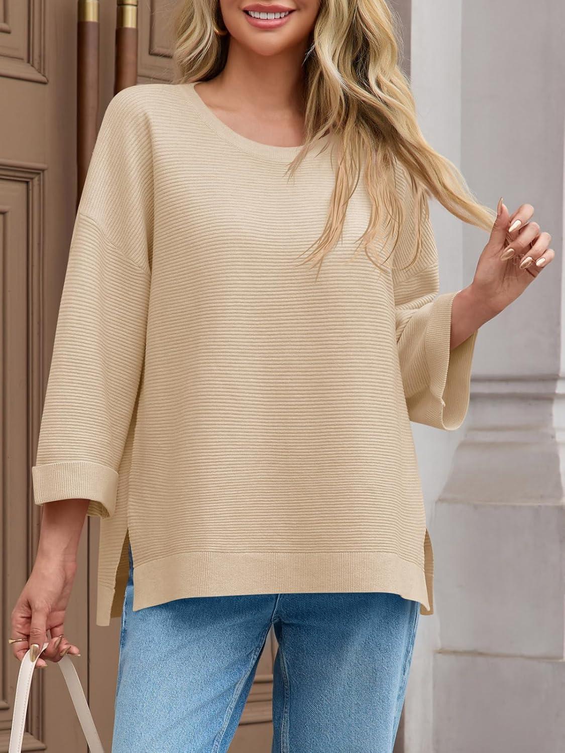 Tankaneo Women’s Oversized Sweaters Casual 3/4 Long Sleeve Crewneck Ribbed Knit Split Tunics Fall Loose Pullover Tops(Apricot)