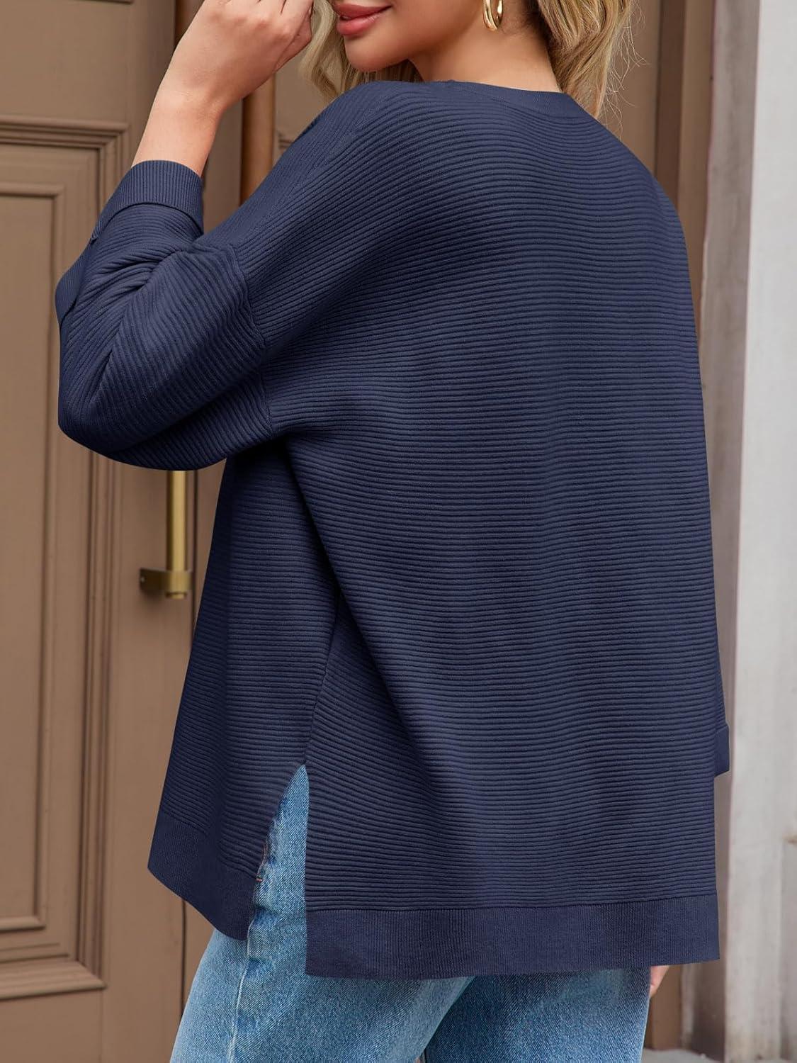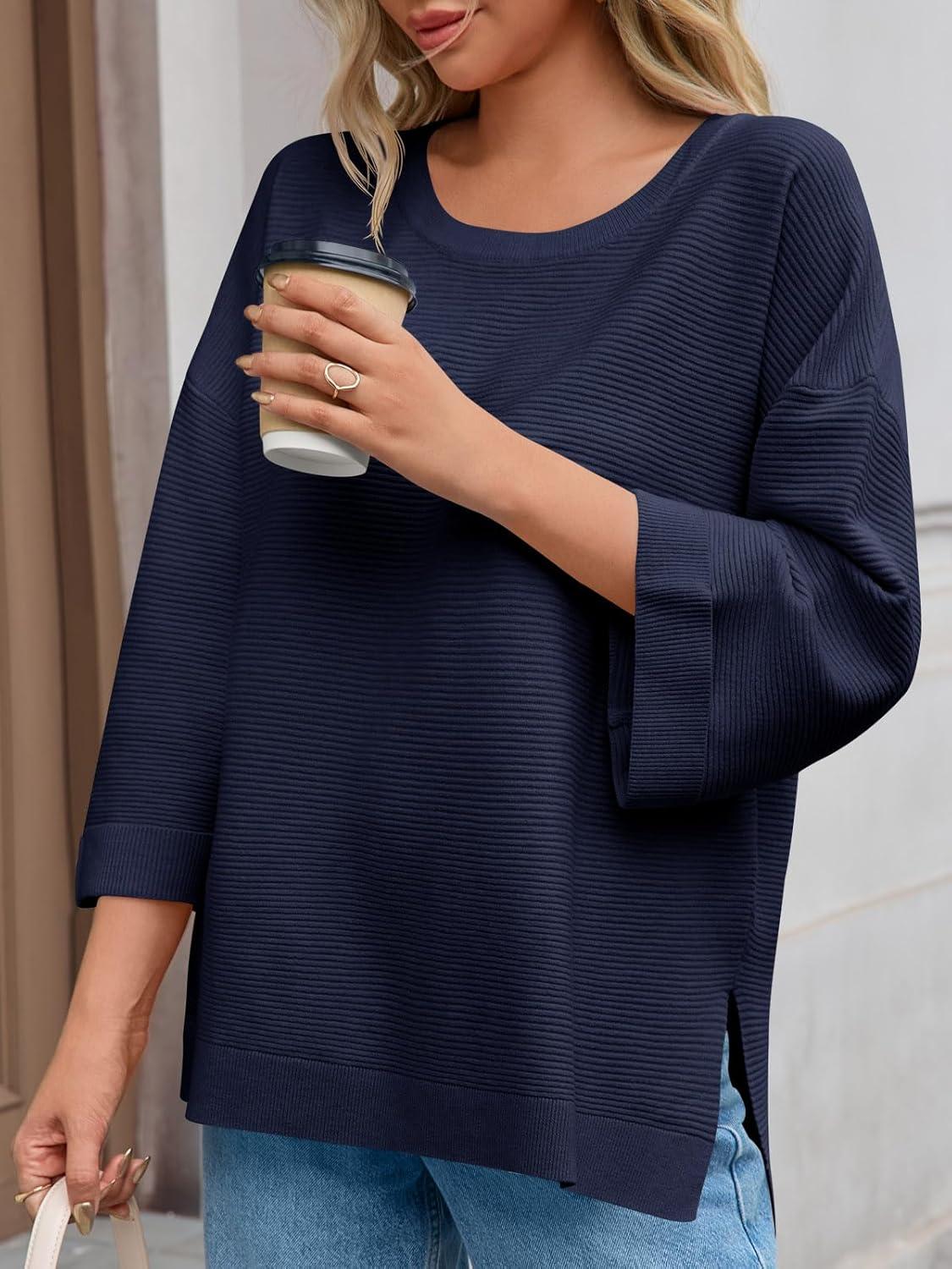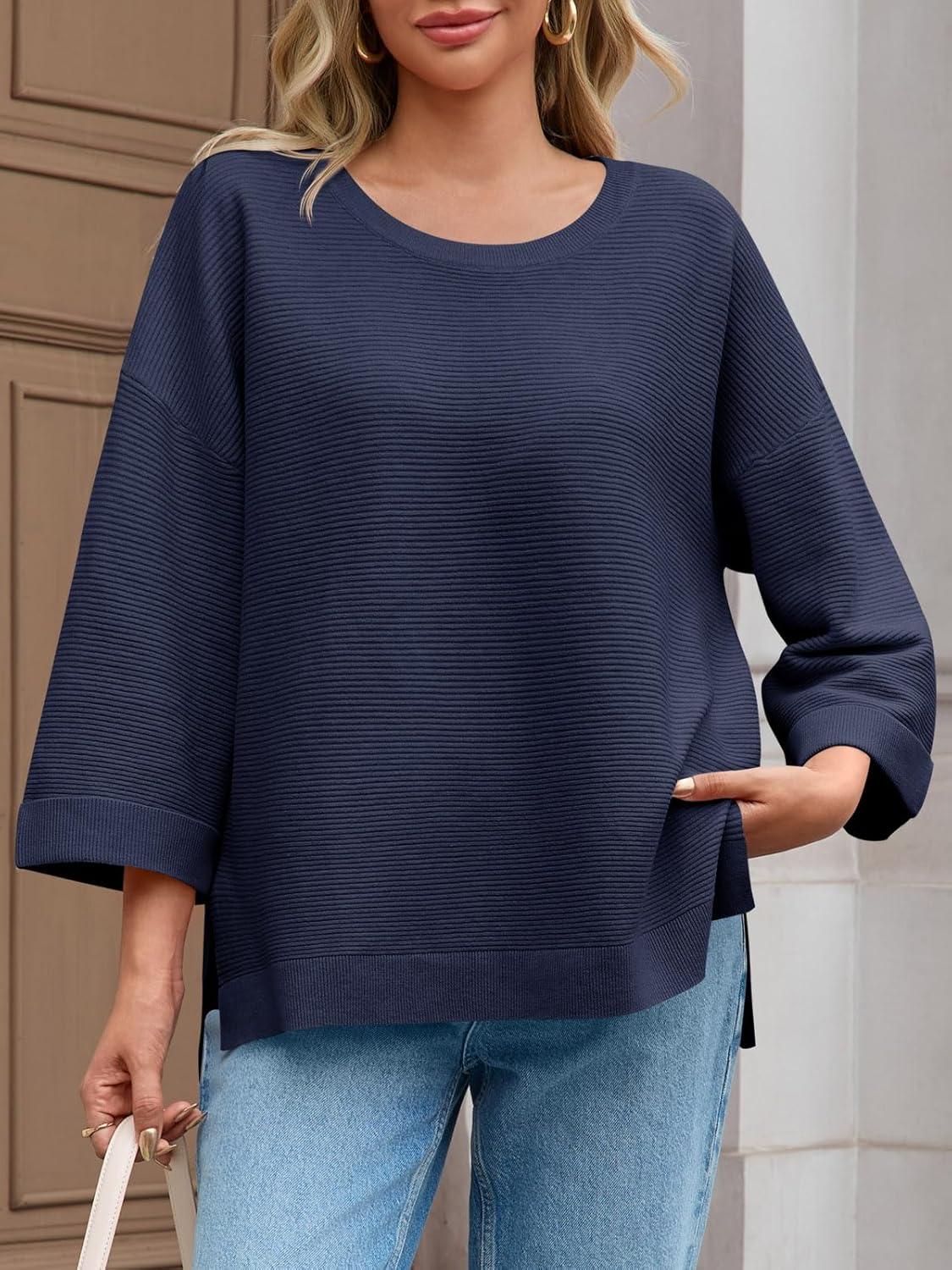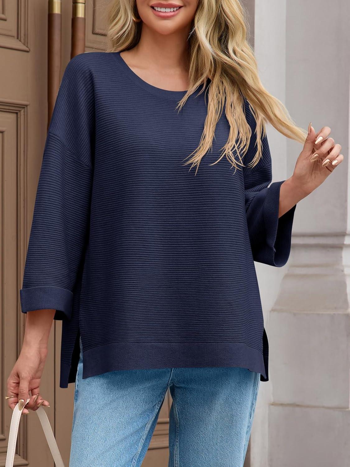 Tankaneo Women’s Oversized Sweaters Casual 3/4 Long Sleeve Crewneck Ribbed Knit Split Tunics Fall Loose Pullover Tops(Navy)