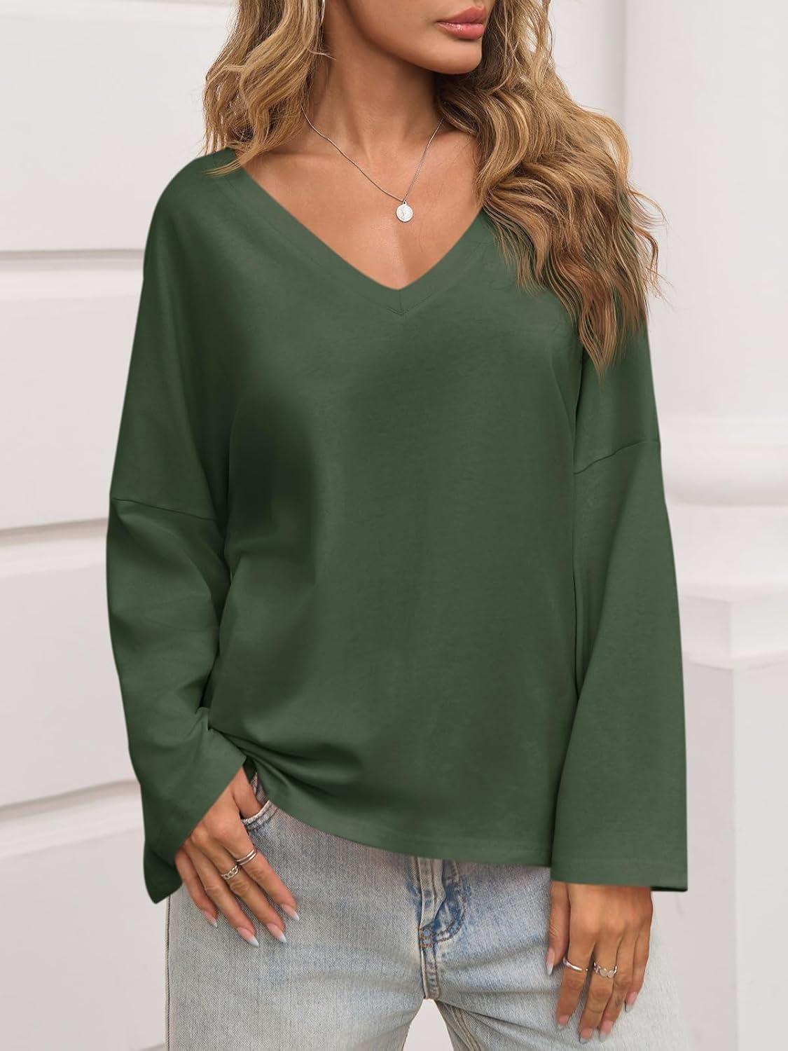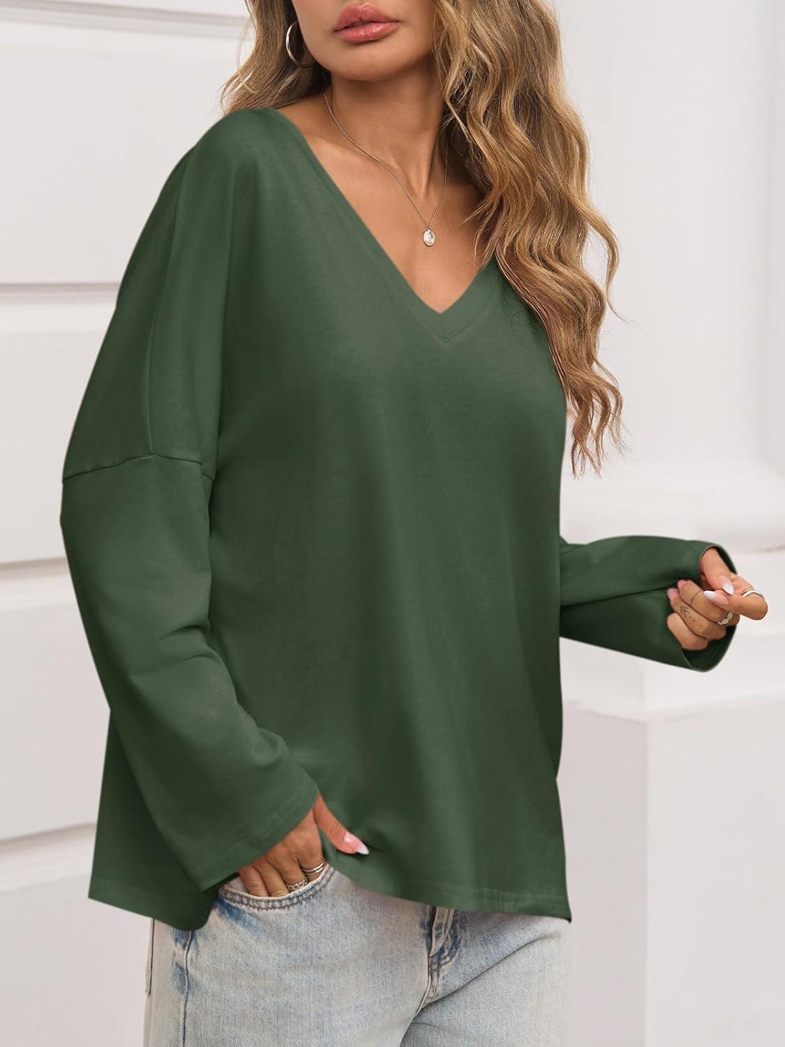 Tankaneo Womens Oversized T Shirts Casual V Neck Batwing Long Sleeve Shirts Loose Fit Tunic Tops(Army Green)