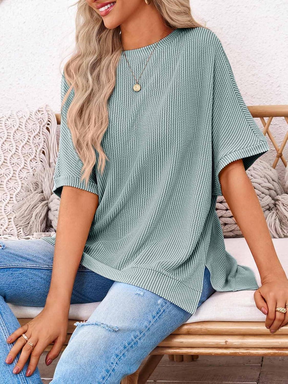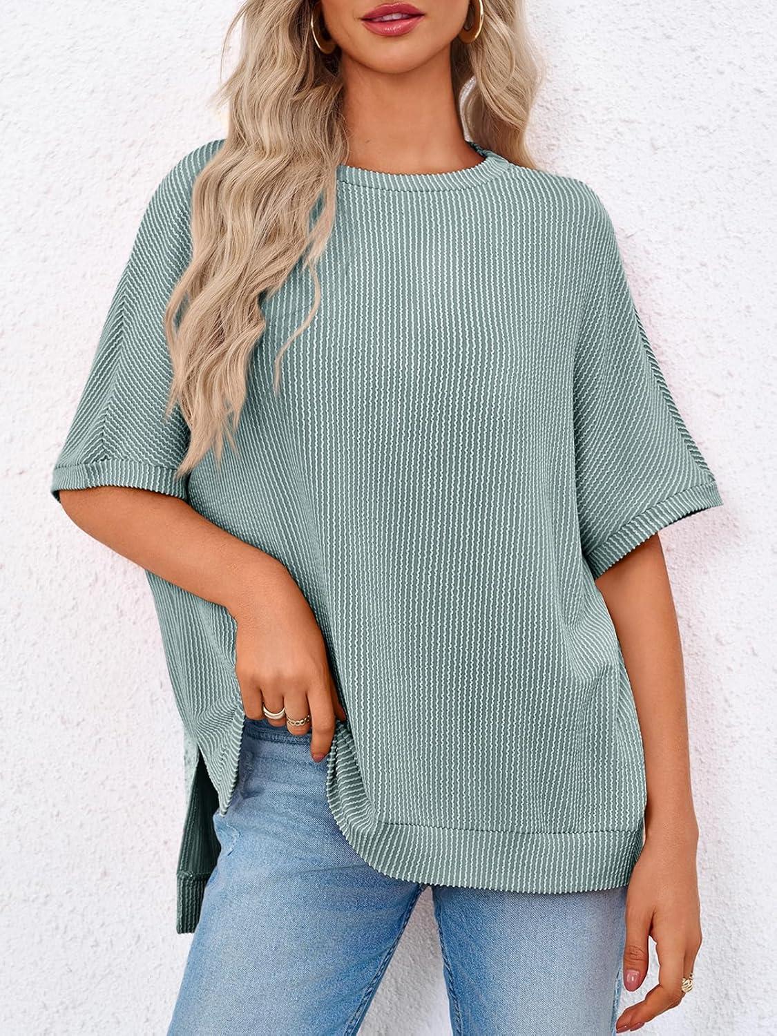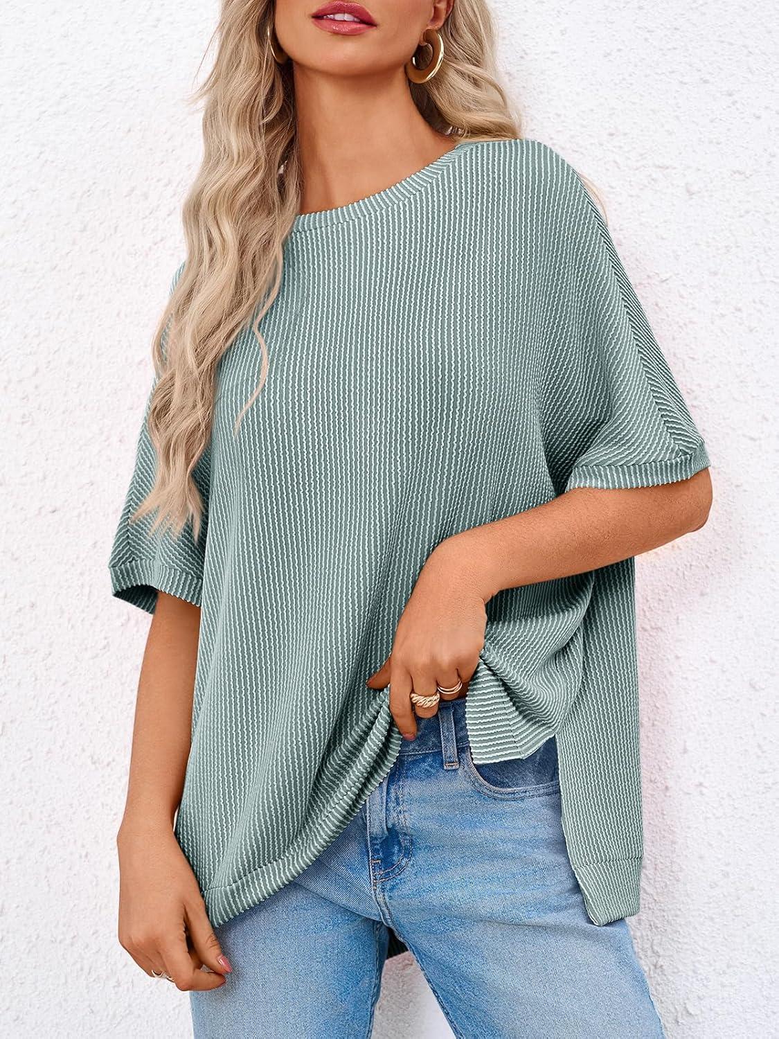 Tankaneo Womens Oversized T Shirts Summer Casual Ribbed Batwing Short Sleeve Tunic Tops Loose Fit Dolman Sleeve Tees(Light Green)