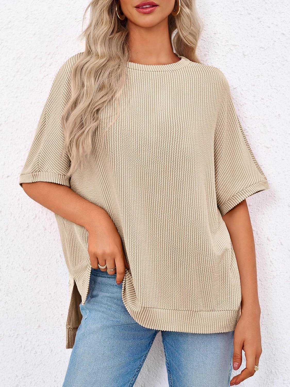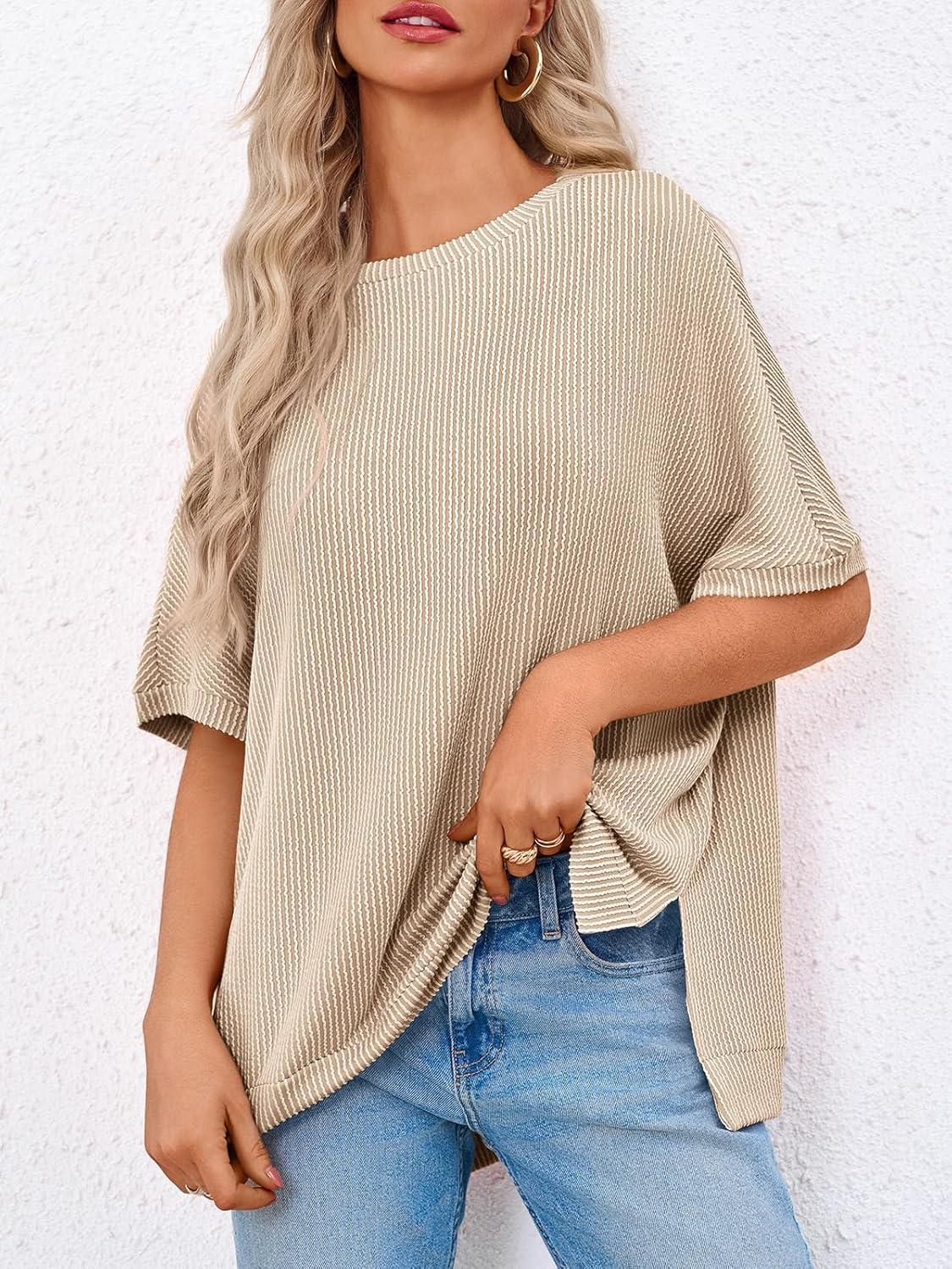 Tankaneo Womens Oversized T Shirts Summer Casual Ribbed Batwing Short Sleeve Tunic Tops Loose Fit Dolman Sleeve Tees(Light Khaki)