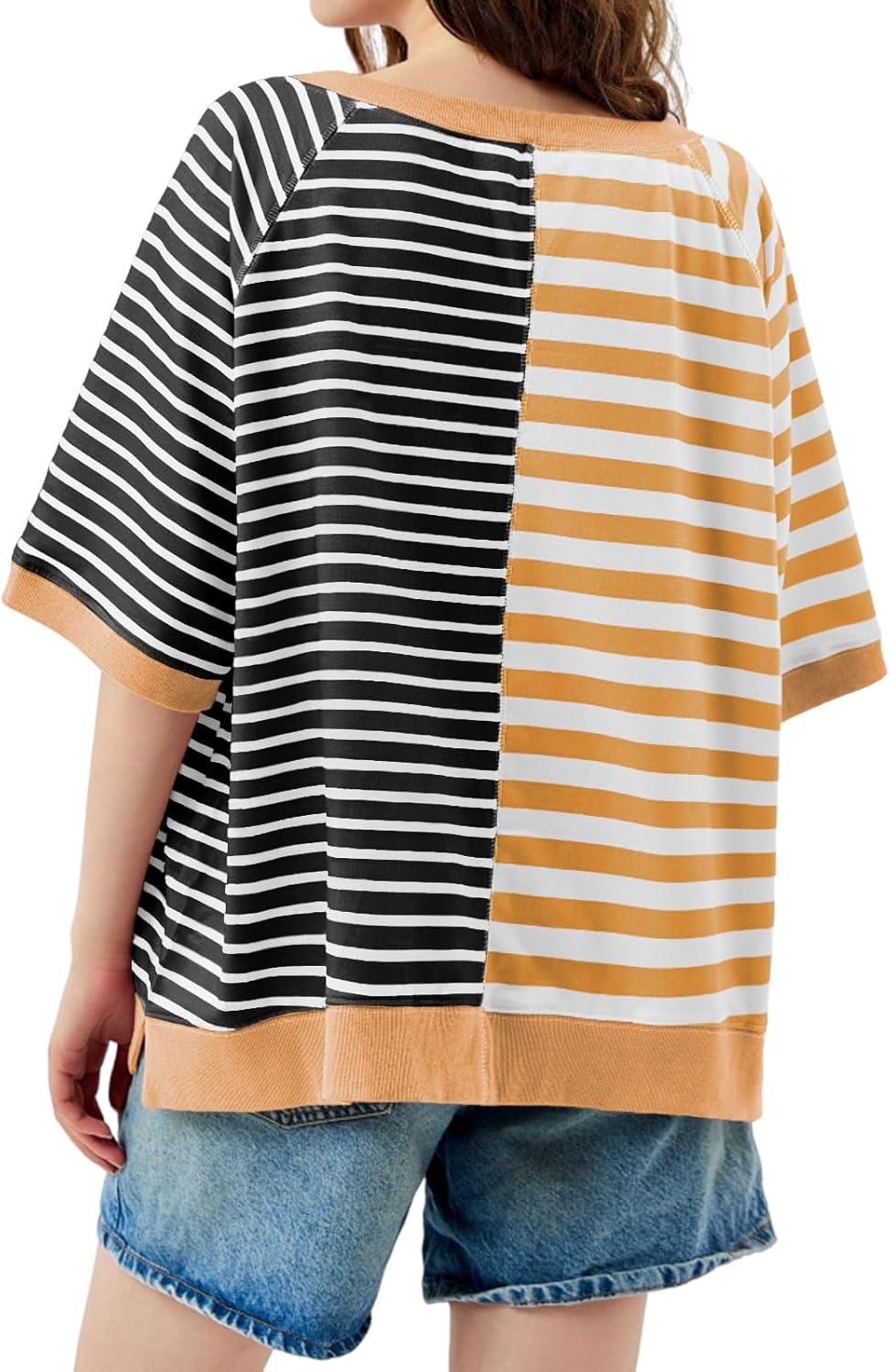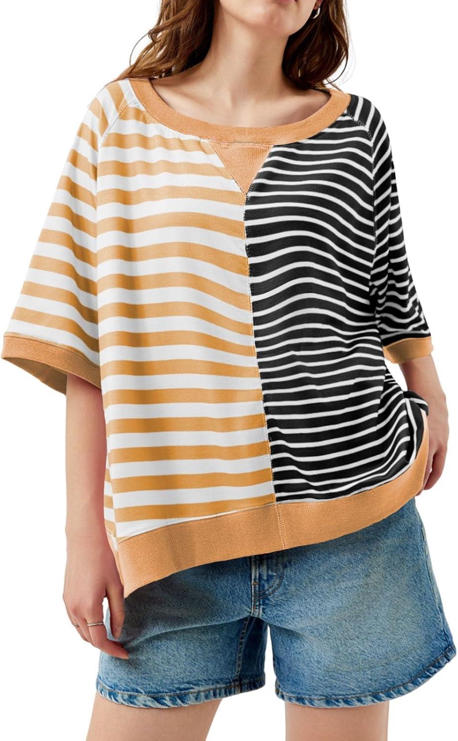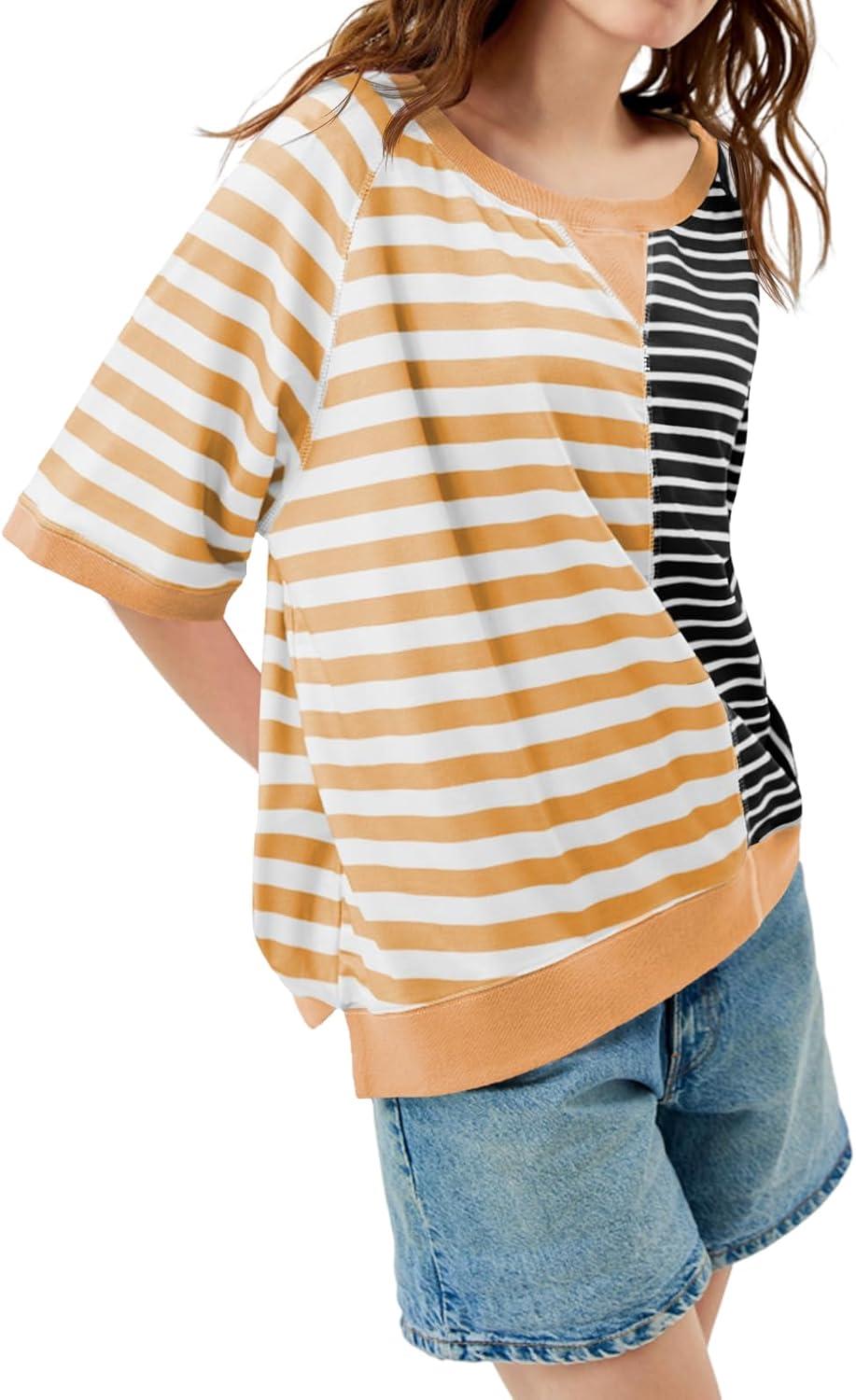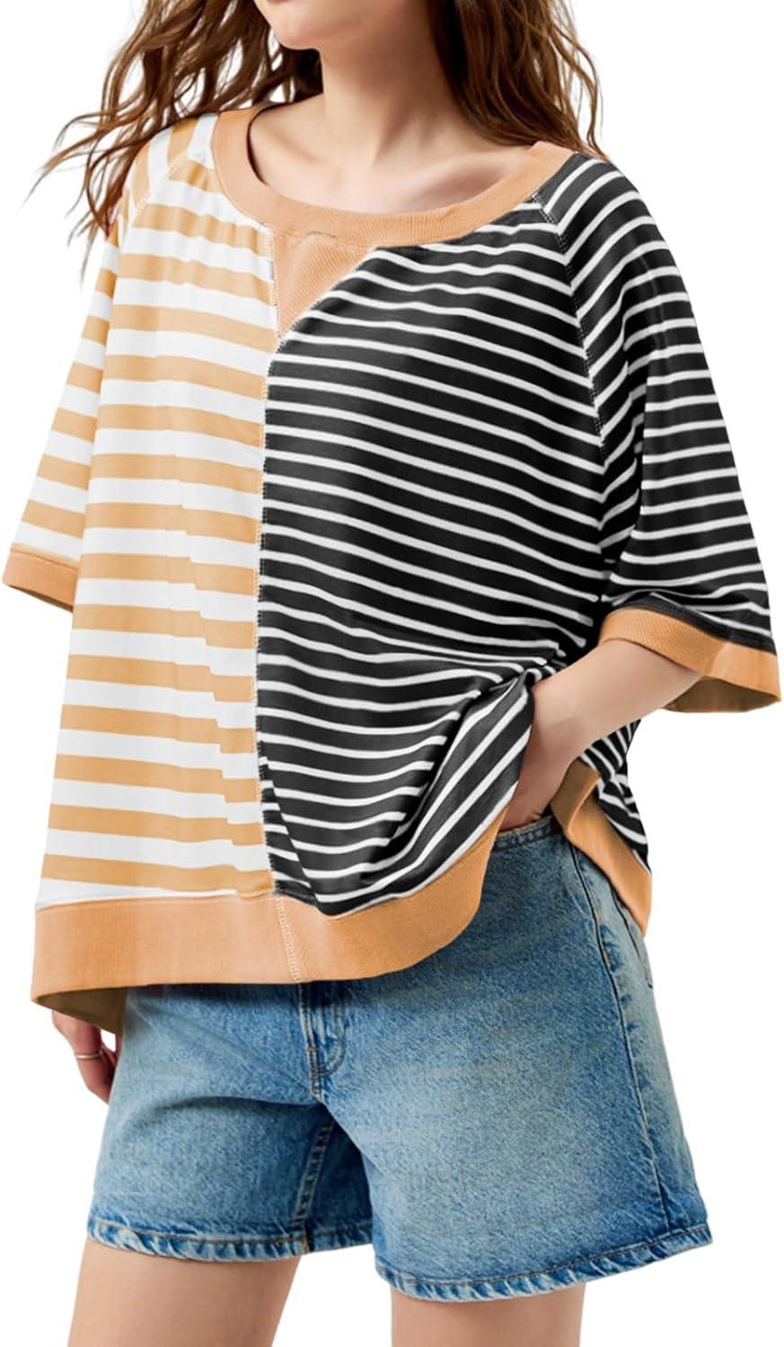 Tankaneo Womens Oversized T Shirts Summer Short Sleeve Striped Color Block Loose Fit Tops 2025 Trendy Clothes(Brown)