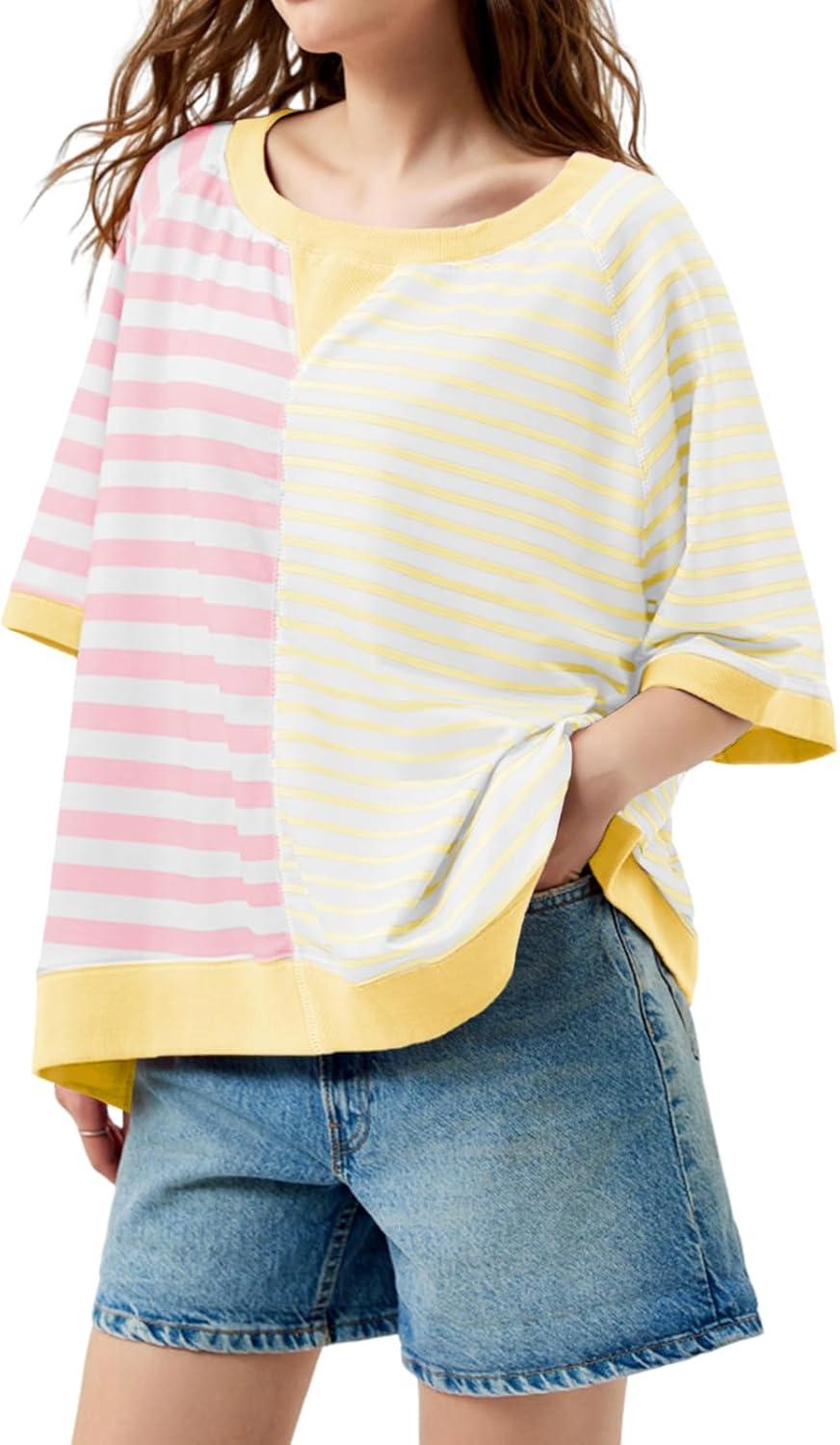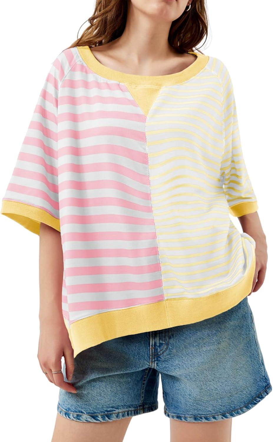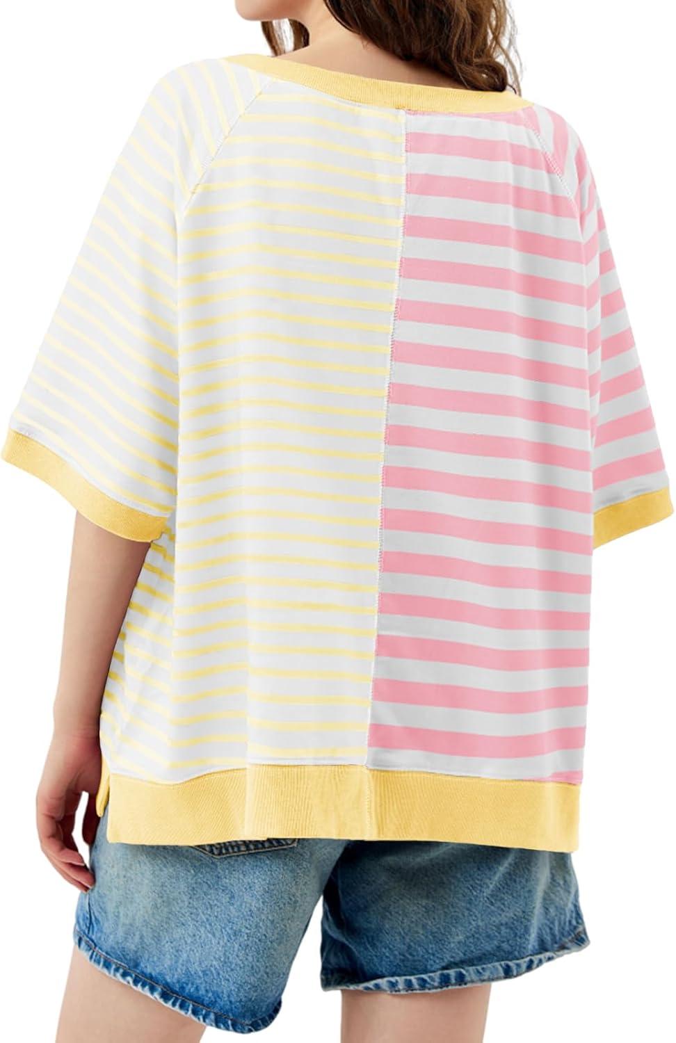Tankaneo Womens Oversized T Shirts Summer Short Sleeve Striped Color Block Loose Fit Tops 2025 Trendy Clothes(Yellow)