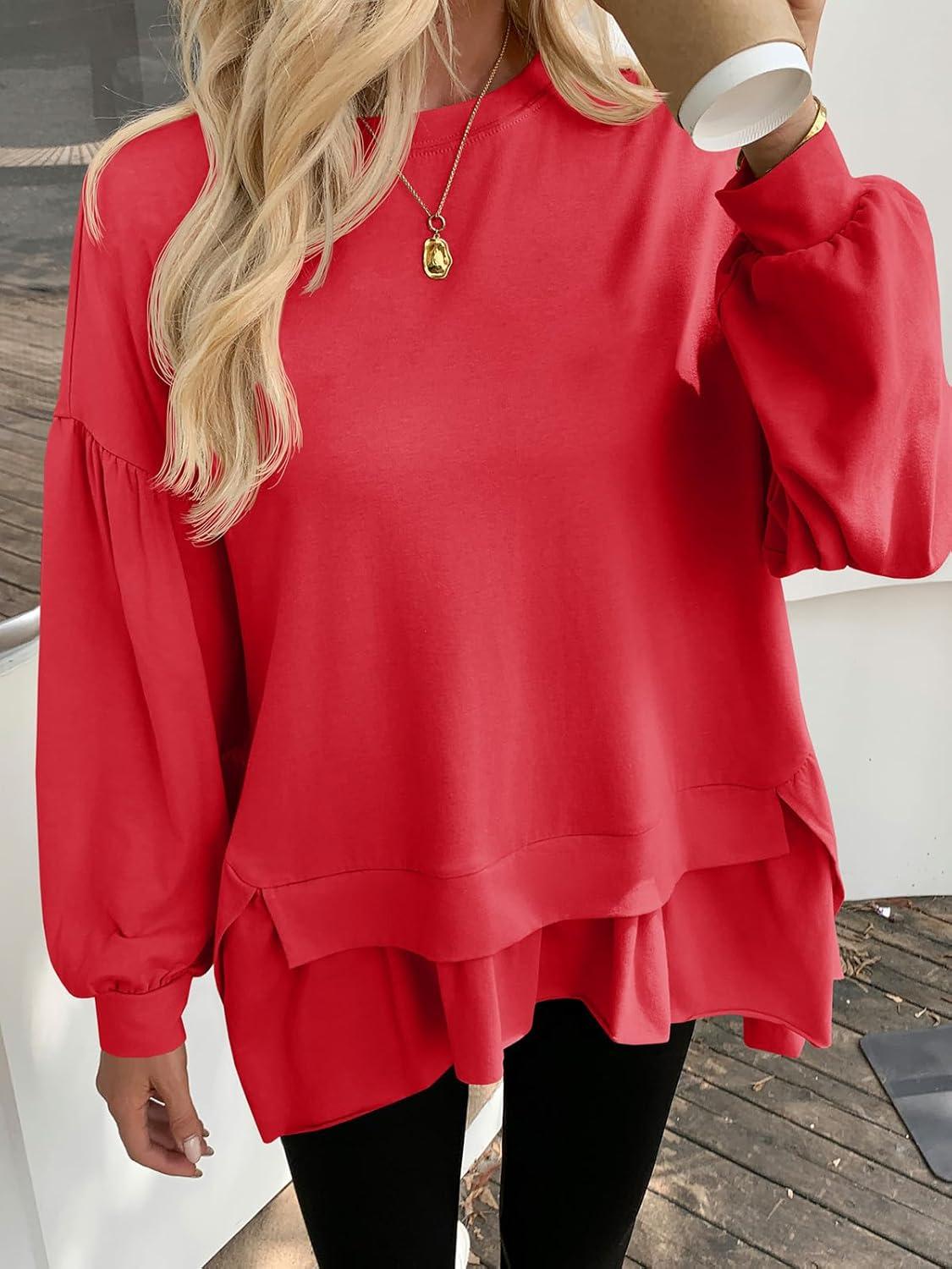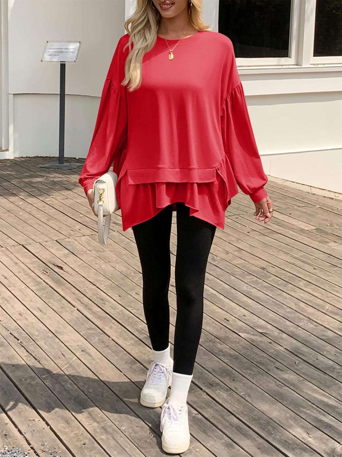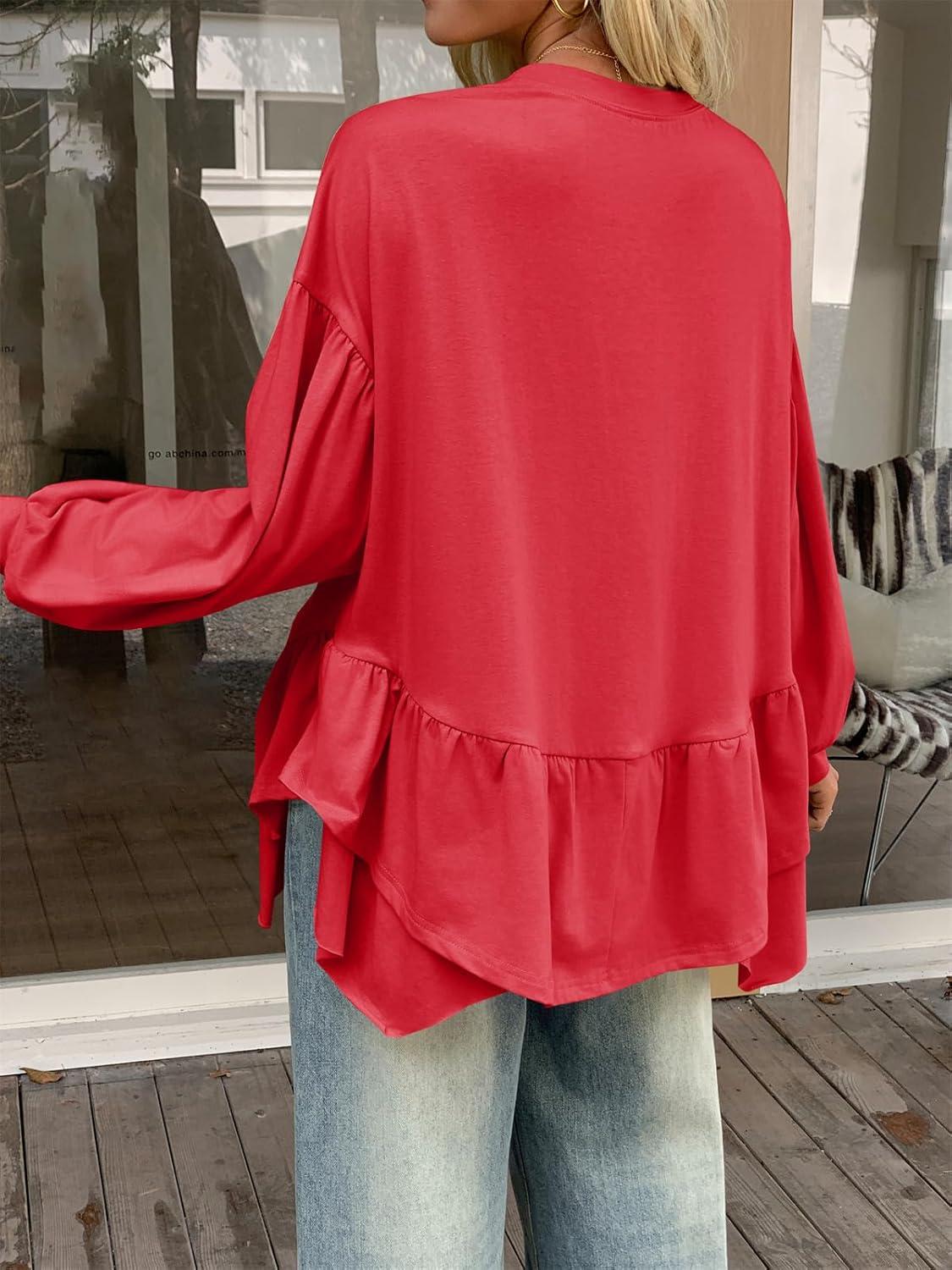 Tankaneo Womens Oversized Tops Peplum Puff Long Sleeve Shirts Trendy Casual Loose Fit Crew Neck Tunic Shirts(Red)