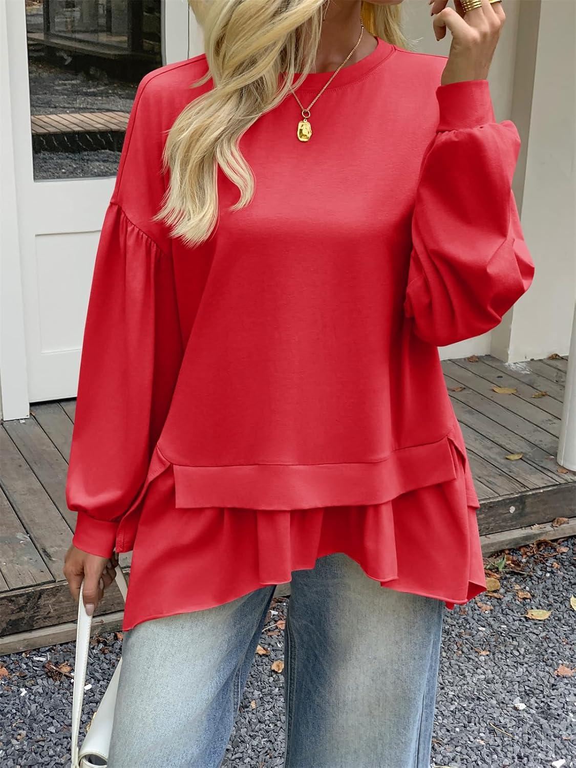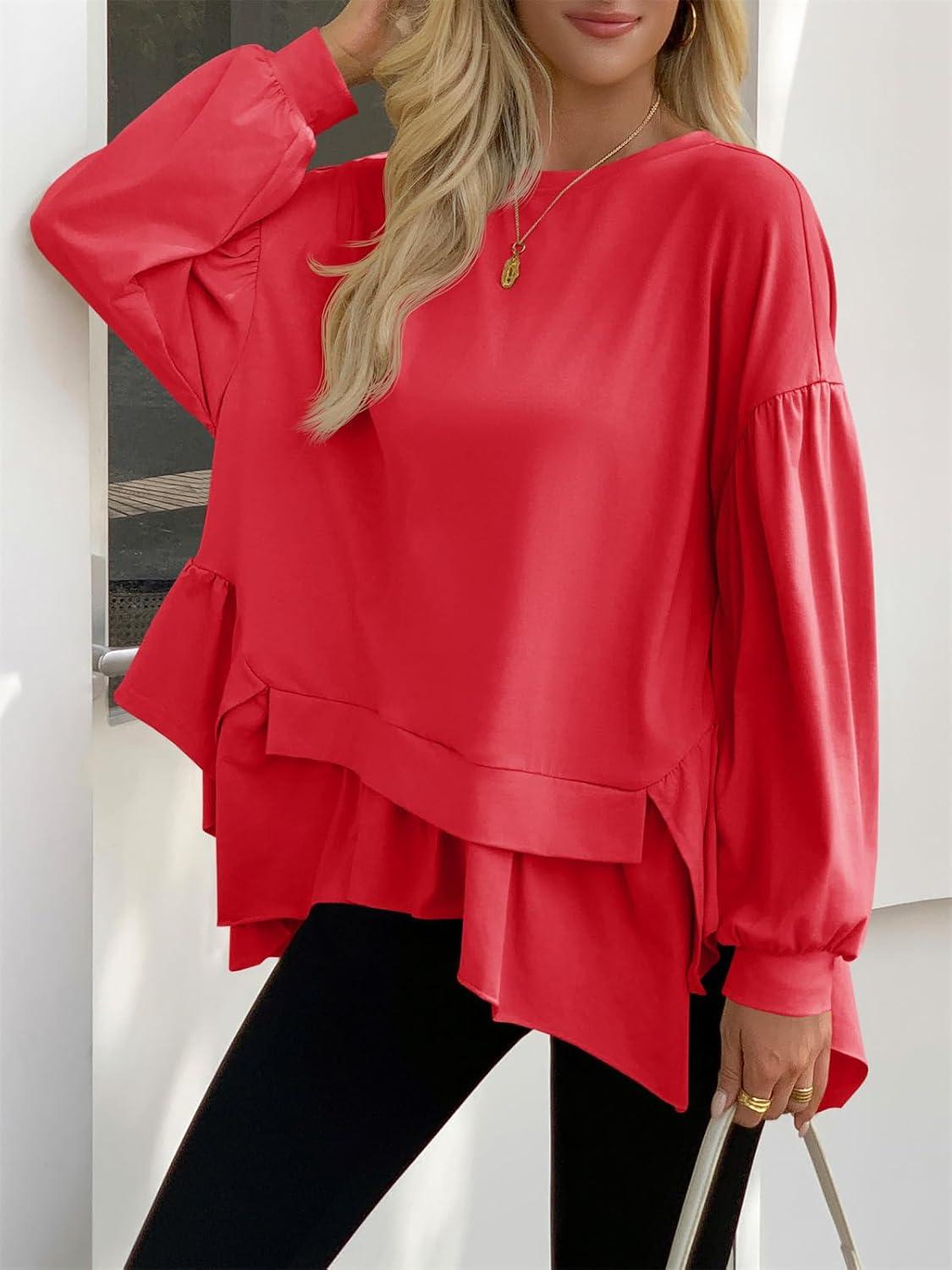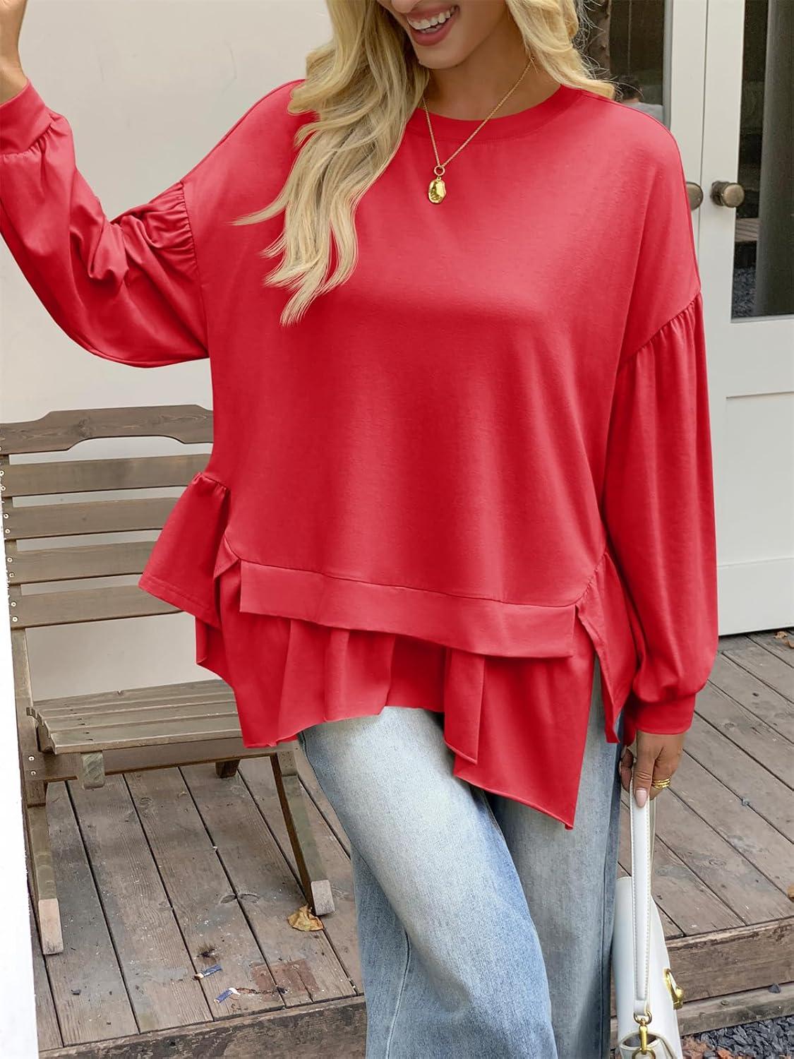 Tankaneo Womens Oversized Tops Peplum Puff Long Sleeve Shirts Trendy Casual Loose Fit Crew Neck Tunic Shirts(Red)