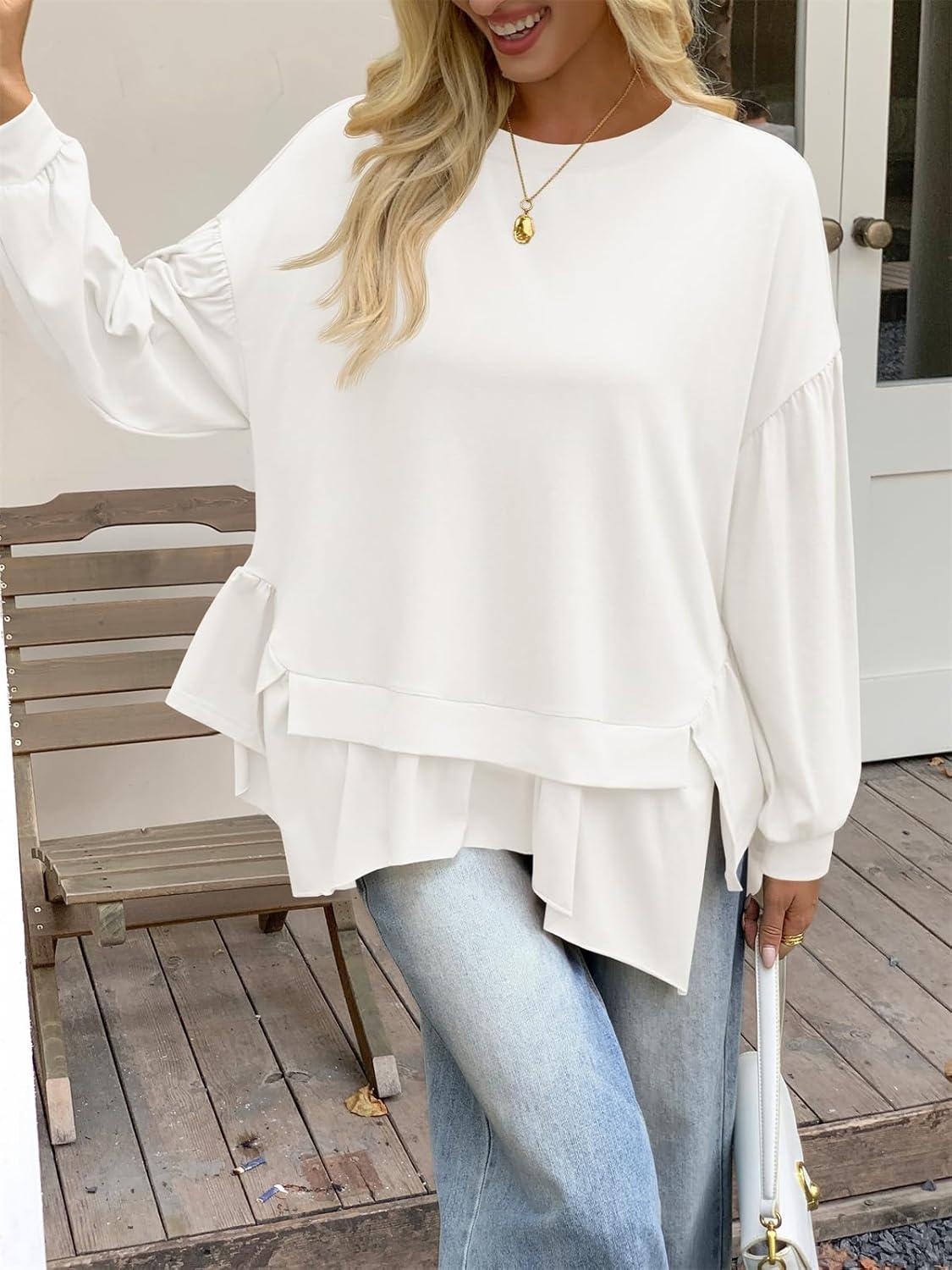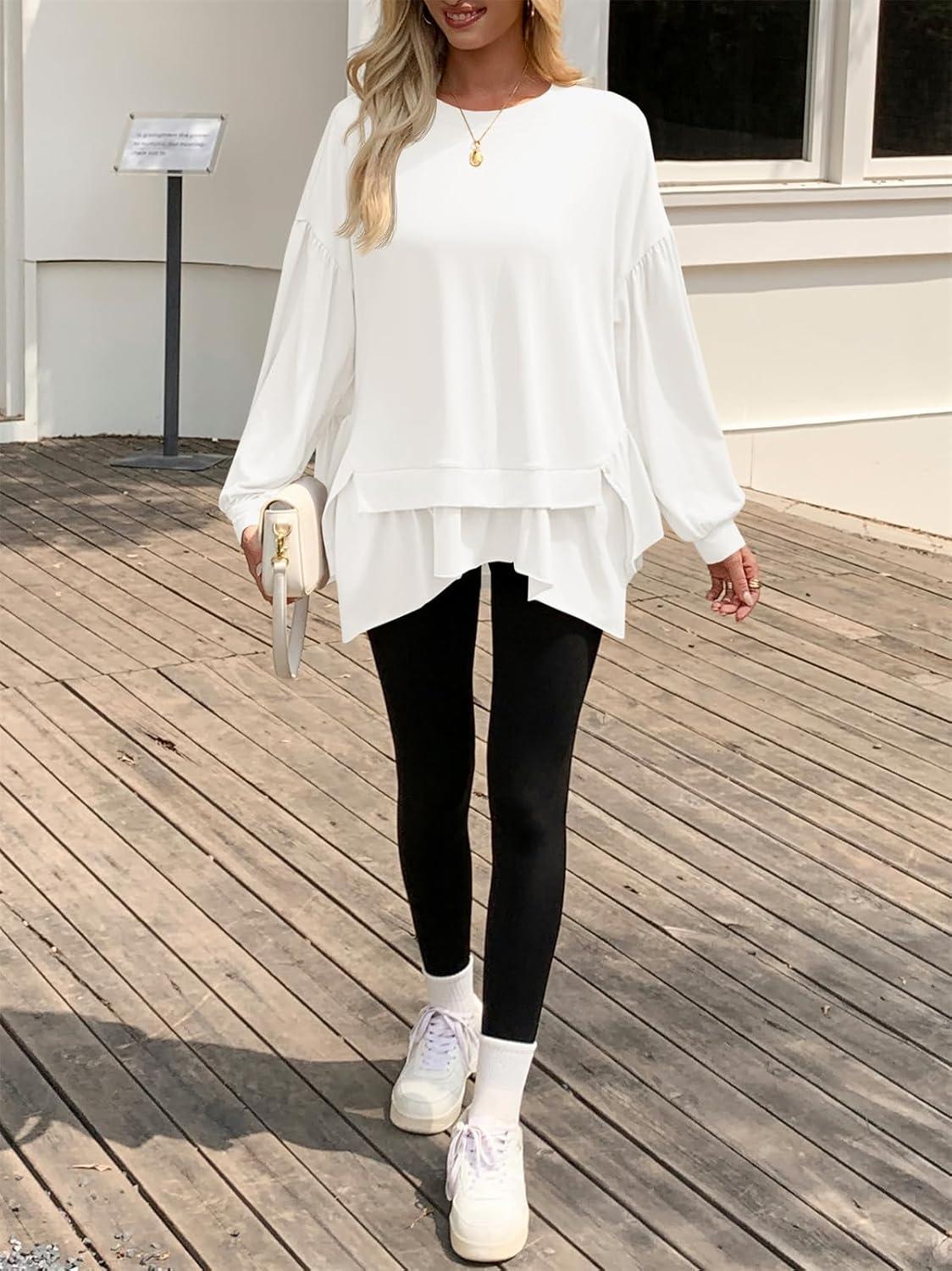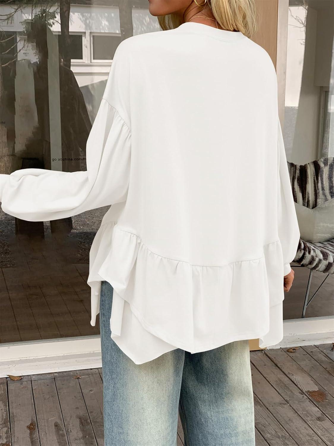 Tankaneo Womens Oversized Tops Peplum Puff Long Sleeve Shirts Trendy Casual Loose Fit Crew Neck Tunic Shirts(White)