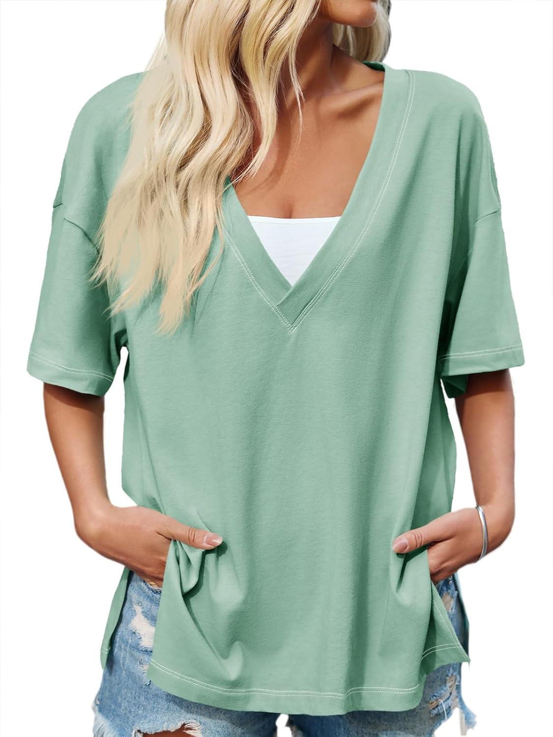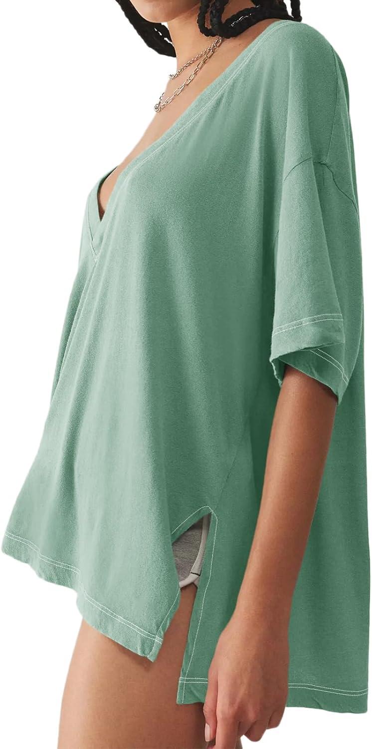 Tankaneo Womens Oversized Tshirts Deep V Neck Short Sleeve Tops Summer Casual Loose Fit Side Slit Tunic Shirts(Blue Green)
