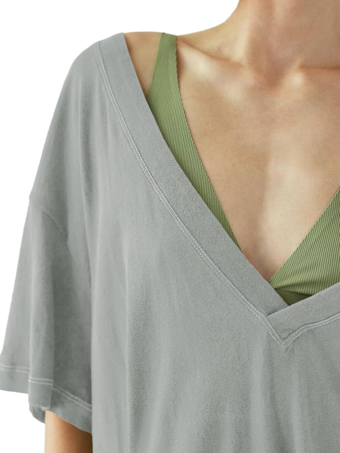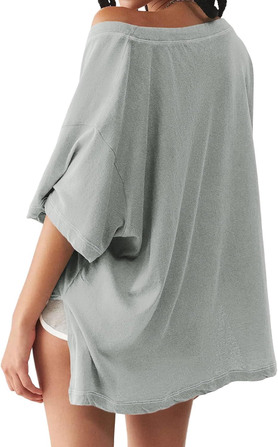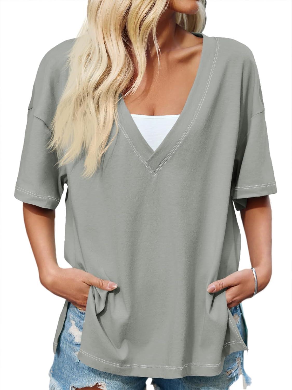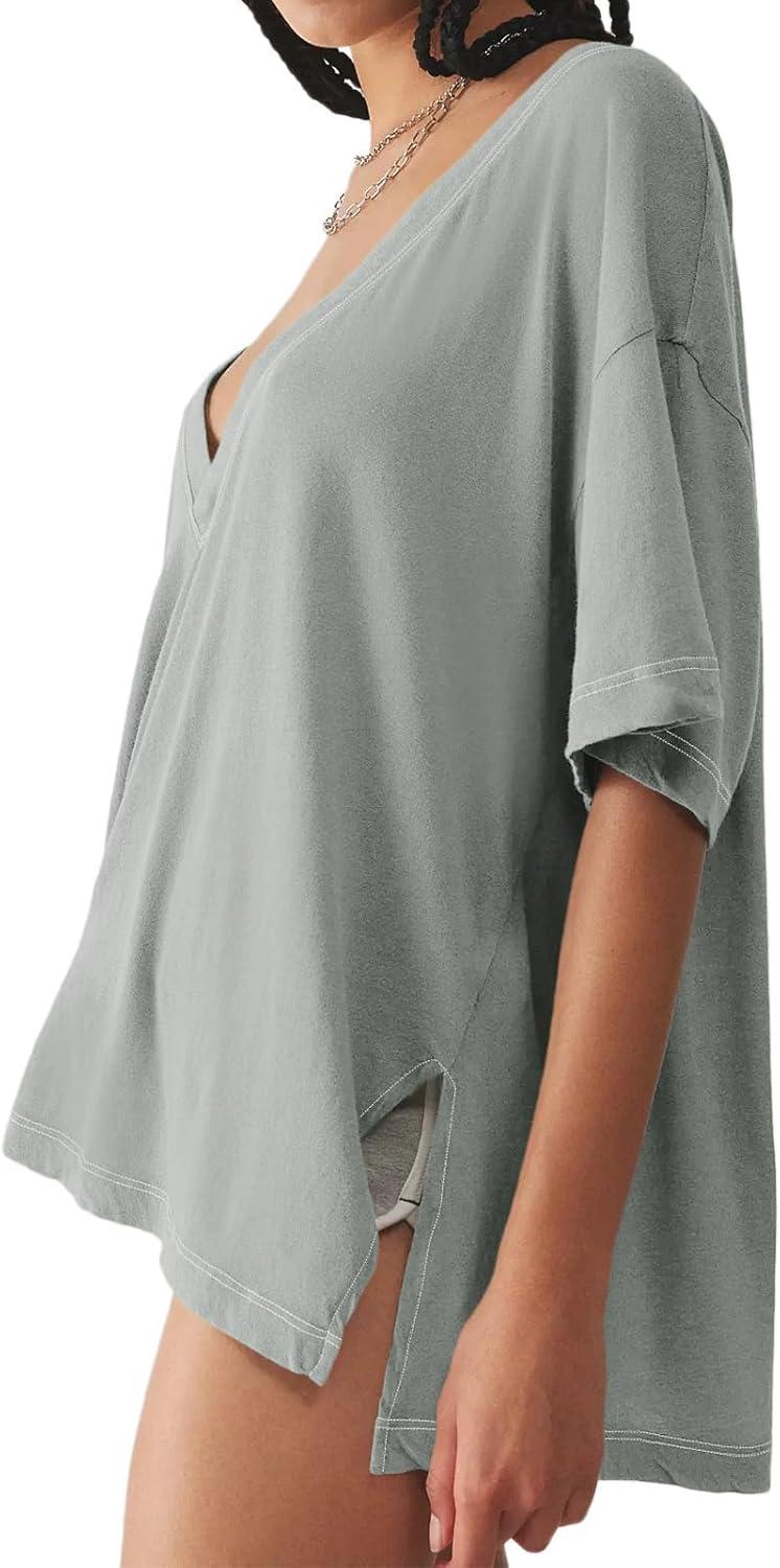 Tankaneo Womens Oversized Tshirts Deep V Neck Short Sleeve Tops Summer Casual Loose Fit Side Slit Tunic Shirts(Grey)