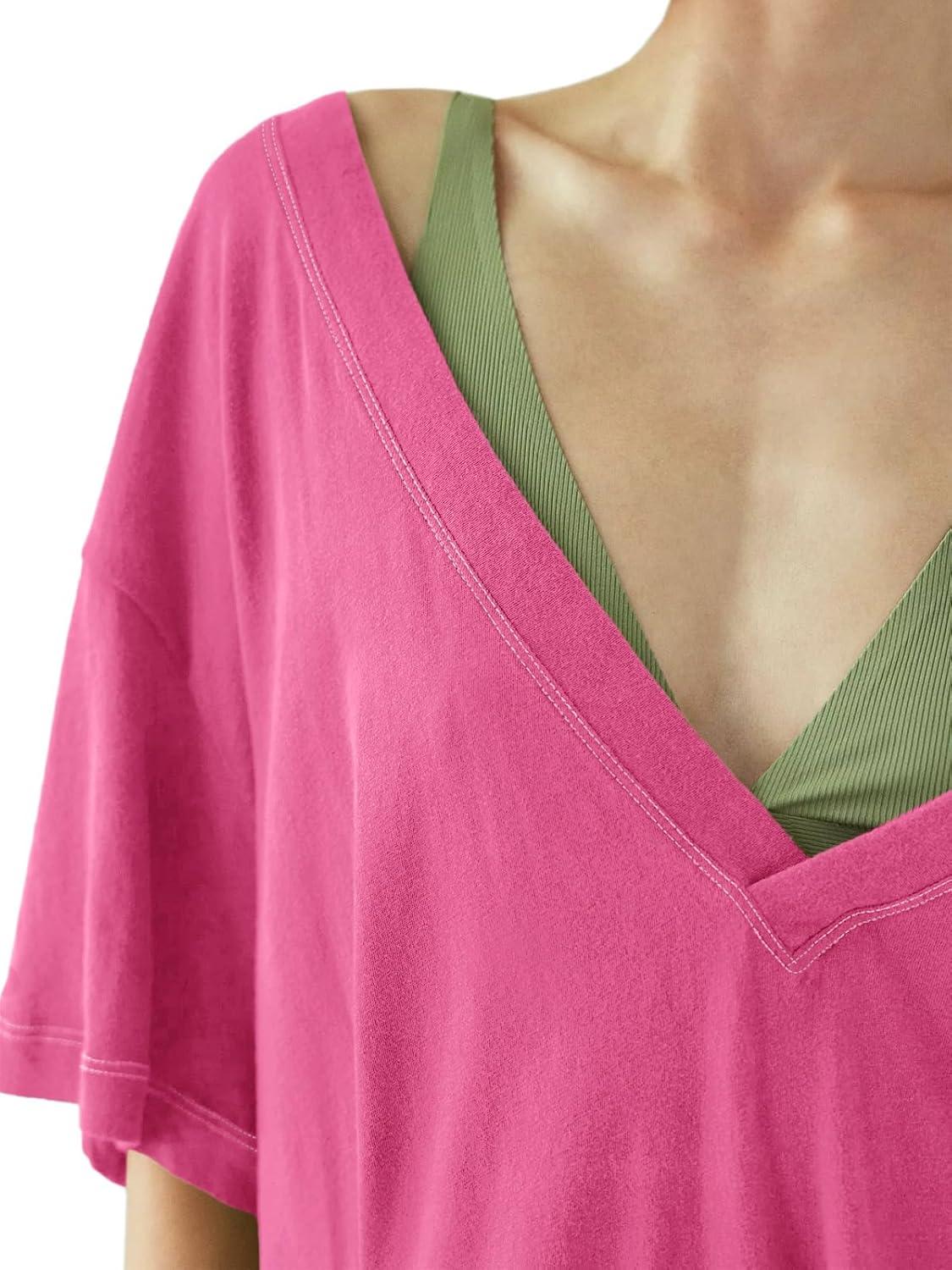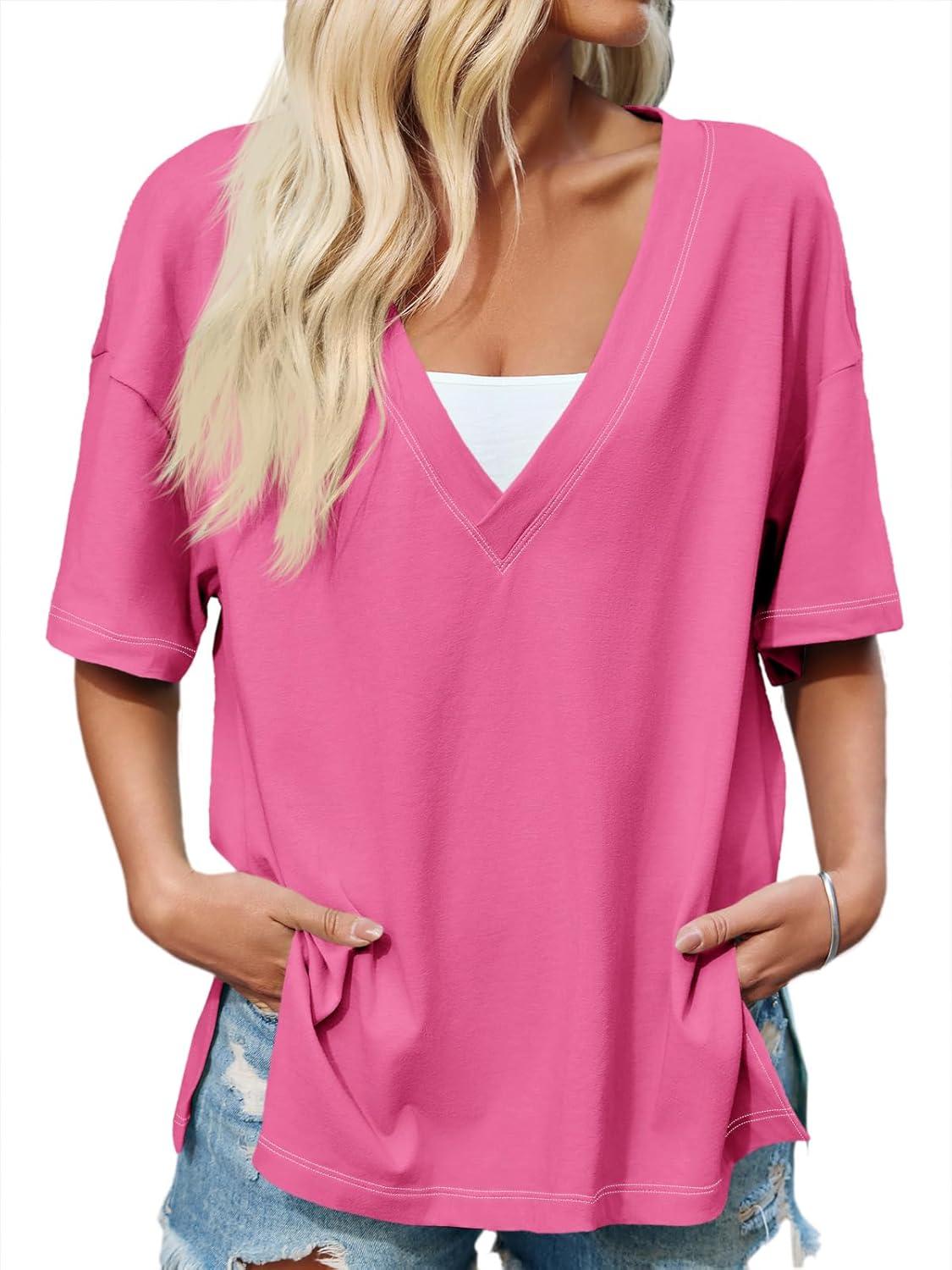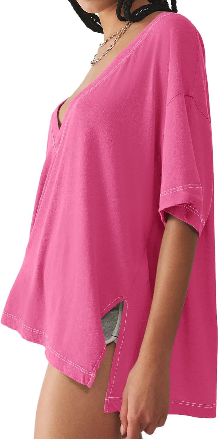 Tankaneo Womens Oversized Tshirts Deep V Neck Short Sleeve Tops Summer Casual Loose Fit Side Slit Tunic Shirts(Rose Red)