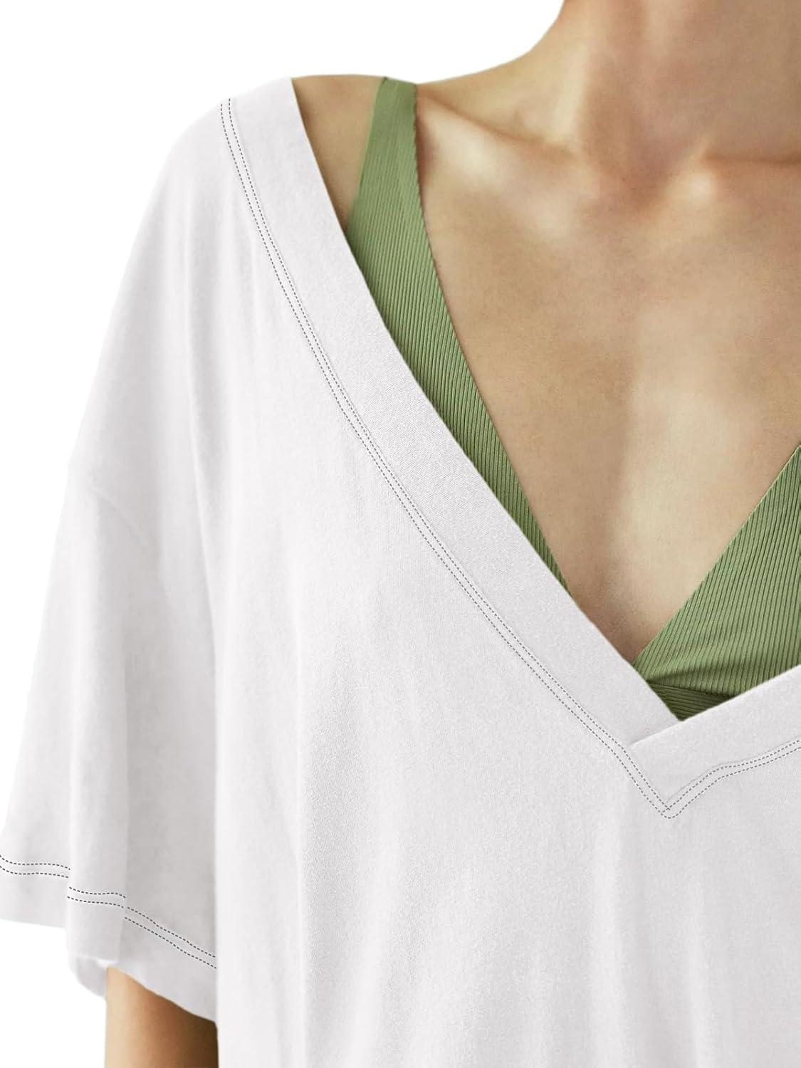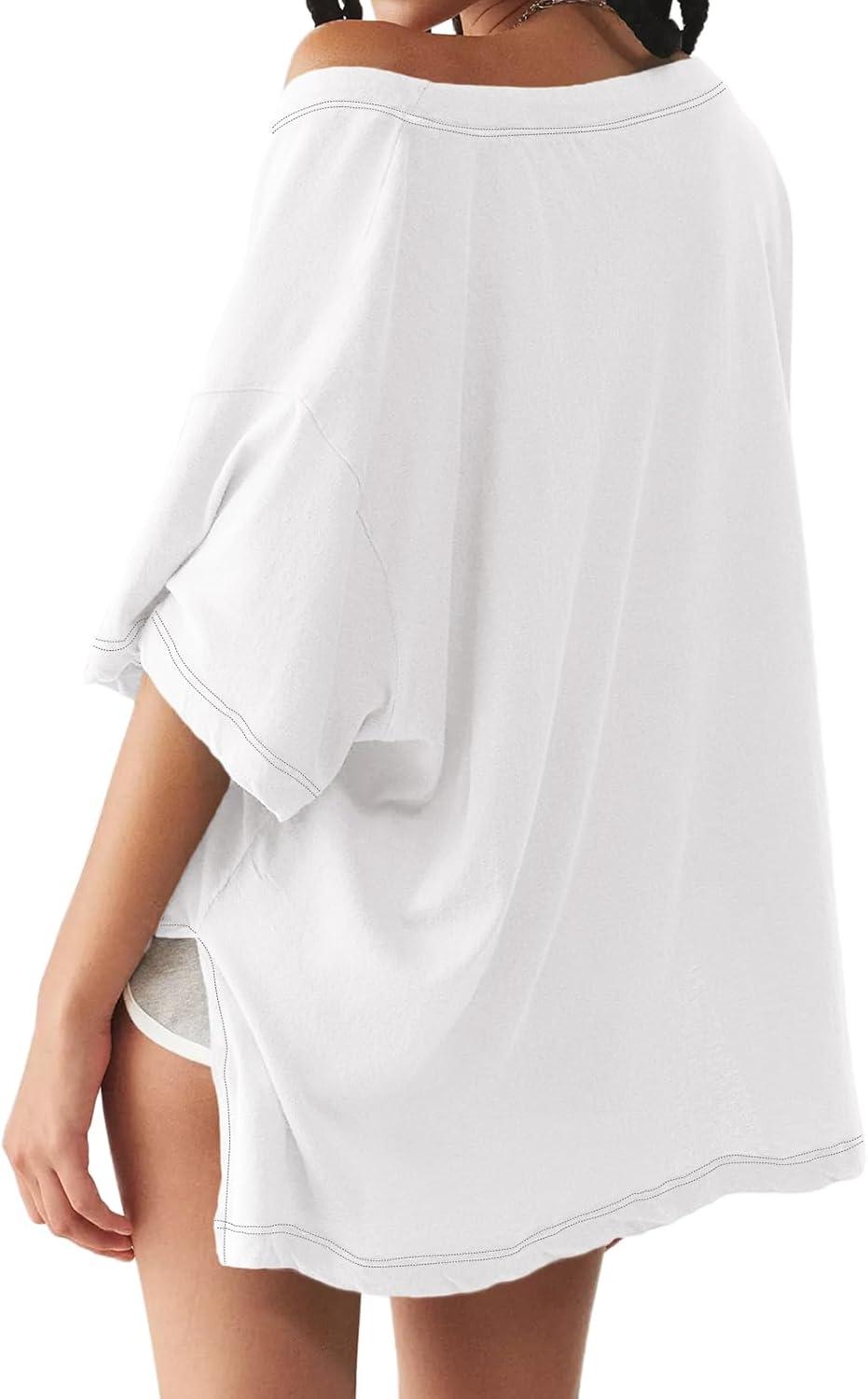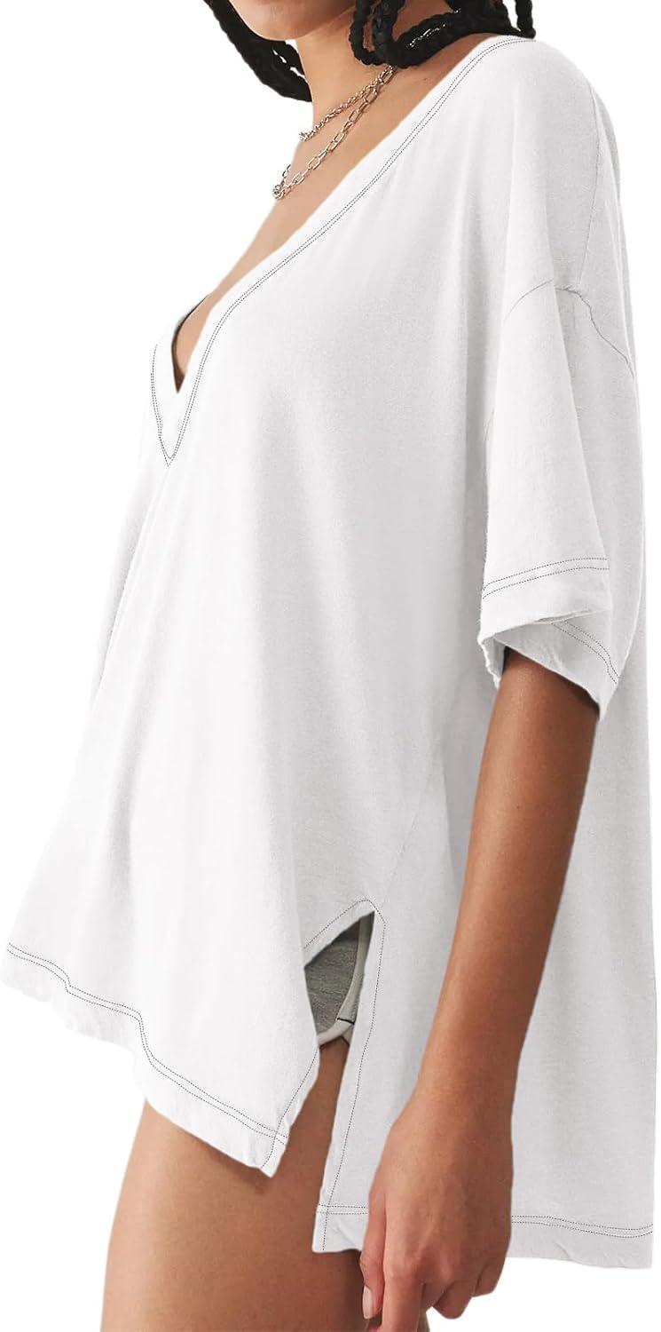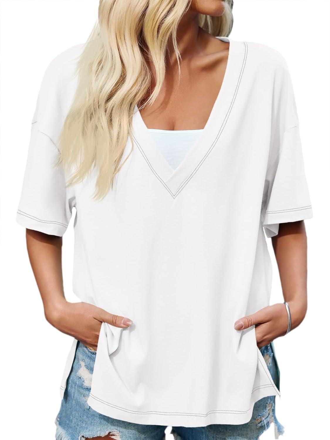 Tankaneo Womens Oversized Tshirts Deep V Neck Short Sleeve Tops Summer Casual Loose Fit Side Slit Tunic Shirts(White)