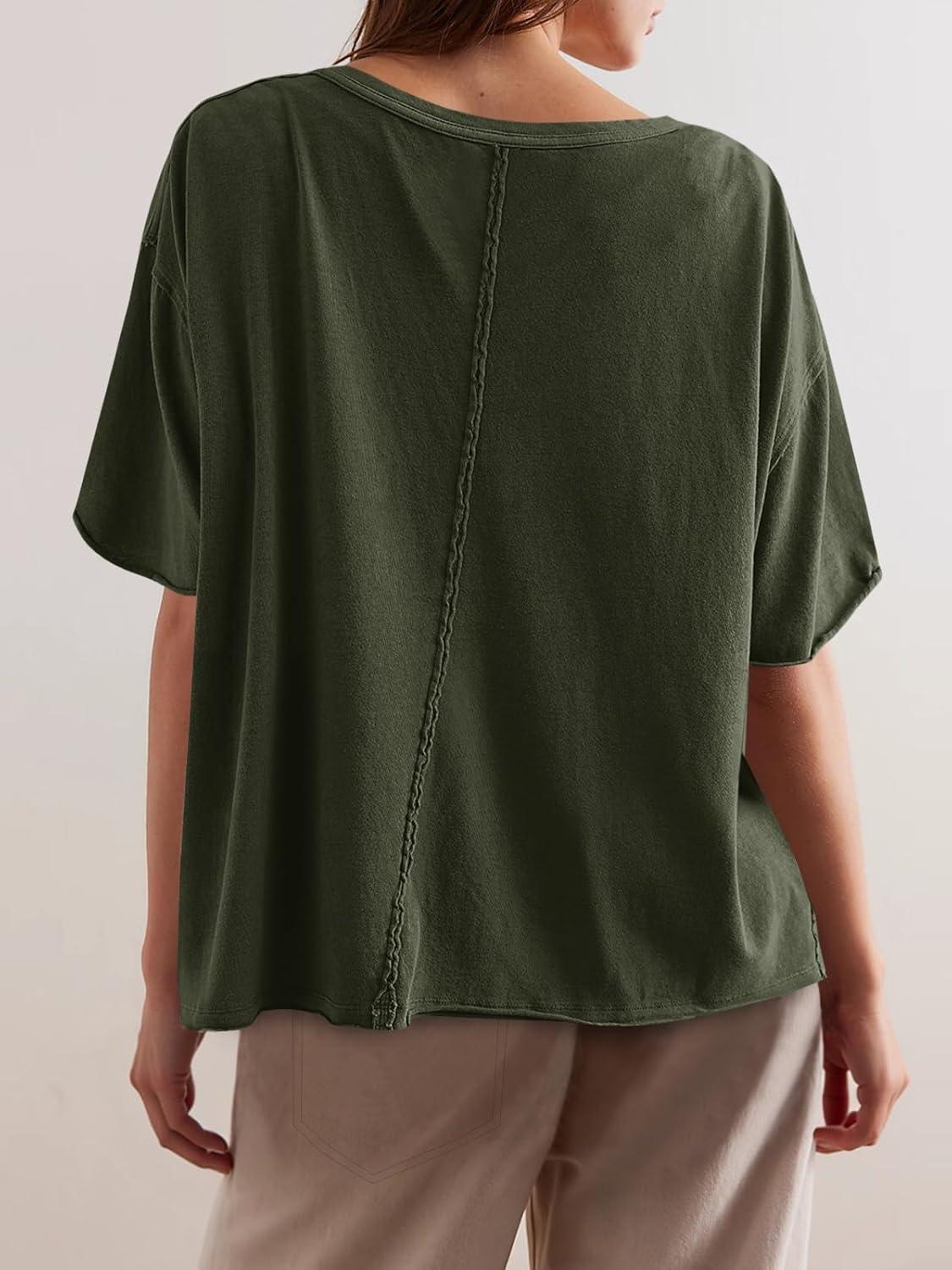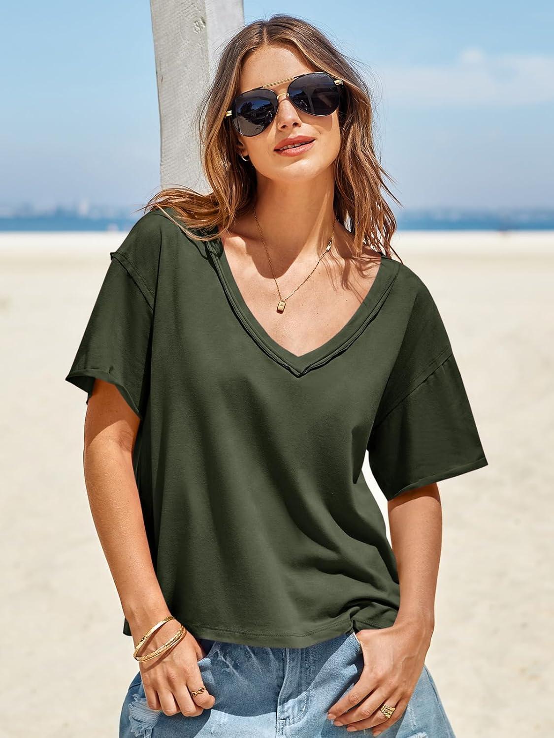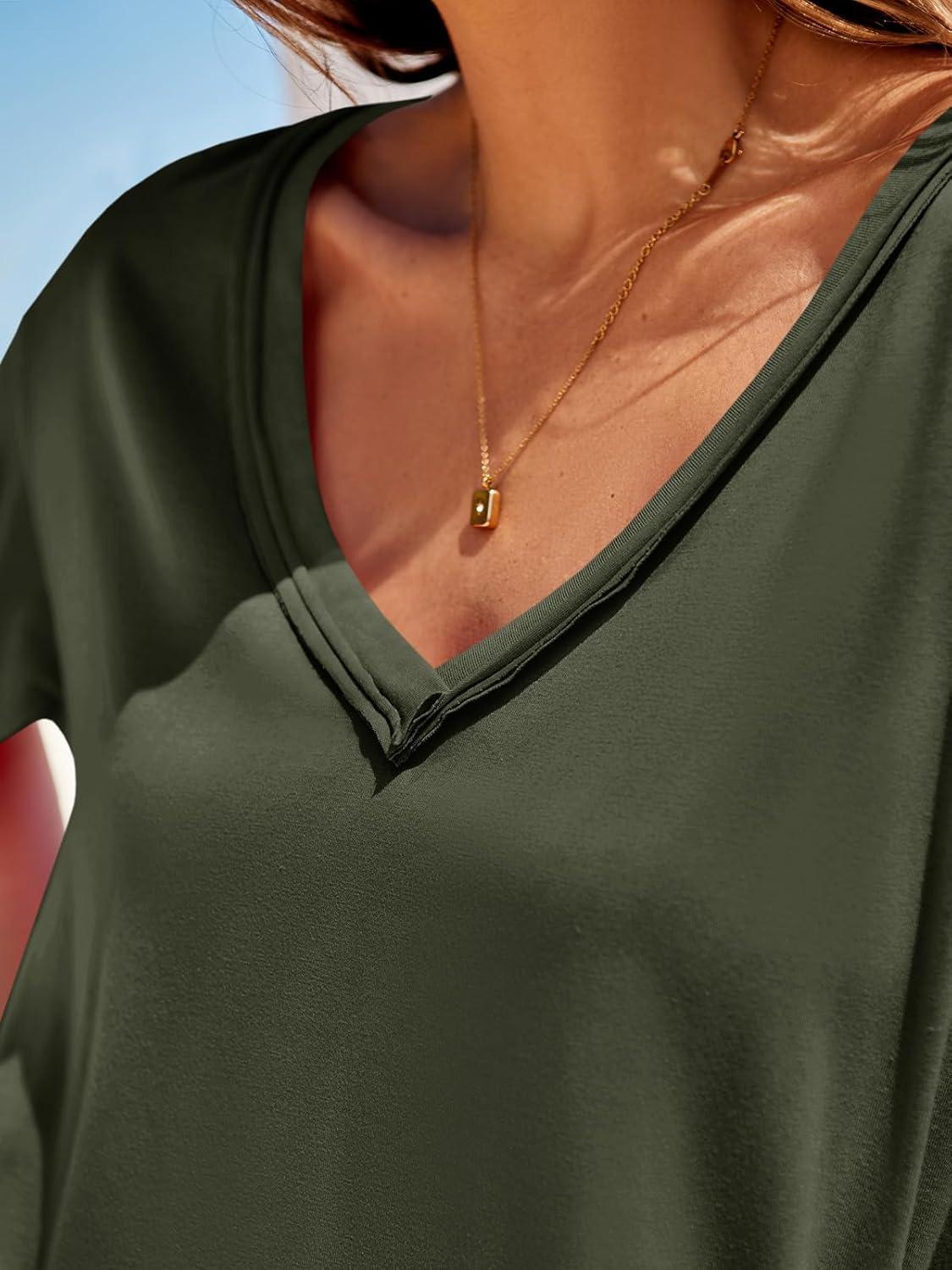 Tankaneo Womens Oversized Tshirts Deep V Neck Short Sleeve Tops Summer Casual Loose Fit Tunic Tee Shirt(Army Green)