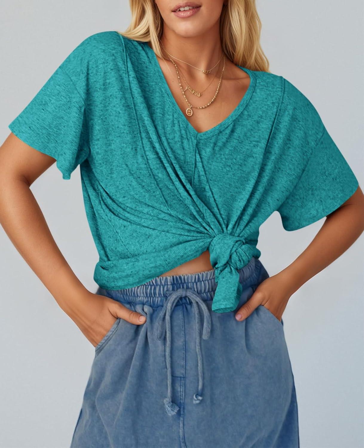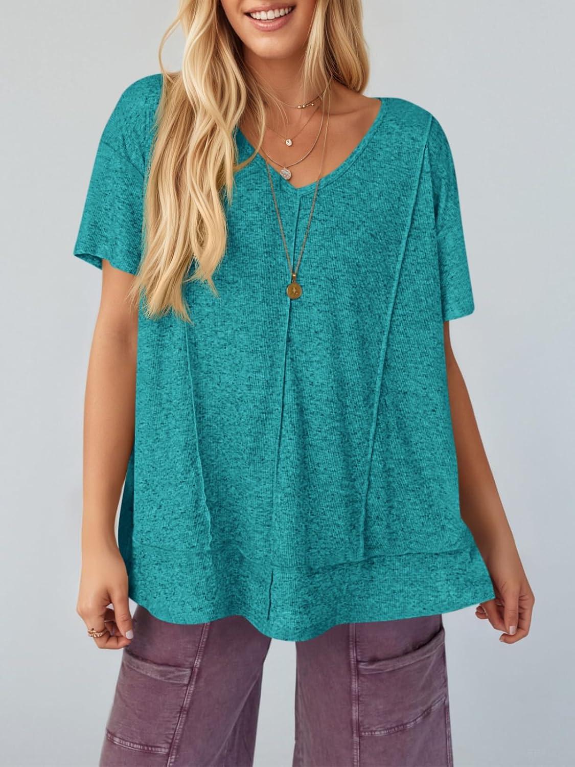 Tankaneo Womens Oversized Tshirts Knit V Neck Short Sleeve Tunic Tops Summer Casual Loose Fit Tee Shirts(Lake Blue)