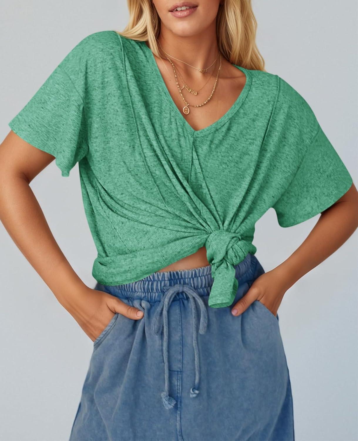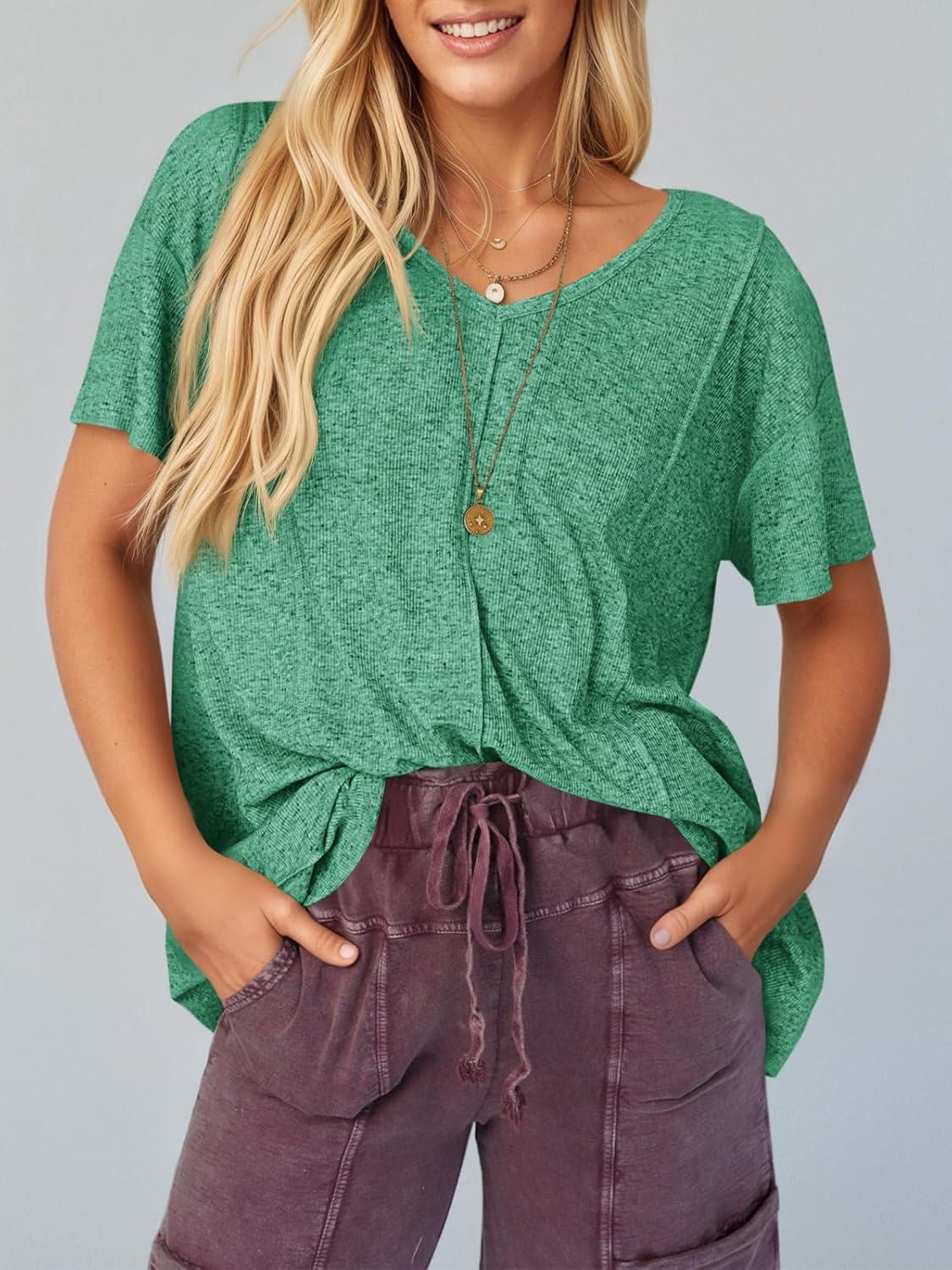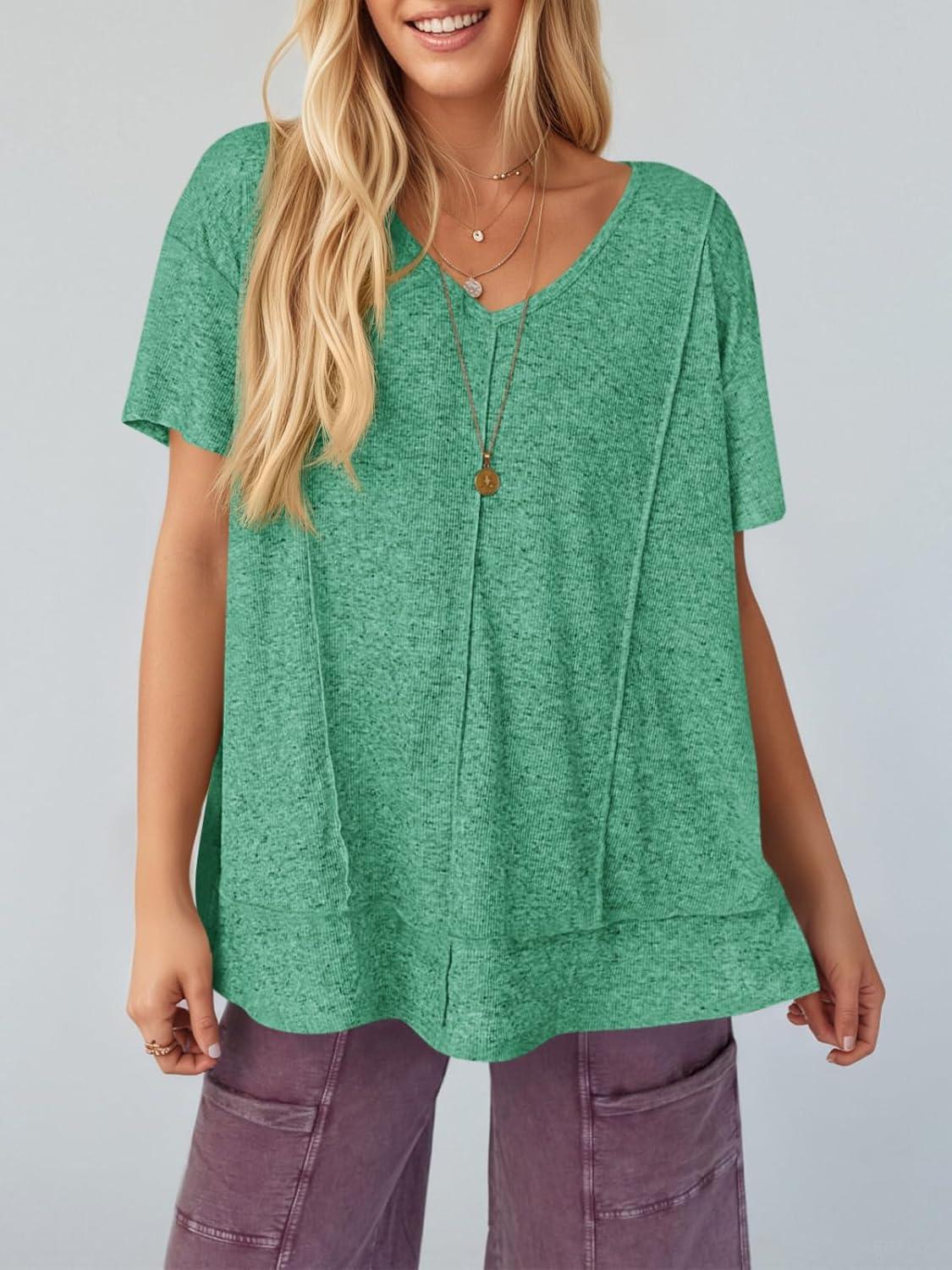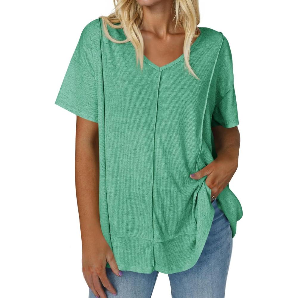 Tankaneo Womens Oversized Tshirts Knit V Neck Short Sleeve Tunic Tops Summer Casual Loose Fit Tee Shirts(Lake Green)