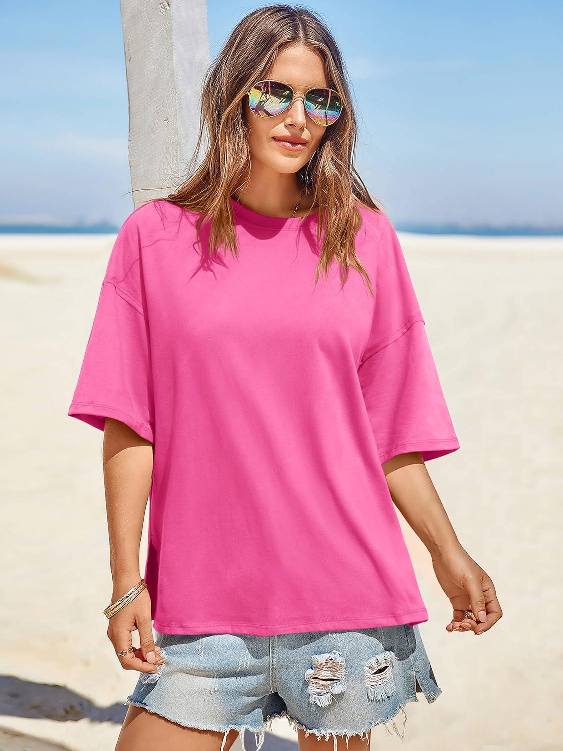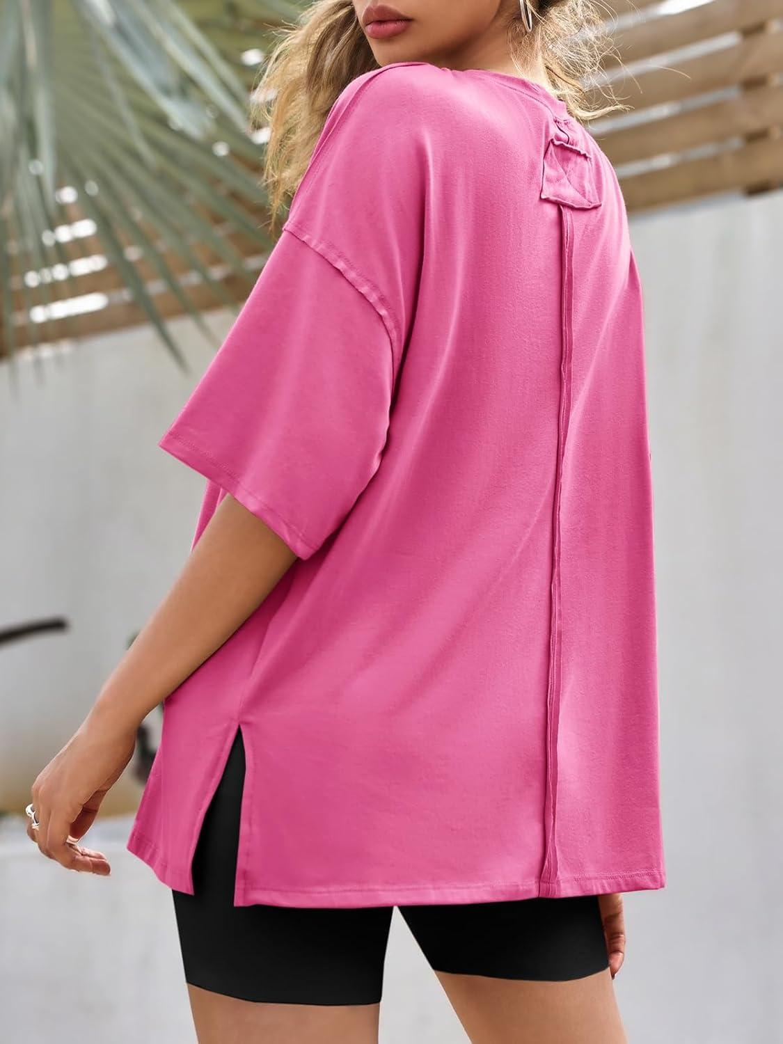 Tankaneo Womens Oversized Tshirts Summer Casual Short Sleeve Crew Neck T Shirt Loose Fit Side Slit Tee Tops(Rose Red)