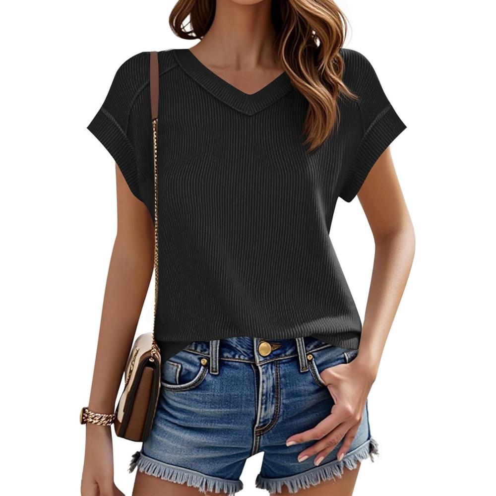 Tankaneo Womens Oversized V Neck Tshirts Summer Ribbed Knit Short Sleeve Tunic Tops Casual Loose Fit Tee Shirts(Black)