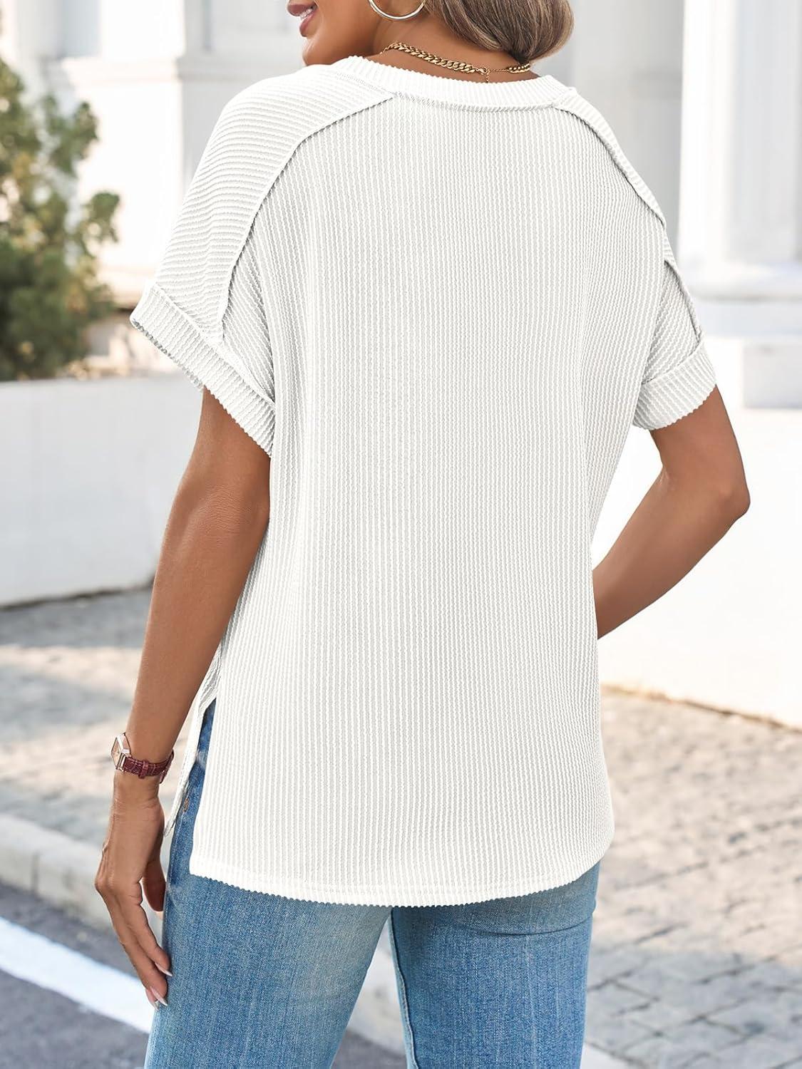 Tankaneo Womens Oversized V Neck Tshirts Summer Ribbed Knit Short Sleeve Tunic Tops Casual Loose Fit Tee Shirts(White)