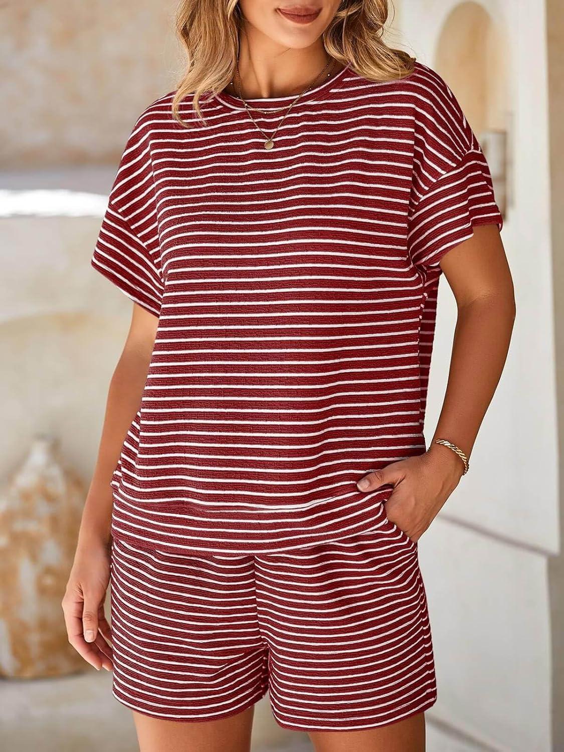 Tankaneo Womens Pajama Sets Striped 2 Piece Lounge Sets Short Sleeve Oversized T Shirts Drawstring Shorts Matching Set(Burgundy)