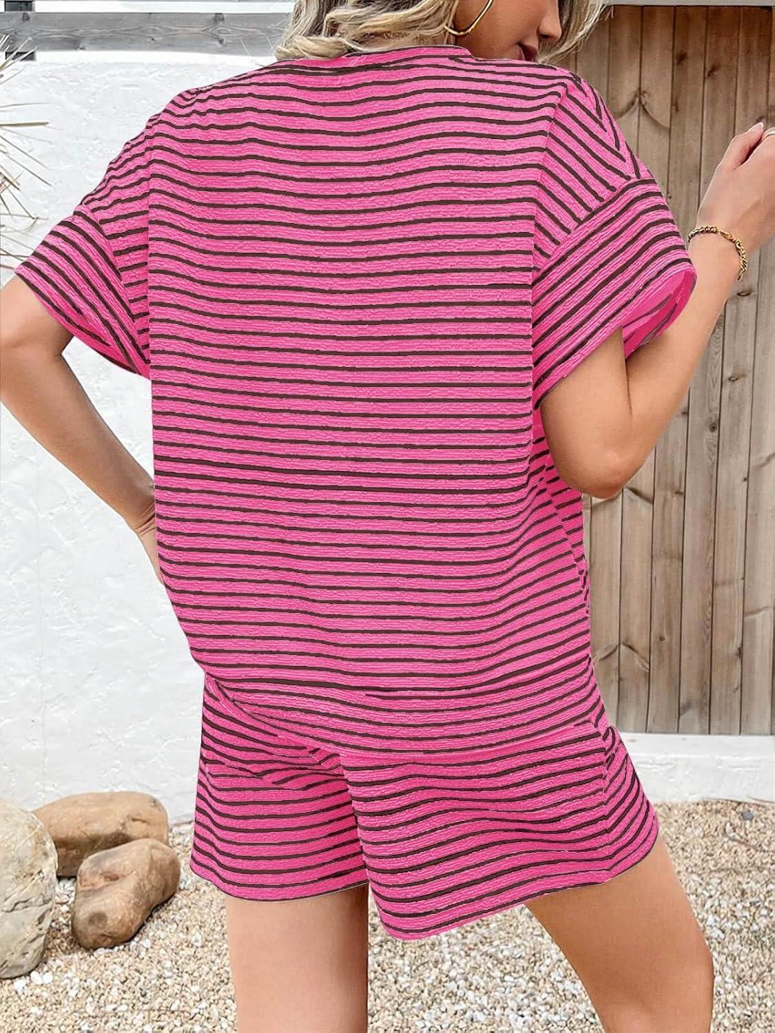 Tankaneo Womens Pajama Sets Striped 2 Piece Lounge Sets Short Sleeve Oversized T Shirts Drawstring Shorts Matching Set(Hot Pink)