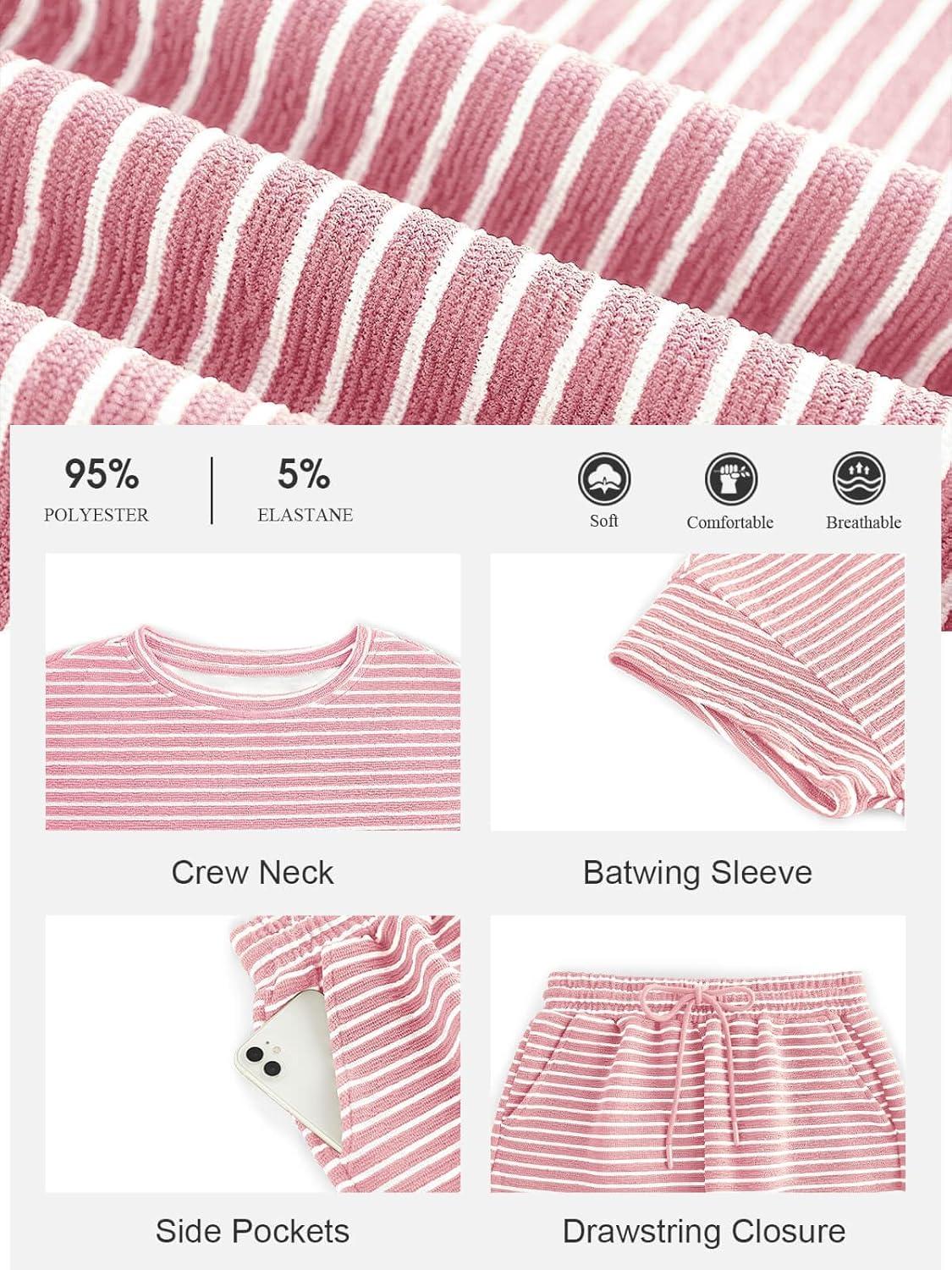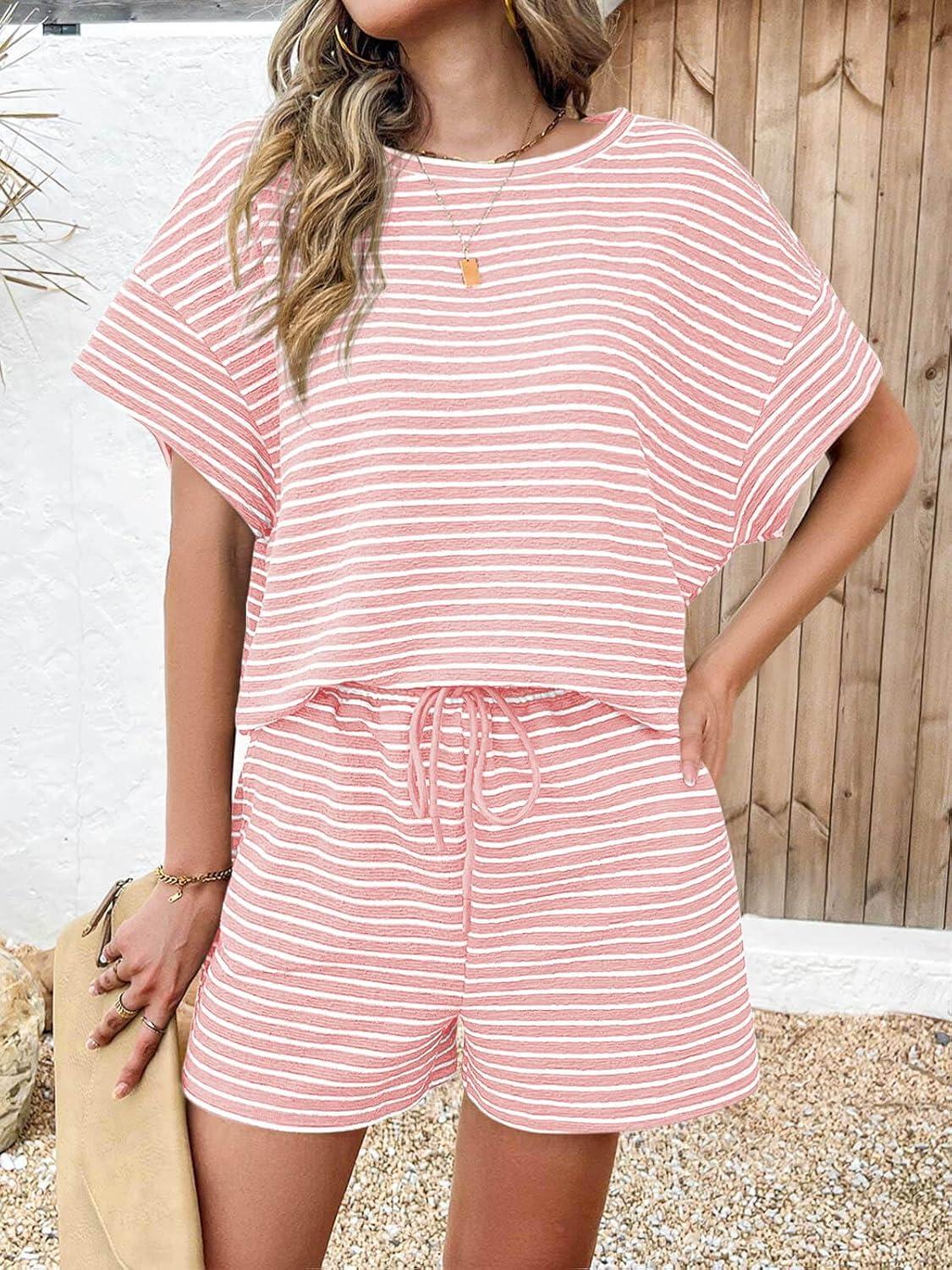 Tankaneo Womens Pajama Sets Striped 2 Piece Lounge Sets Short Sleeve Oversized T Shirts Drawstring Shorts Matching Set(Light Pink)