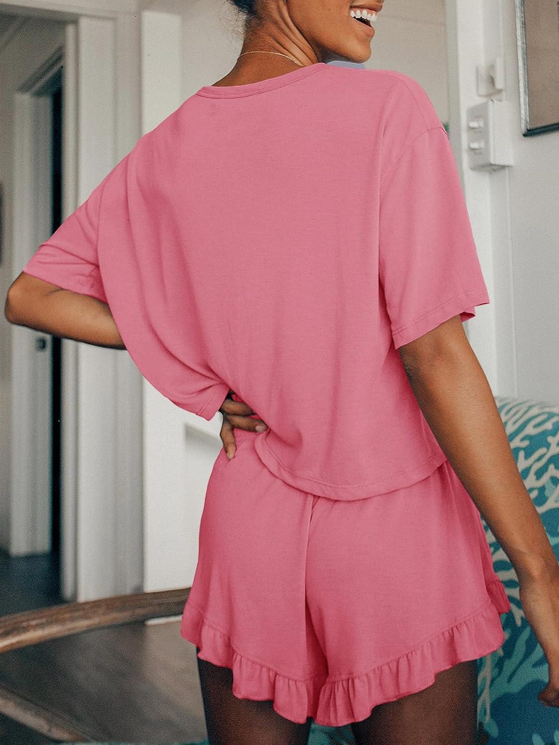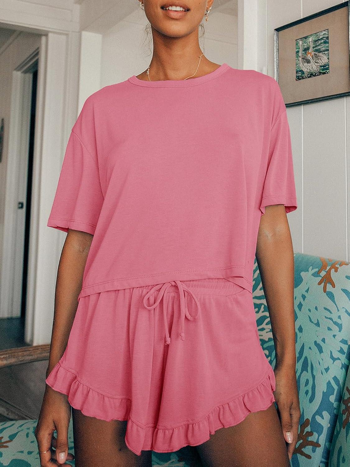 Tankaneo Womens Pajamas Set Lounge Sets Cropped Short Sleeve T Shirts Drawstring Ruffle Shorts Soft Sleepwear(Pink)