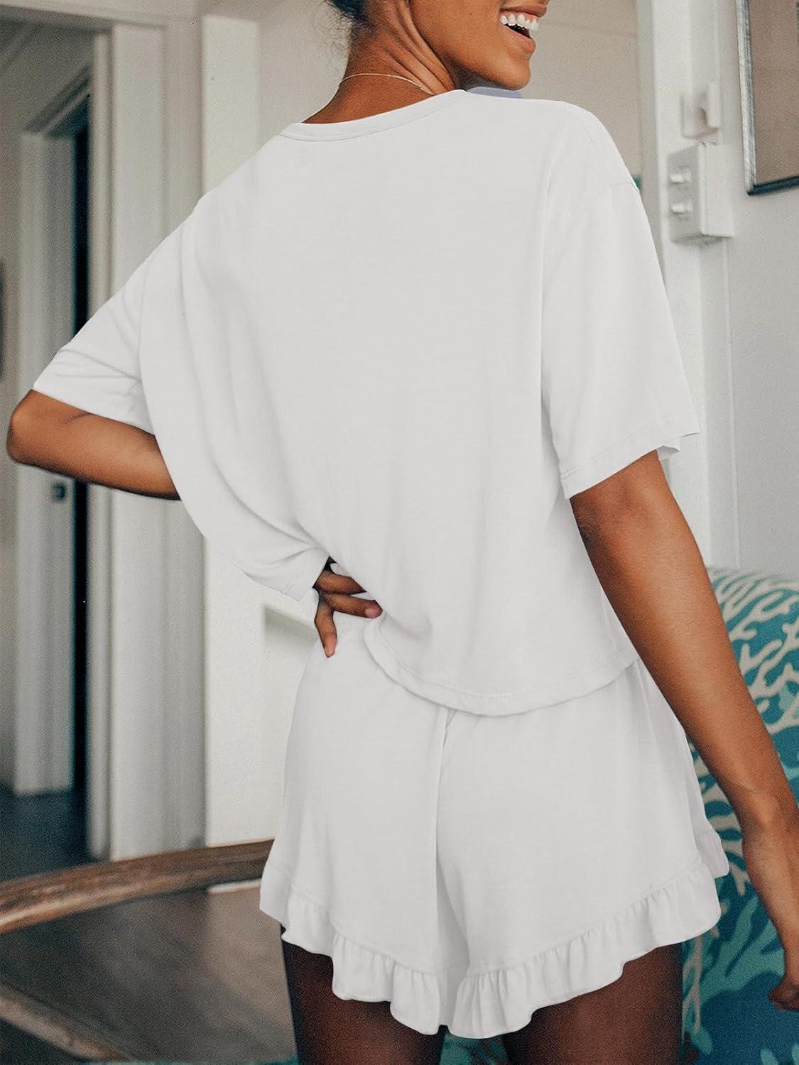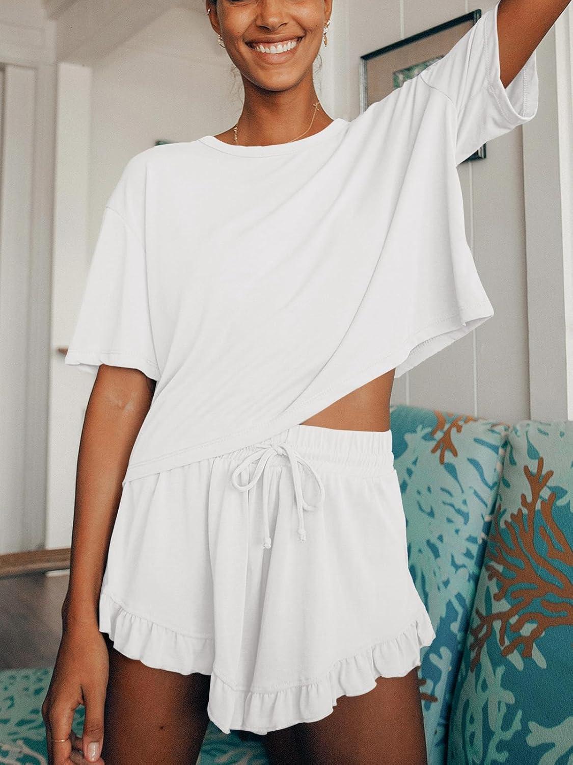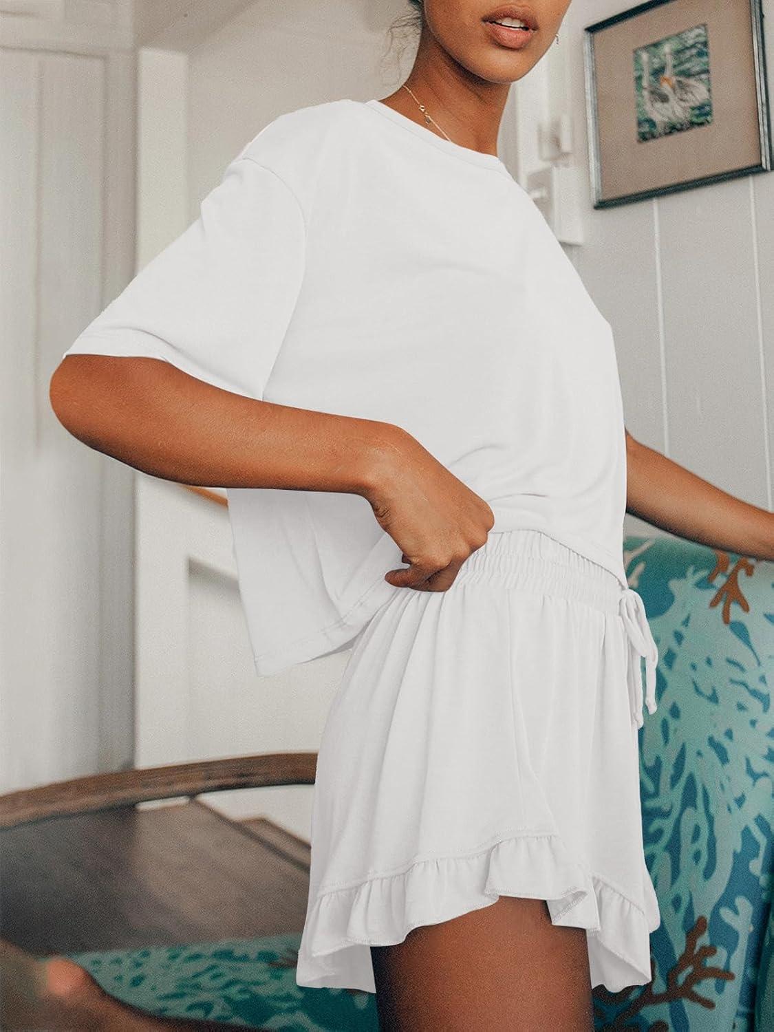 Tankaneo Womens Pajamas Set Lounge Sets Cropped Short Sleeve T Shirts Drawstring Ruffle Shorts Soft Sleepwear(White)
