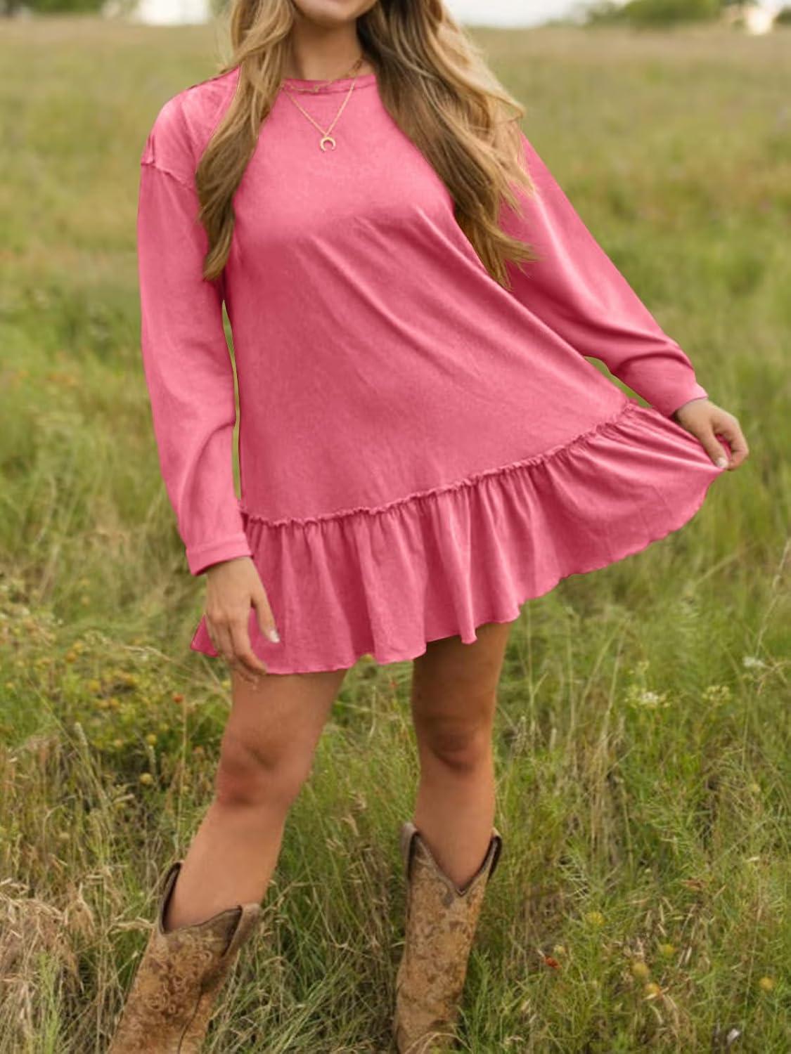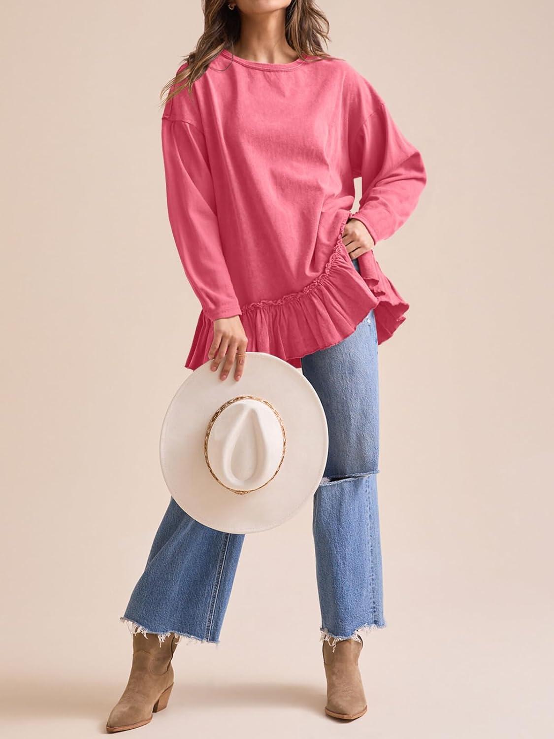 Tankaneo Womens Peplum Babydoll Tops Oversized Tshirt Casual Long Sleeve Pleated Shirts Crew Neck Flowy Loose Fit Tunic Tees(Pink)