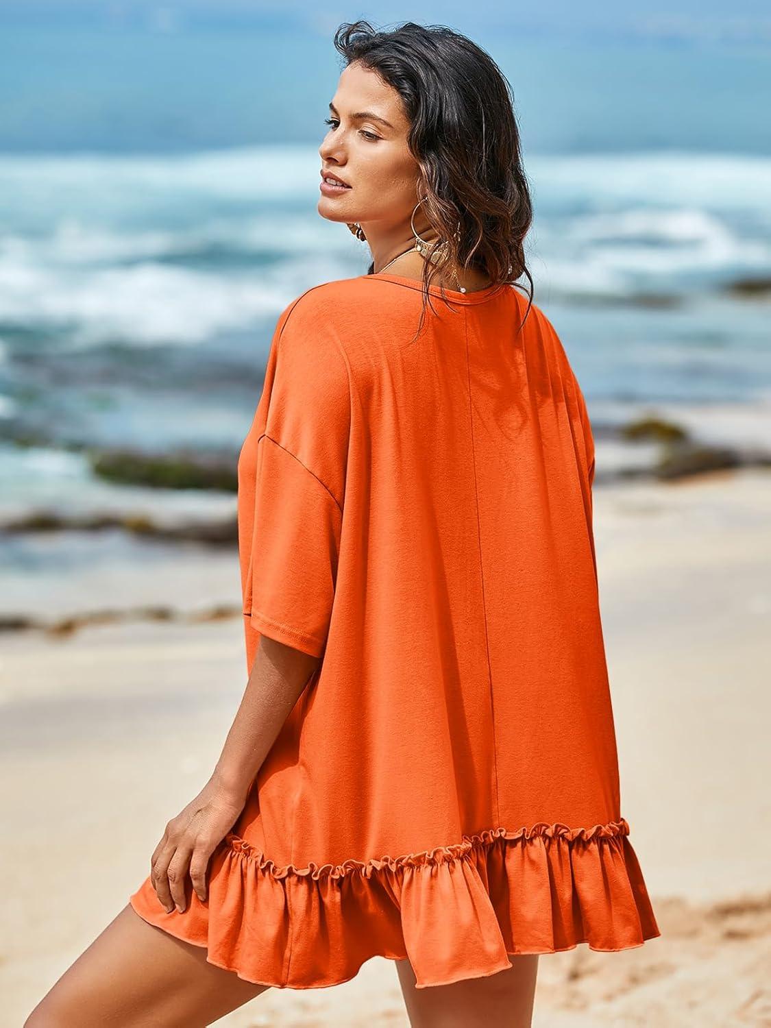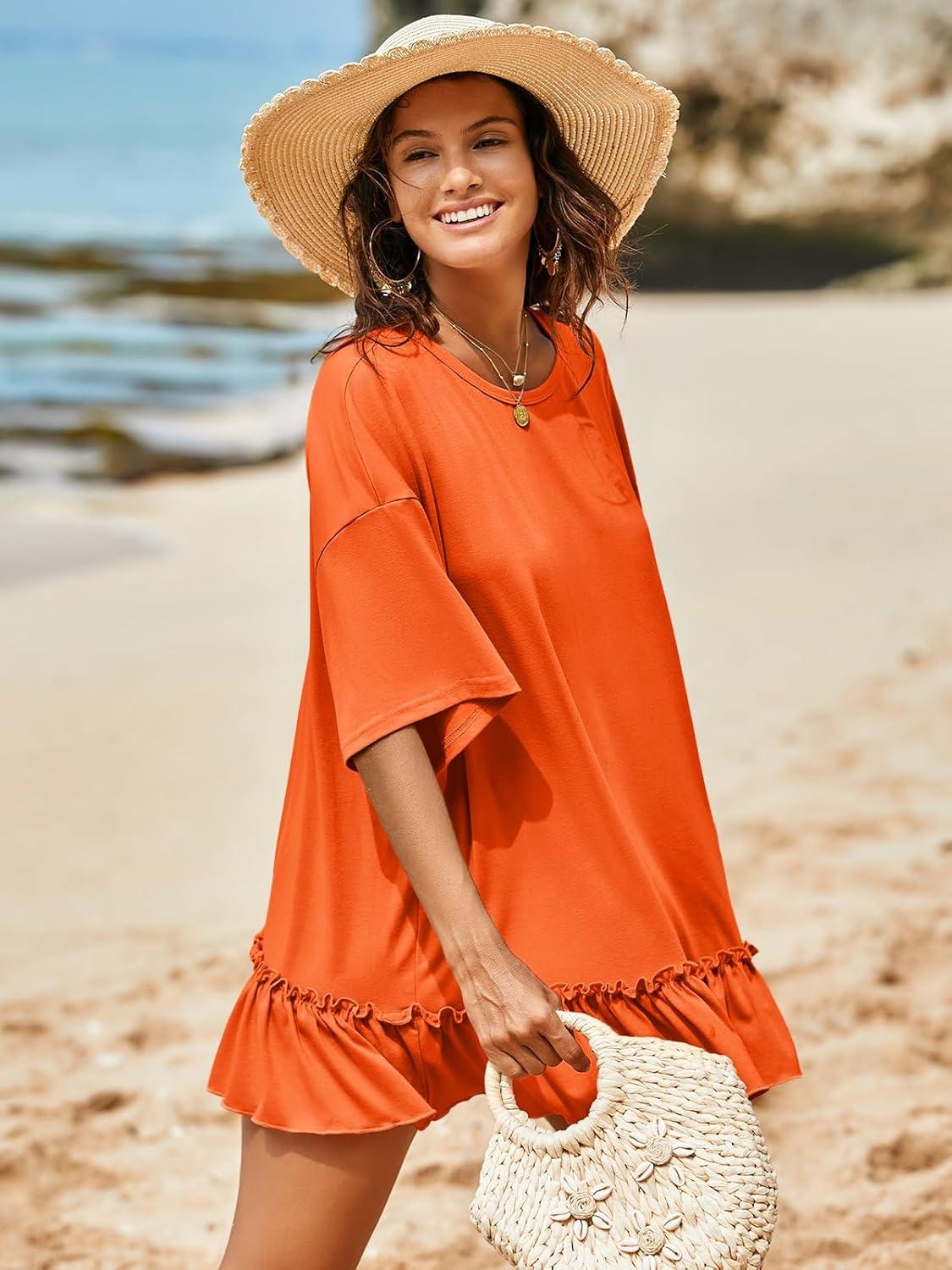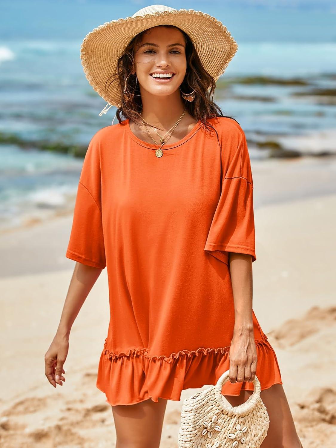 Tankaneo Womens Peplum Oversized Tshirt Summer Flowy Casual Shirt Dress Crew Neck Pleated Babydoll Beach Tunic Tops(Orange)