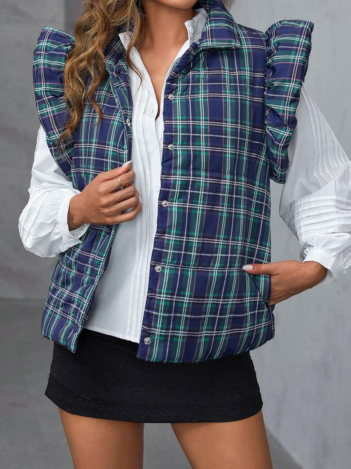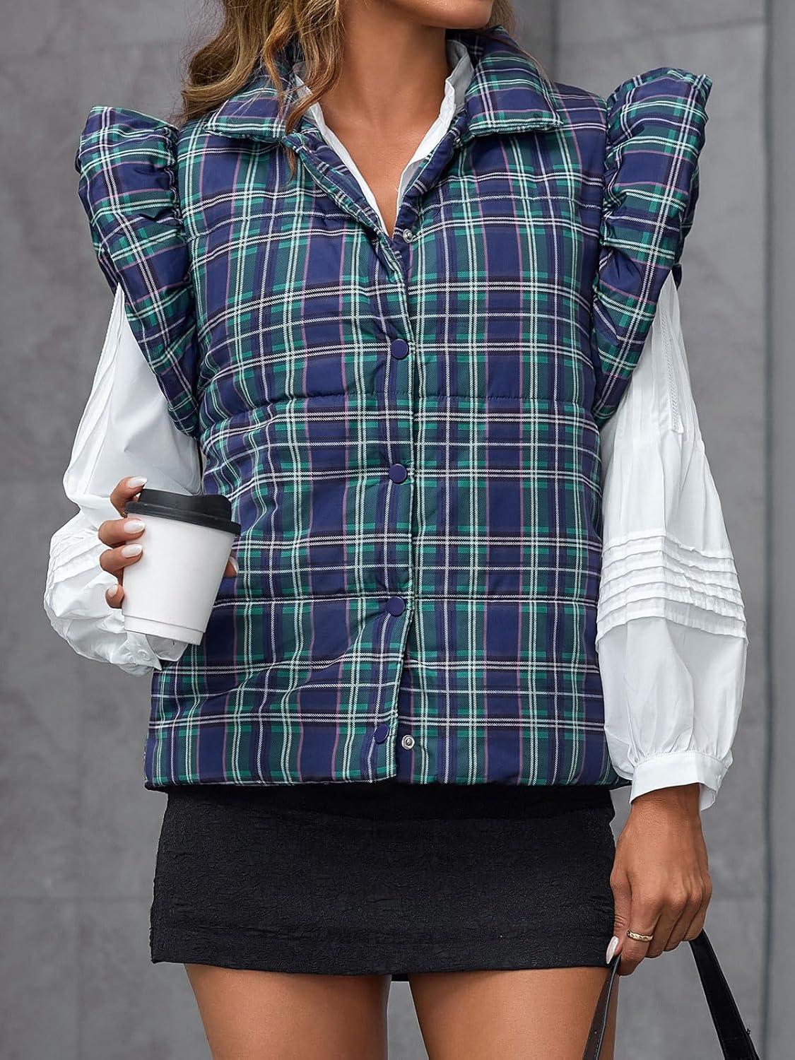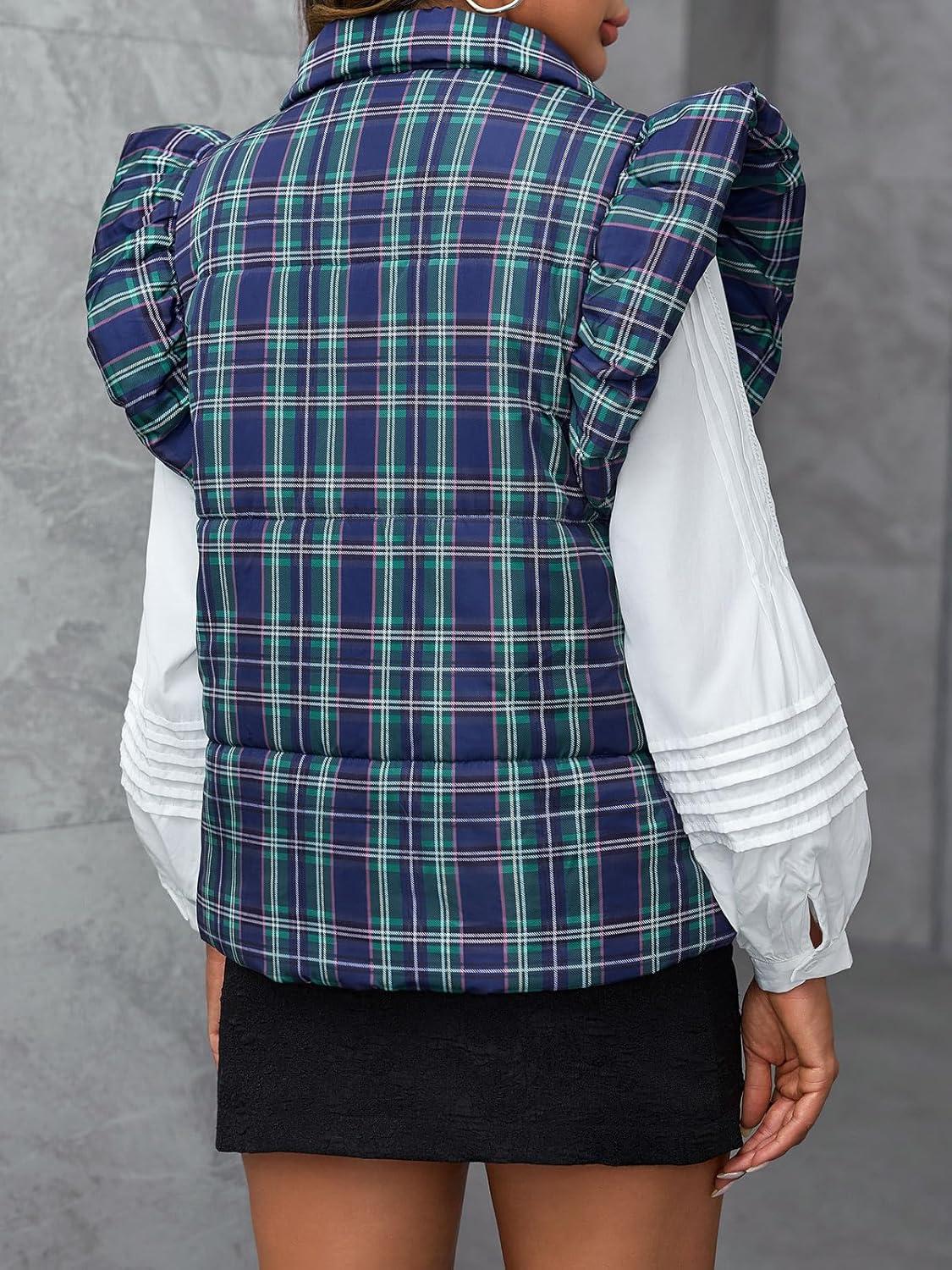 Tankaneo Womens Plaid Puffer Vests Ruffle Sleeveless Lightweight Quilted Vest Fall Winter Padded Gilets Coats(Green)