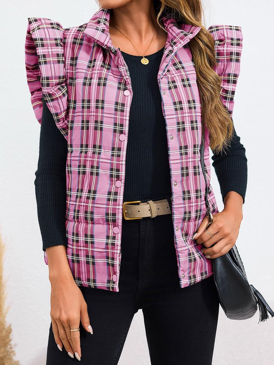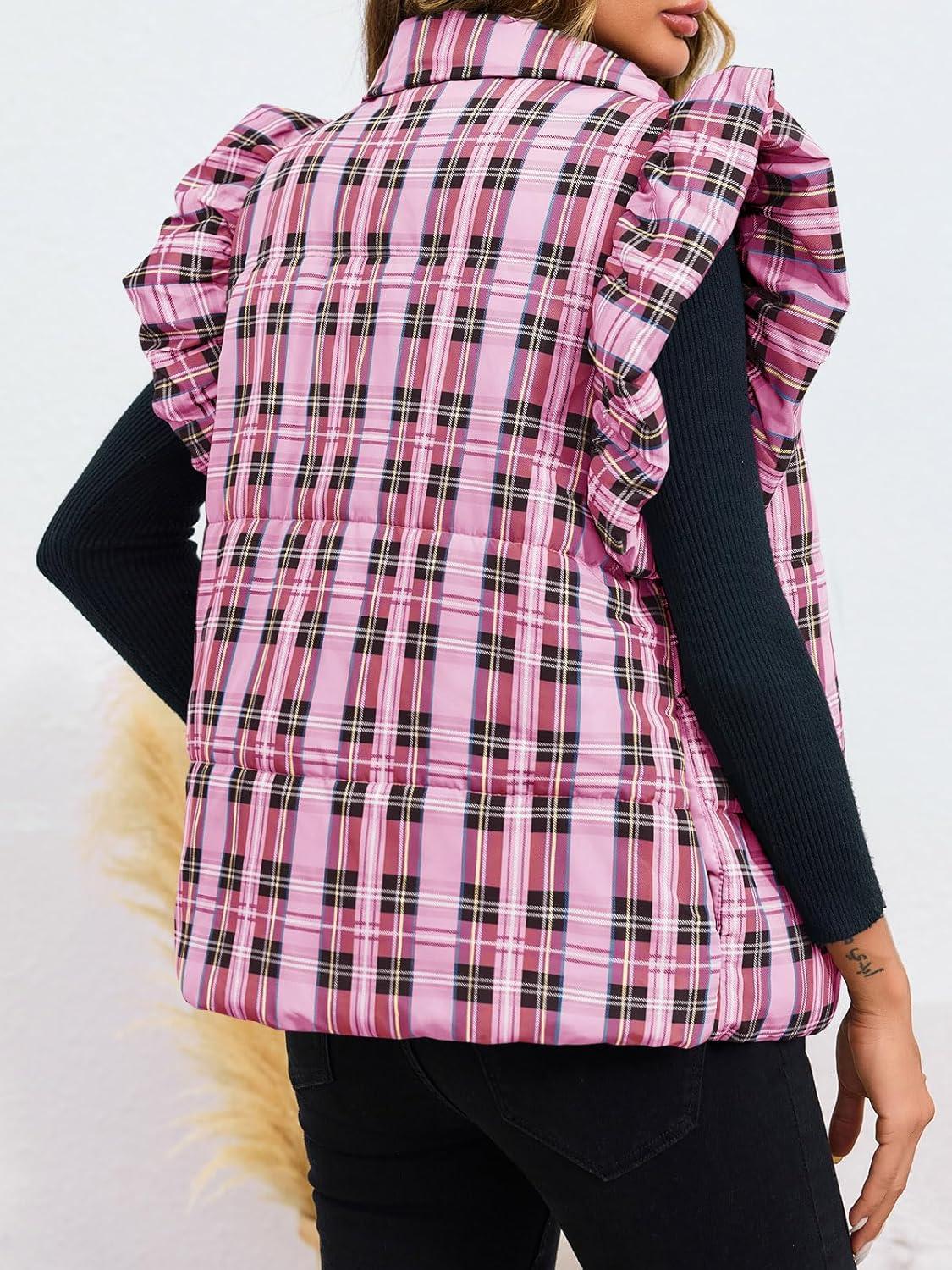 Tankaneo Womens Plaid Puffer Vests Ruffle Sleeveless Lightweight Quilted Vest Fall Winter Padded Gilets Coats(Pink)