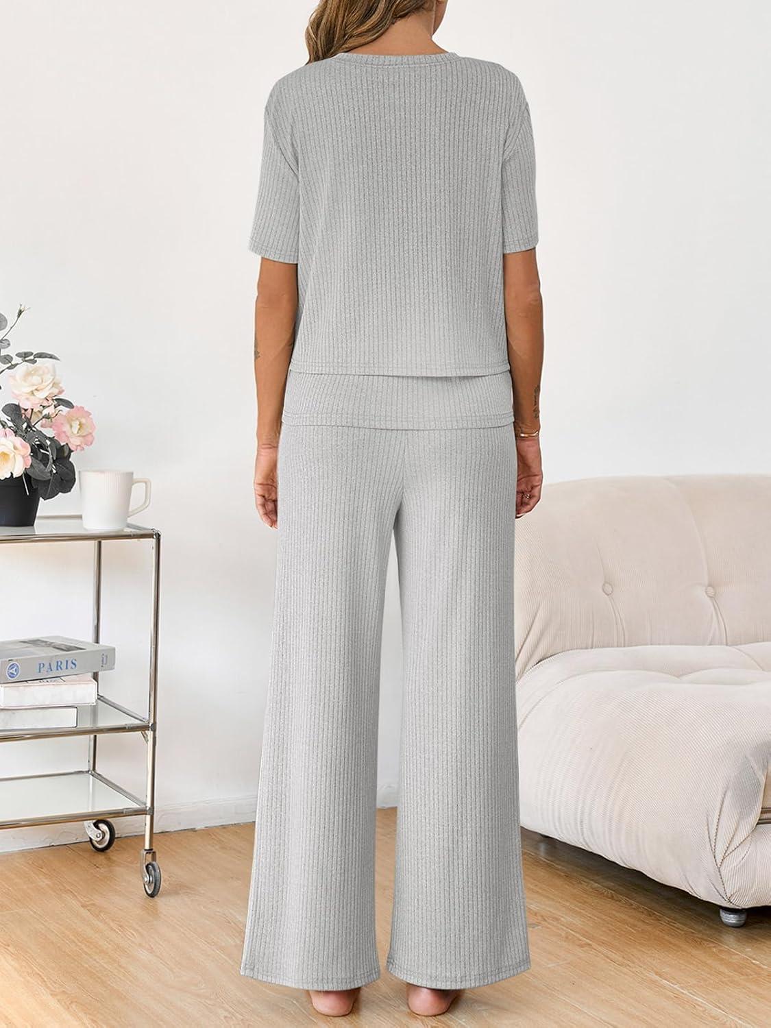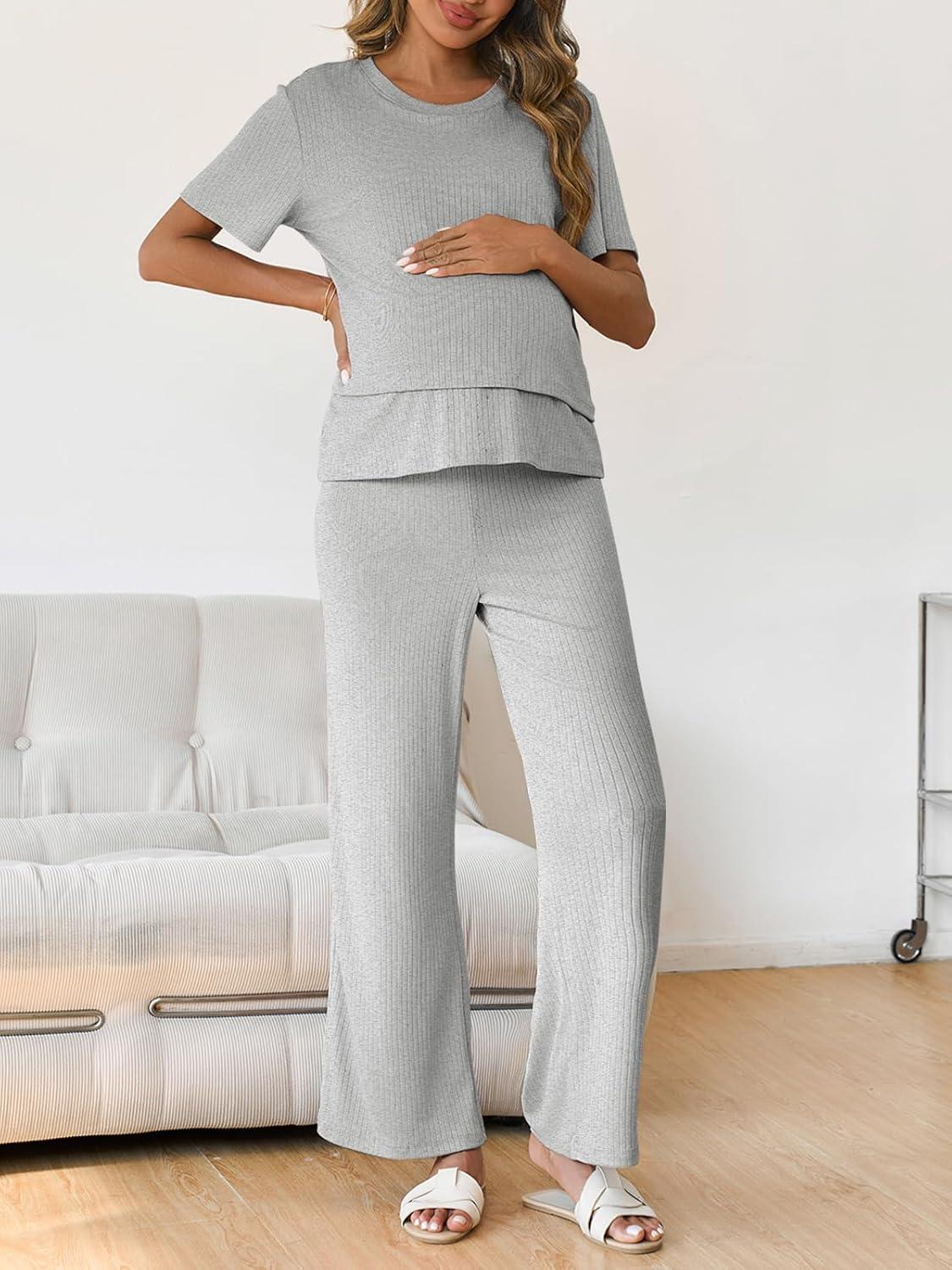Tankaneo Womens Postpartum Maternity Pajamas 2 Piece Sets Rib Short Sleeve Nursing Tops and Elastic Waist Pants Loungewear(Grey)