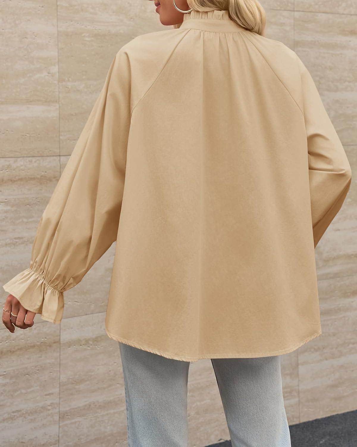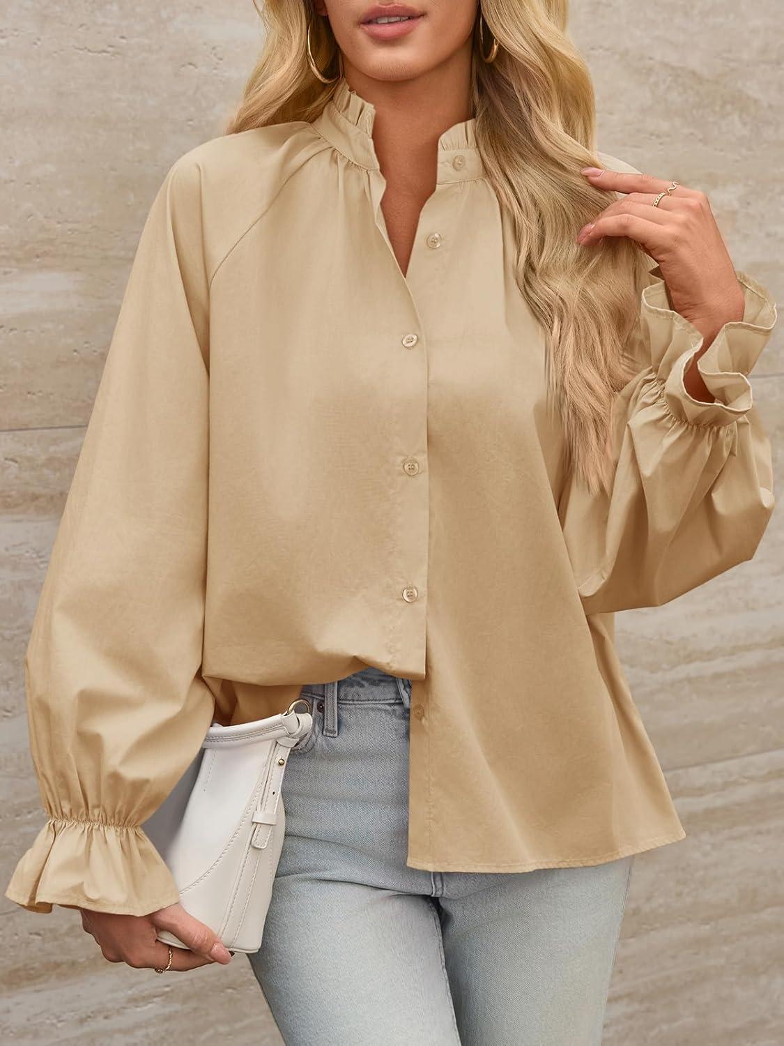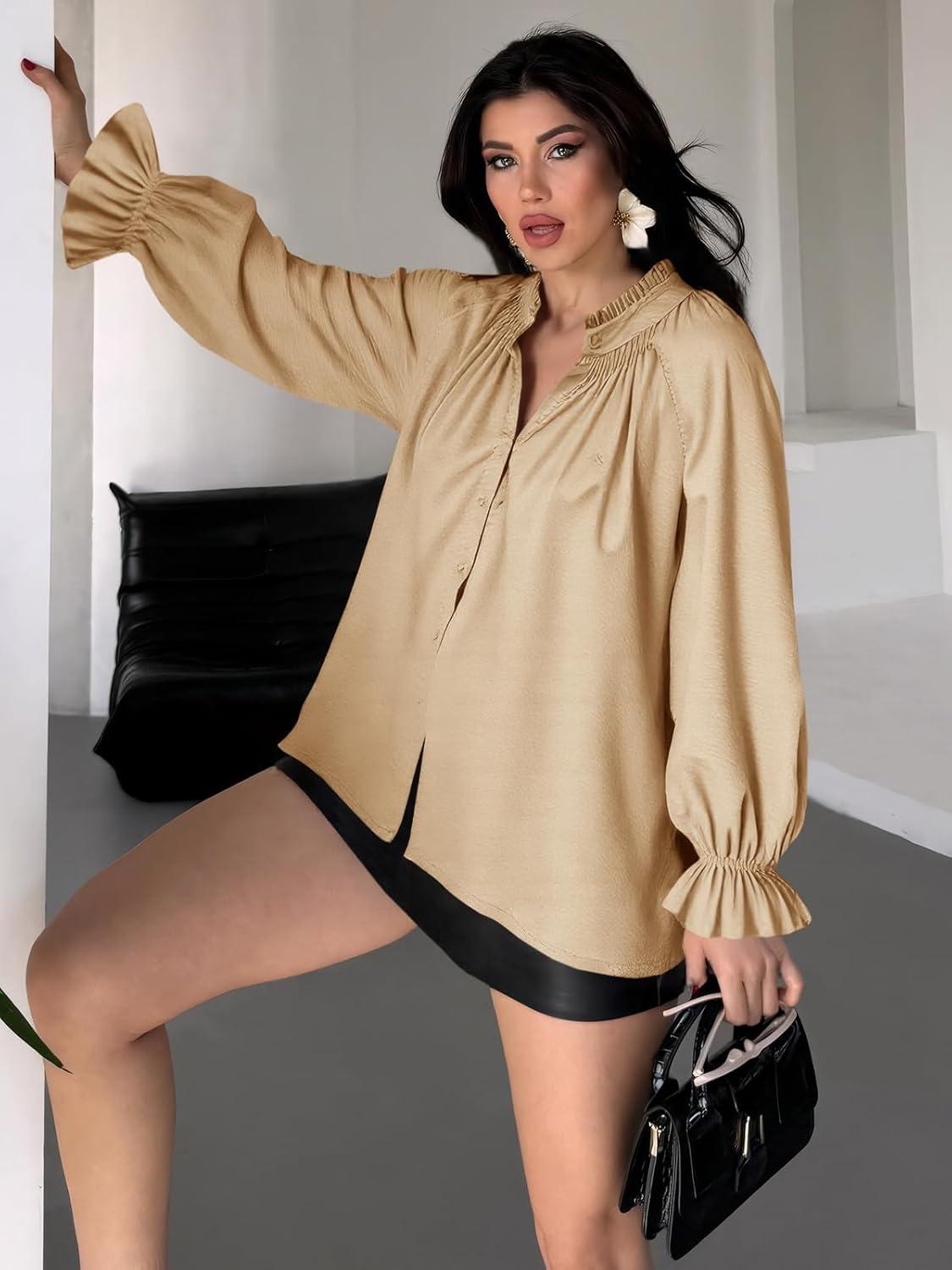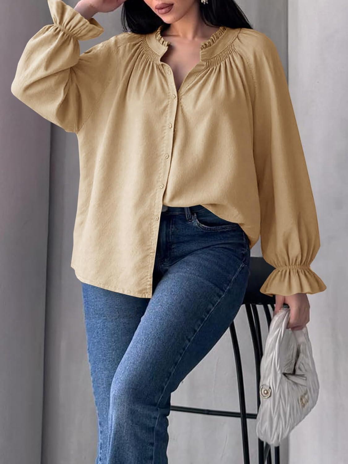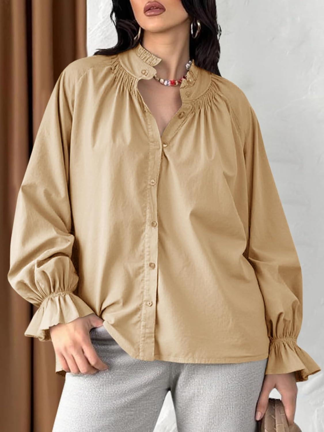 Tankaneo Womens Puff Long Sleeve Button Down Shirts Pleated V Neck Cotton Blouses Loose Fit Casual Ruffle Tops(Khaki)