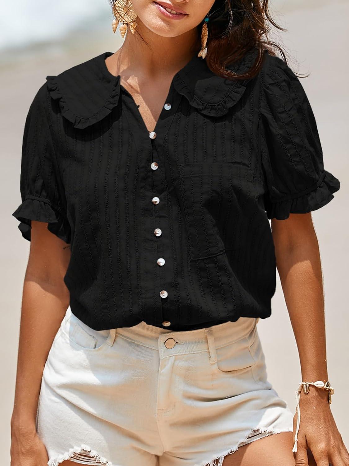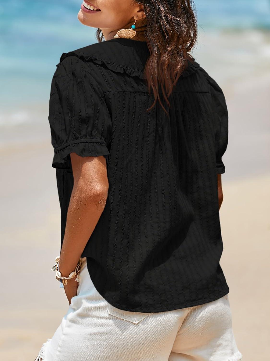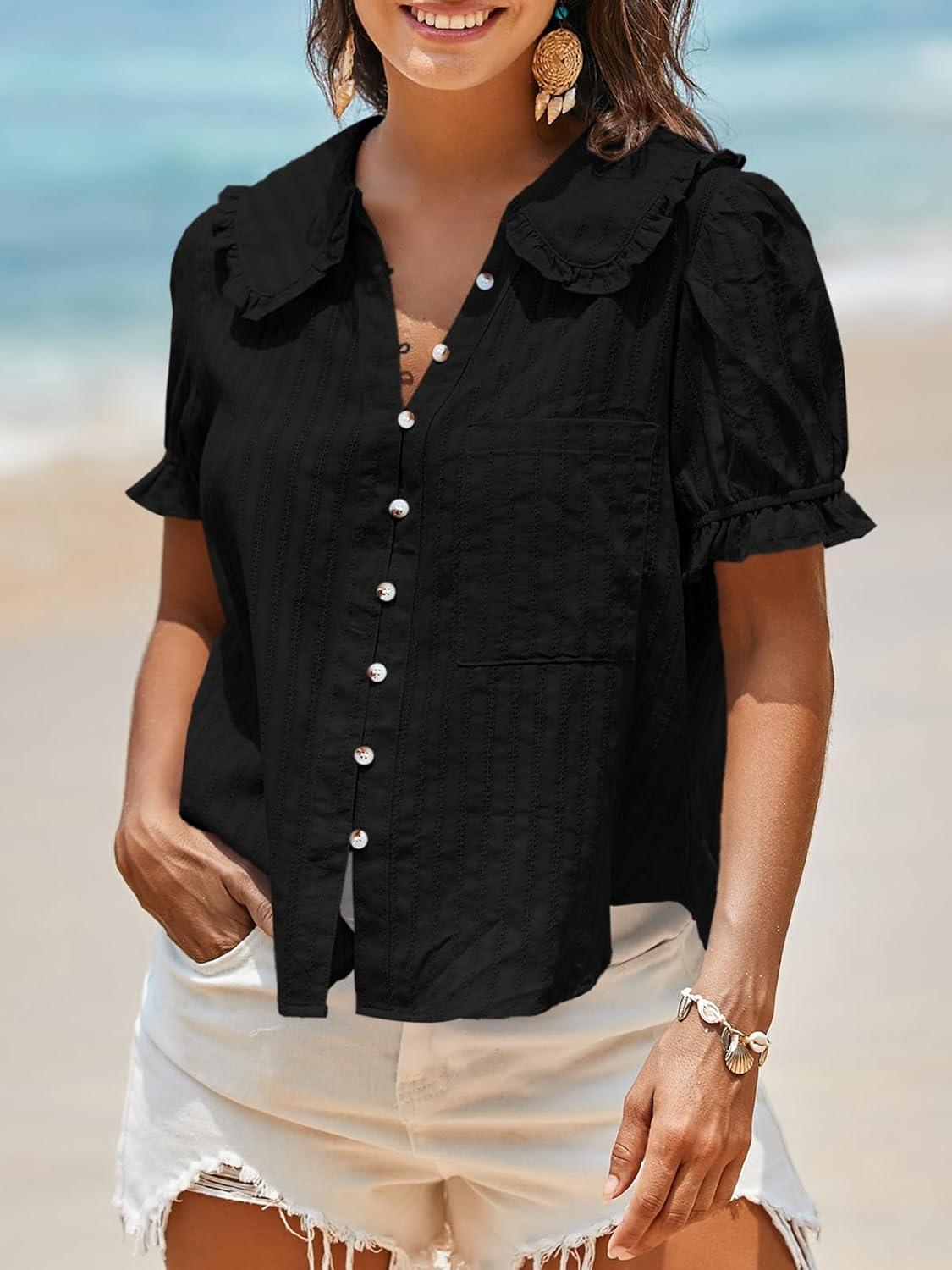 Tankaneo Womens Puff Sleeve Shirts Peter Pan Collar Button Down Cotton Blouse Casual Summer Textured Tops(Black)
