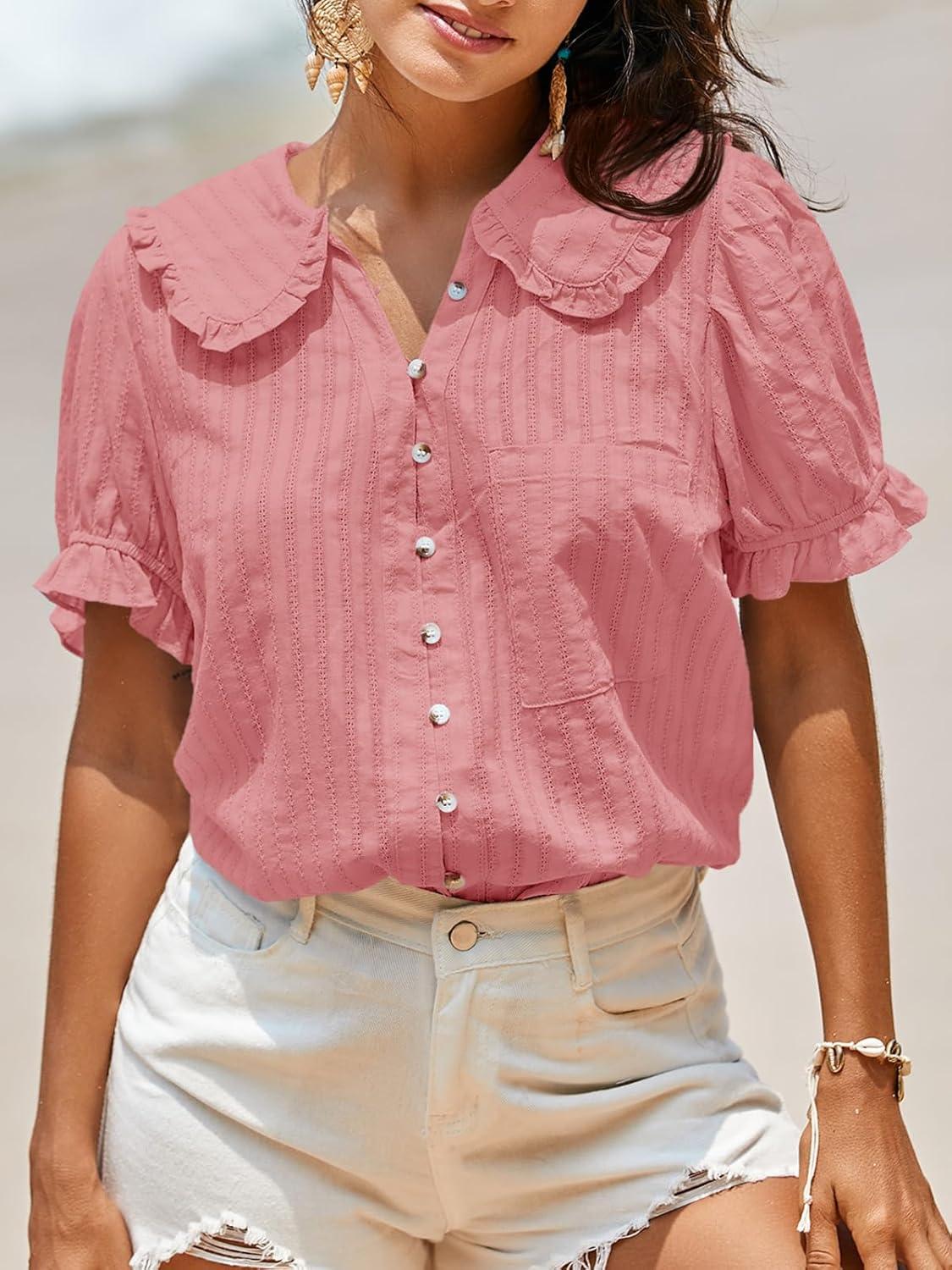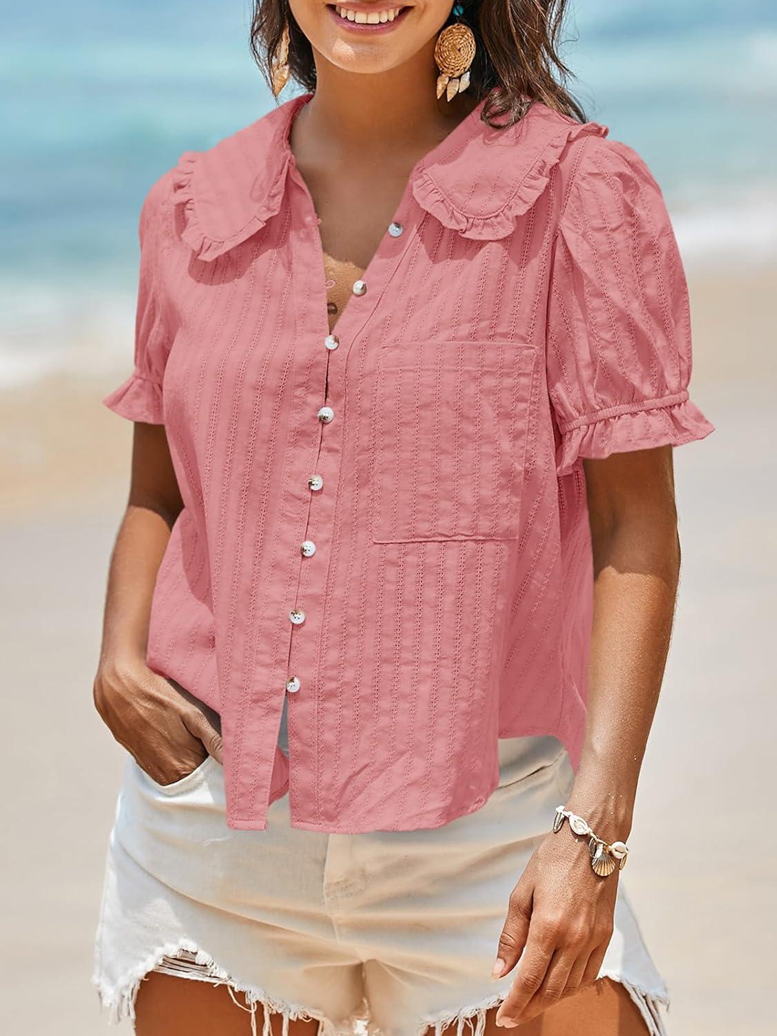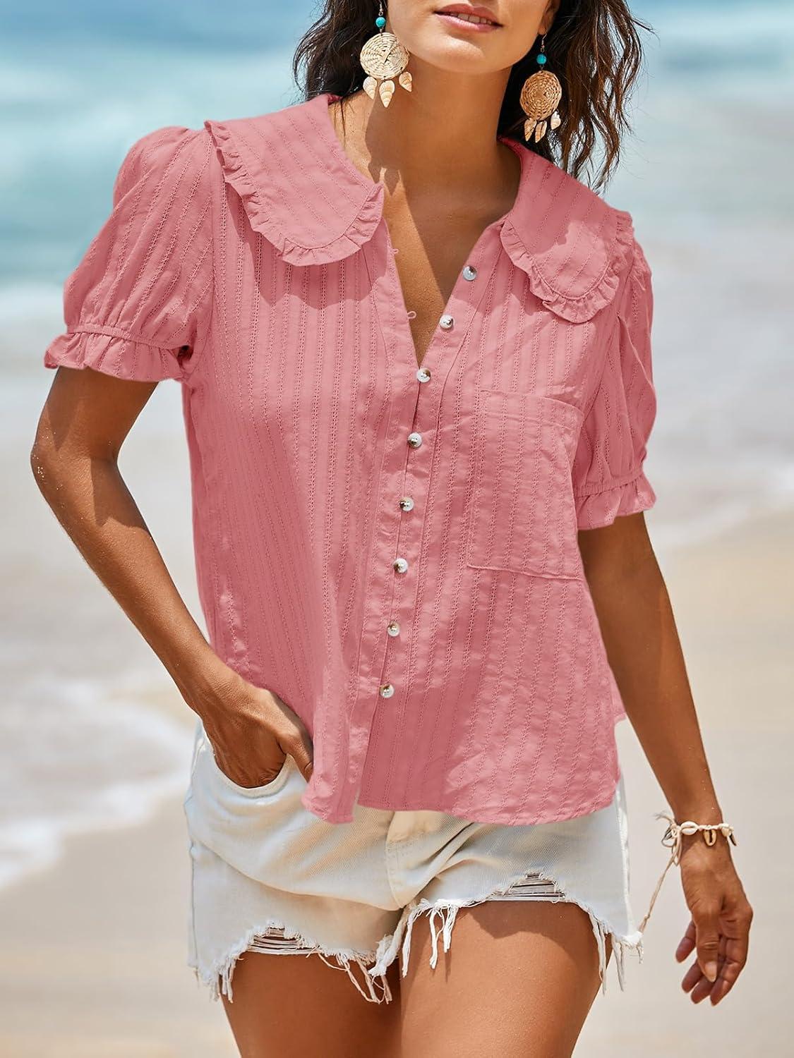 Tankaneo Womens Puff Sleeve Shirts Peter Pan Collar Button Down Cotton Blouse Casual Summer Textured Tops(Coral)