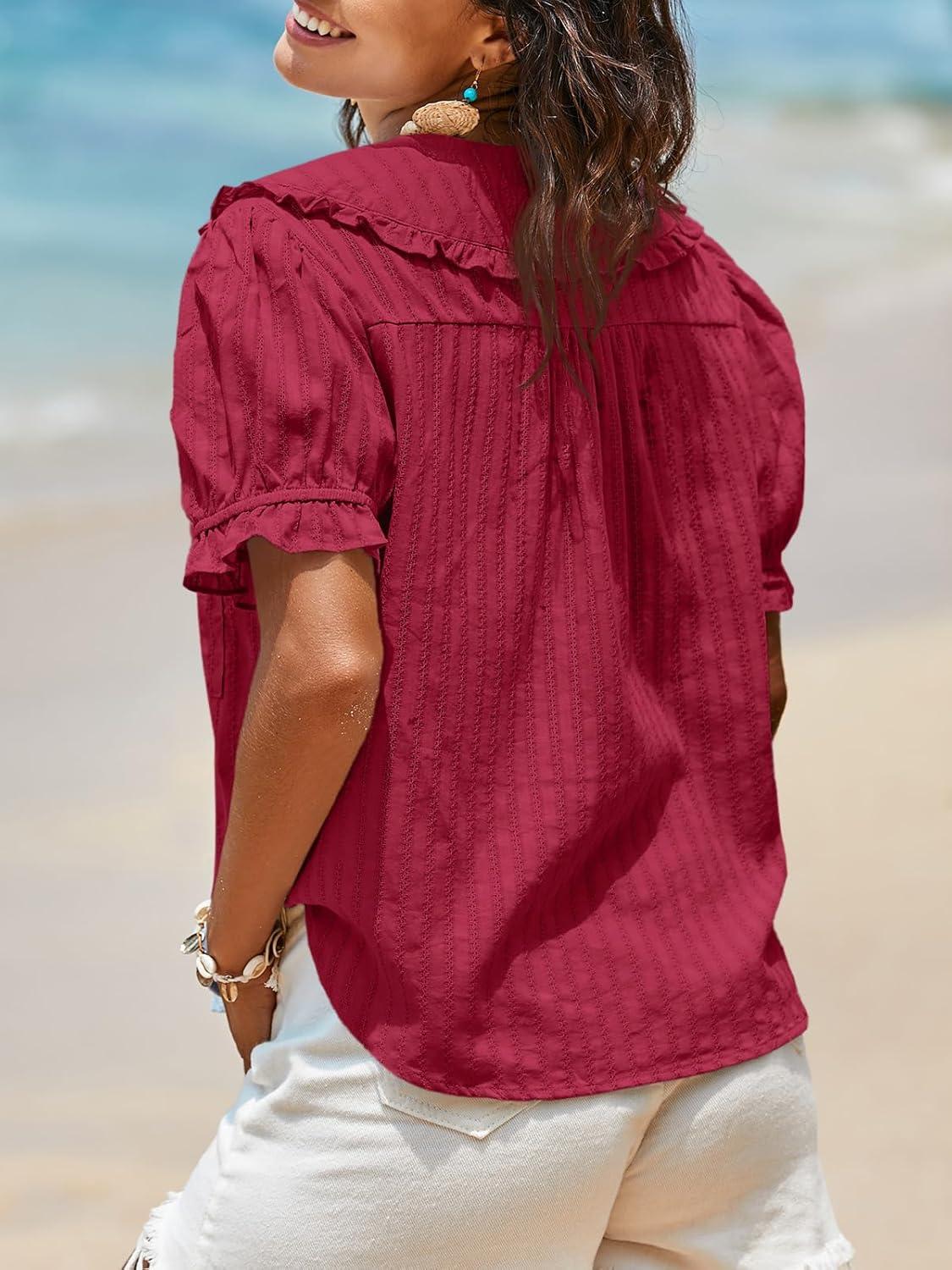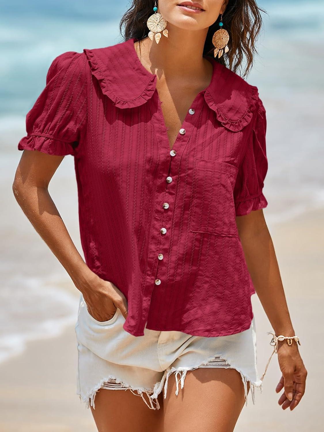 Tankaneo Womens Puff Sleeve Shirts Peter Pan Collar Button Down Cotton Blouse Casual Summer Textured Tops(Dark Red)