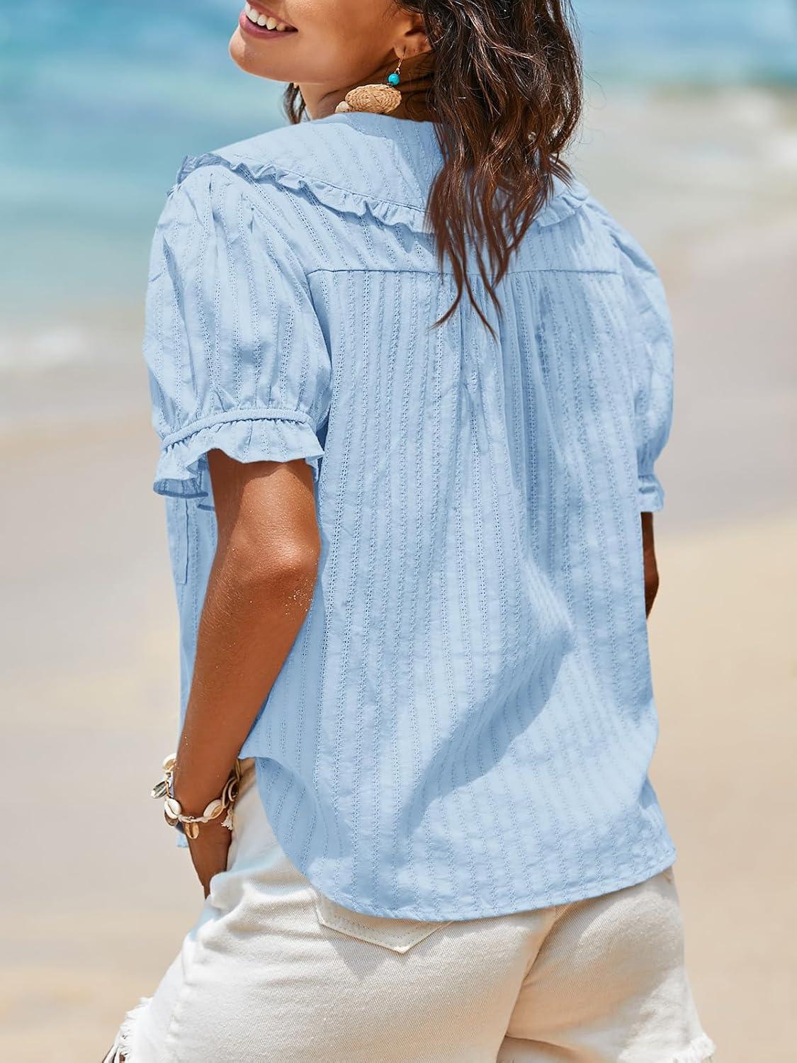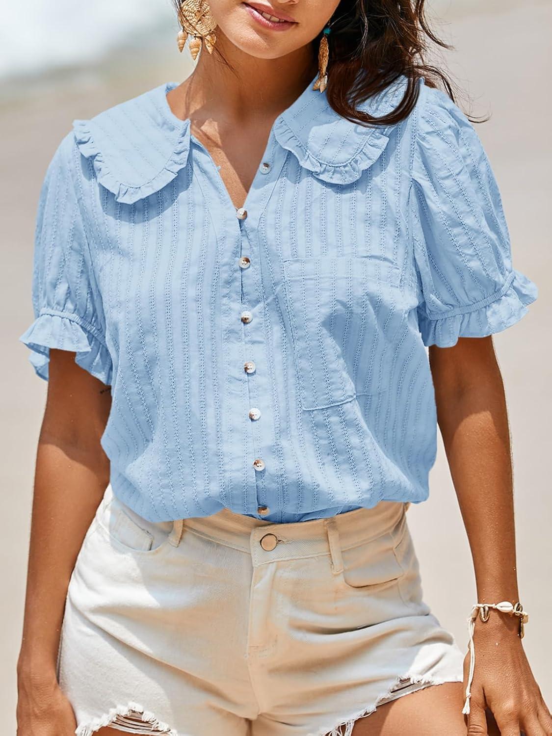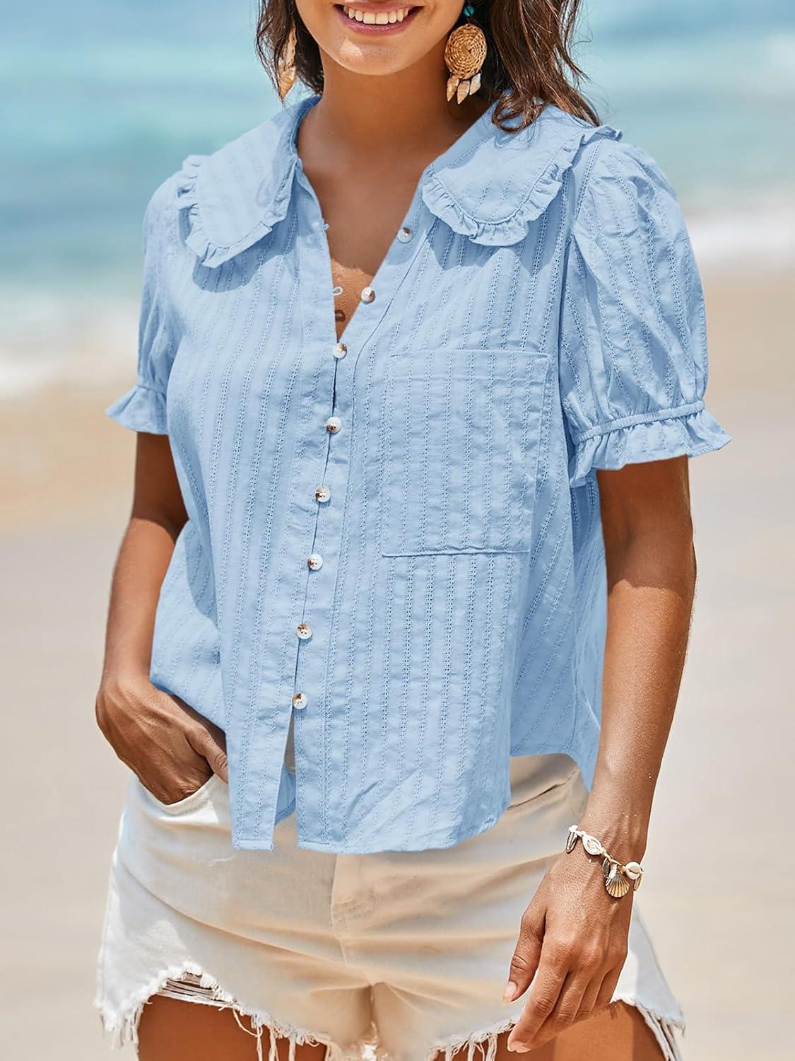 Tankaneo Womens Puff Sleeve Shirts Peter Pan Collar Button Down Cotton Blouse Casual Summer Textured Tops(Sky Blue)