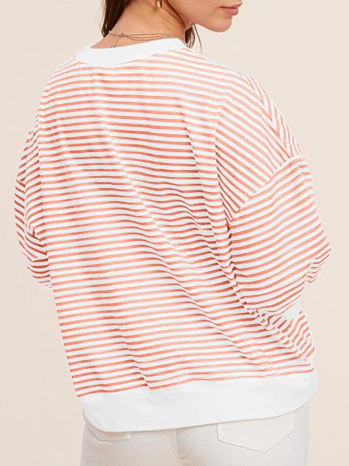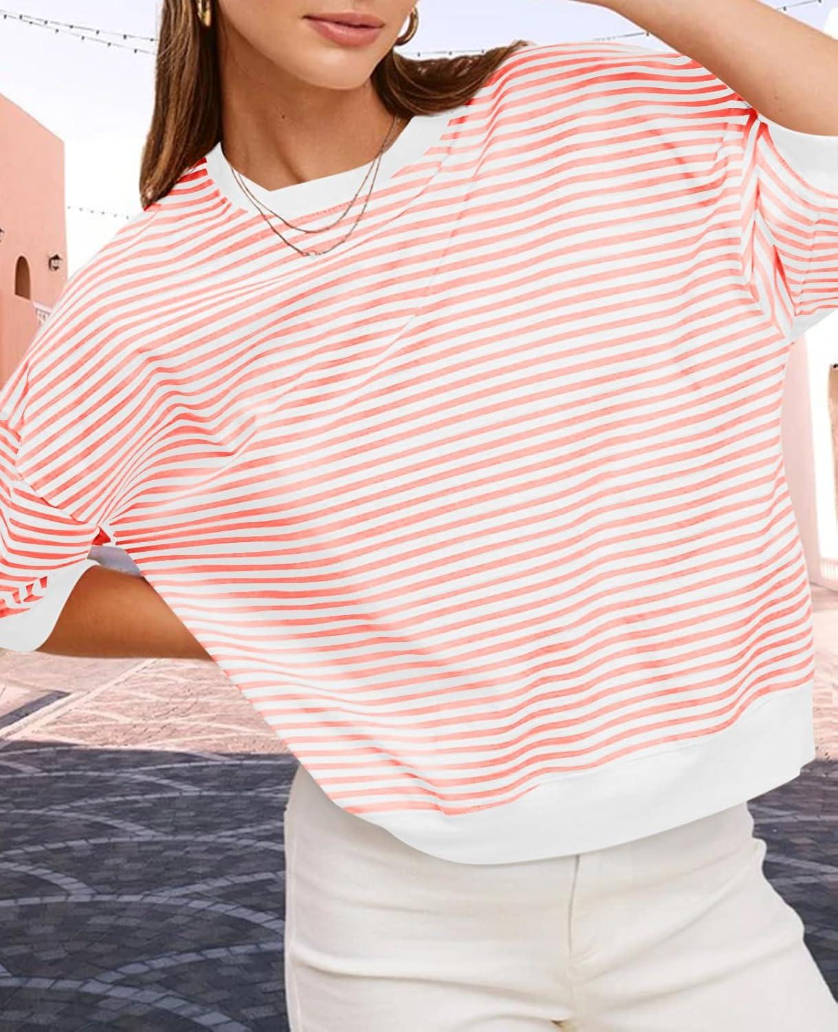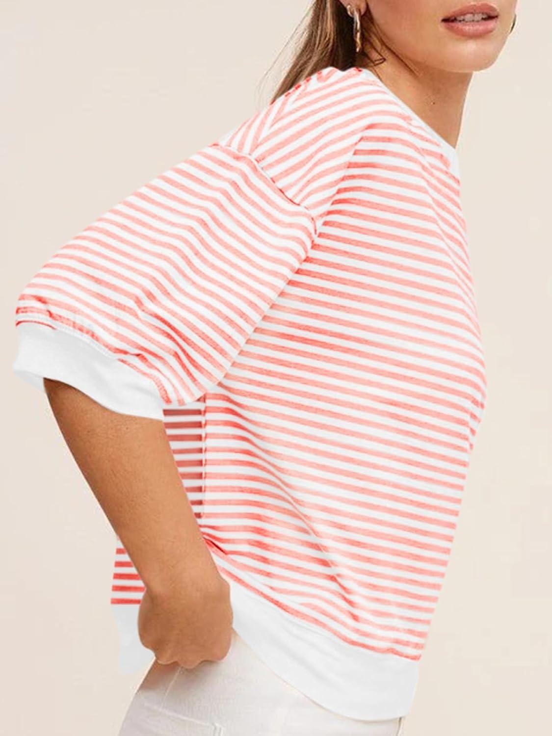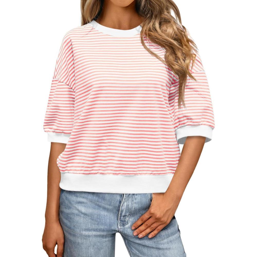 Tankaneo Womens Puff Sleeve Striped T Shirt Oversized Cropped Summer Casual Cotton Tops Loose Fitting Crewneck Sweatshirt(Pink)