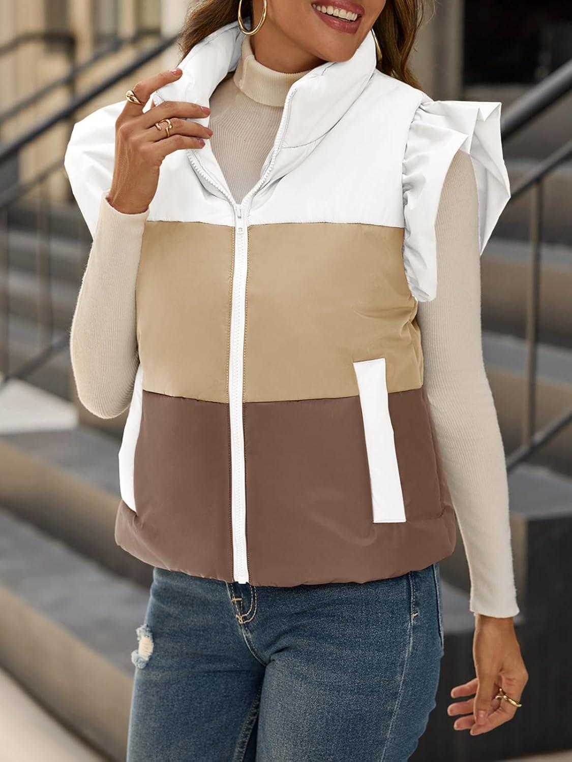 Tankaneo Womens Puffer Vest Ruffle Sleeveless Zip Up Quilted Jacket Color Block Winter Warm Padded Gilet Coats(Coffee)