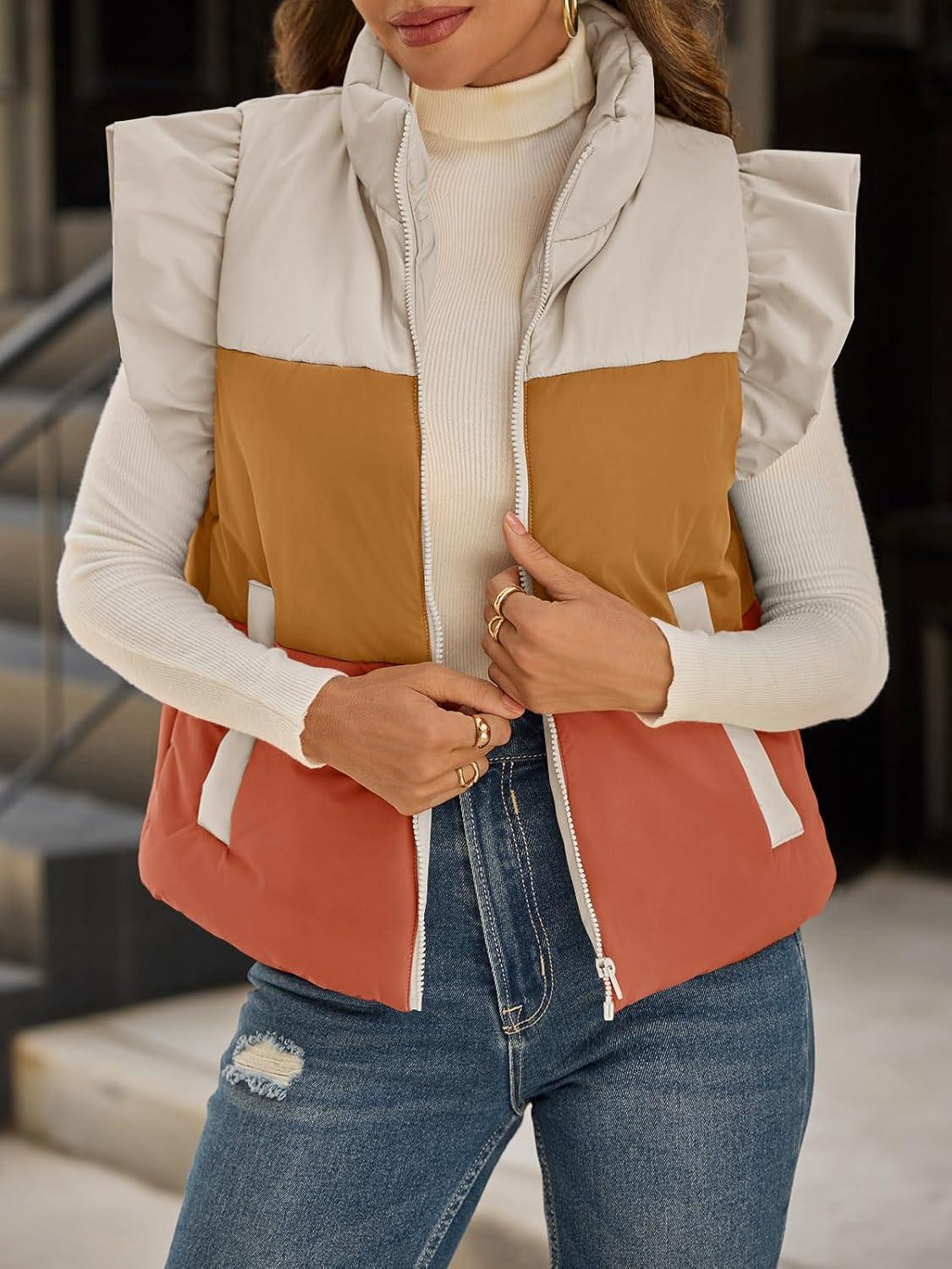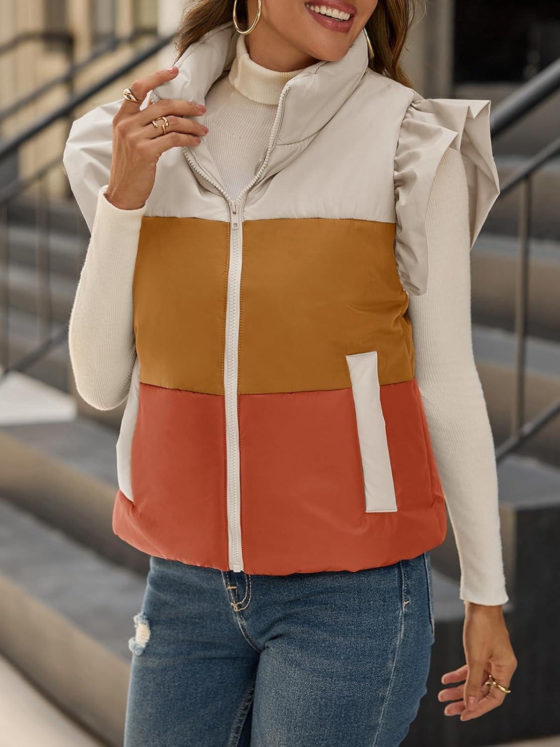 Tankaneo Womens Puffer Vest Ruffle Sleeveless Zip Up Quilted Jacket Color Block Winter Warm Padded Gilet Coats(Khaki)