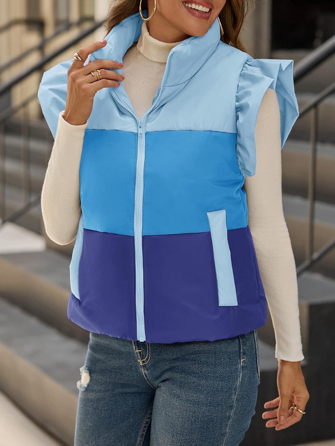 Tankaneo Womens Puffer Vest Ruffle Sleeveless Zip Up Quilted Jacket Color Block Winter Warm Padded Gilet Coats(Navy)