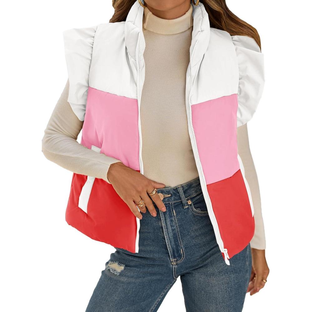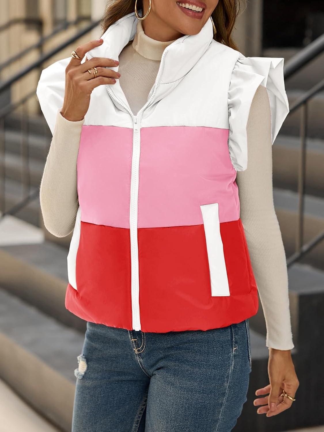 Tankaneo Womens Puffer Vest Ruffle Sleeveless Zip Up Quilted Jacket Color Block Winter Warm Padded Gilet Coats(Red)