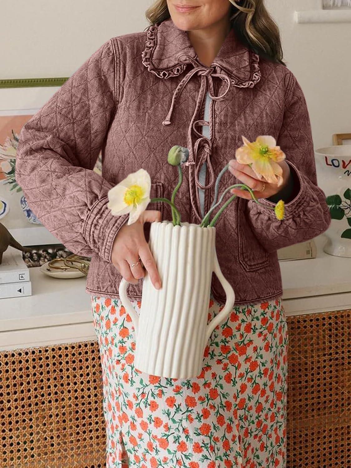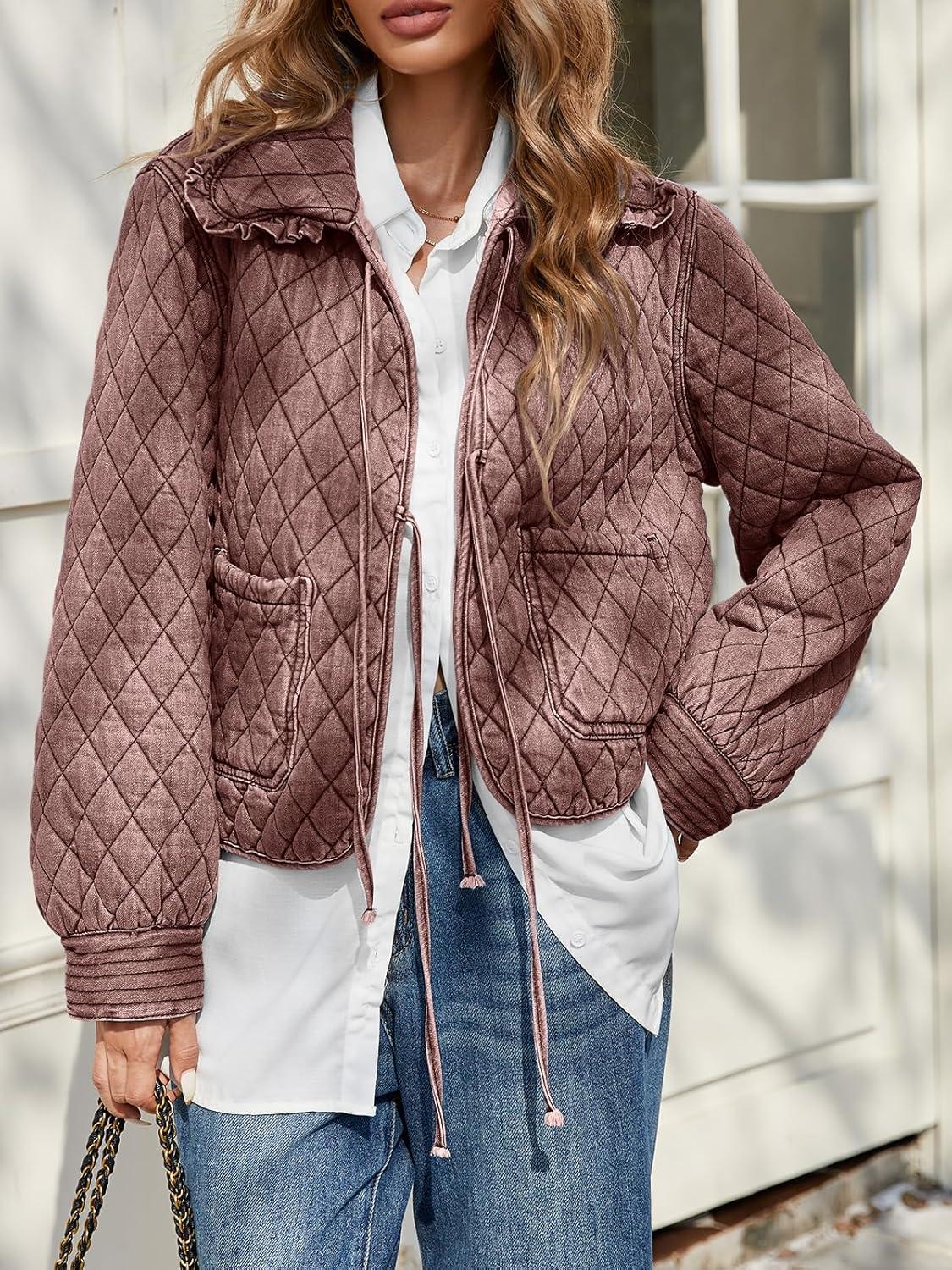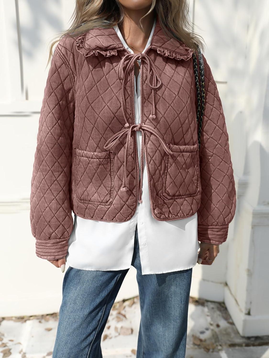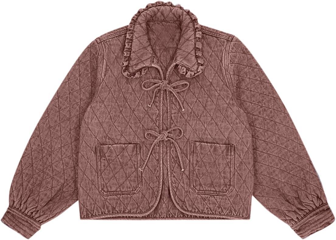 Tankaneo Womens Quilted Denim Puffer Jackets Tie Front Bow Cropped Puffy Jackets Fall Cute Short Jeans Coat(Coffee)