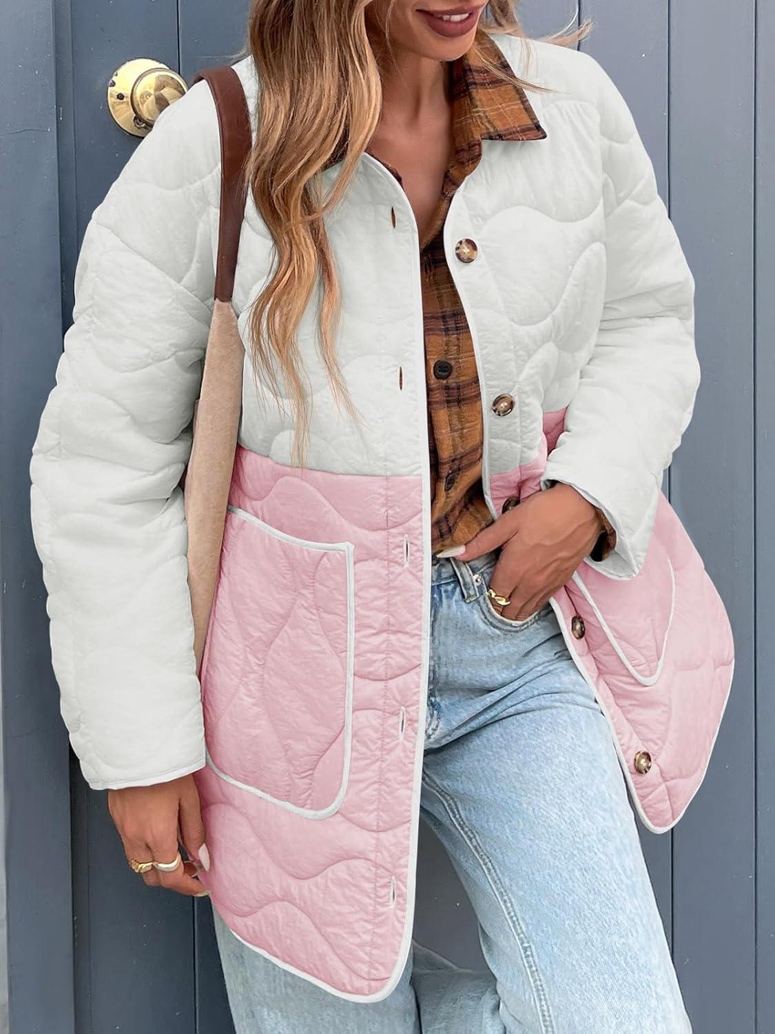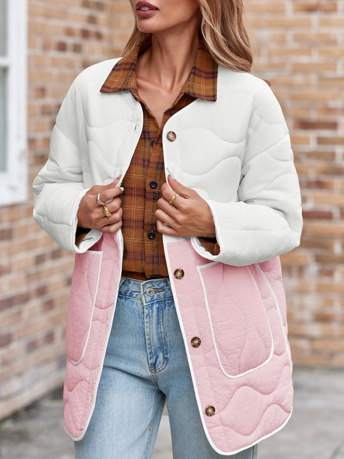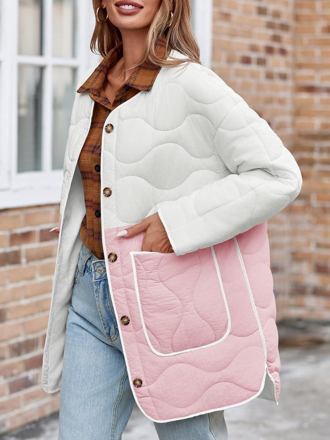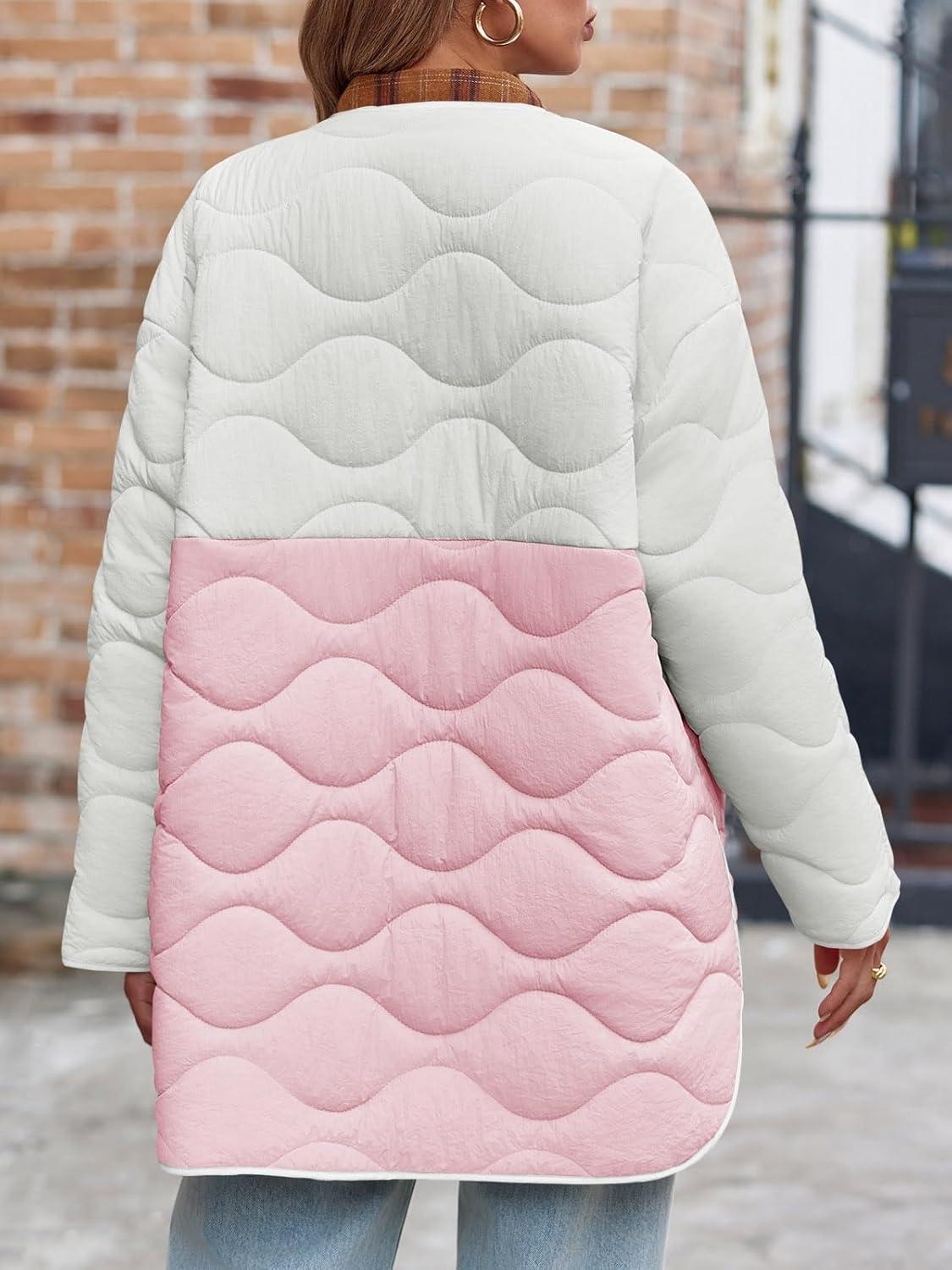 Tankaneo Womens Quilted Lightweight Jackets Mid Length Collarless Shacket Coats Button Down Winter Outerwear(Pink)