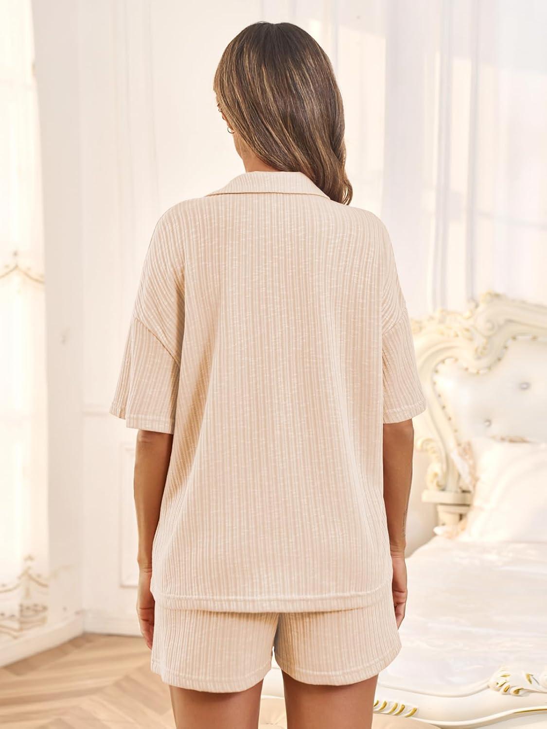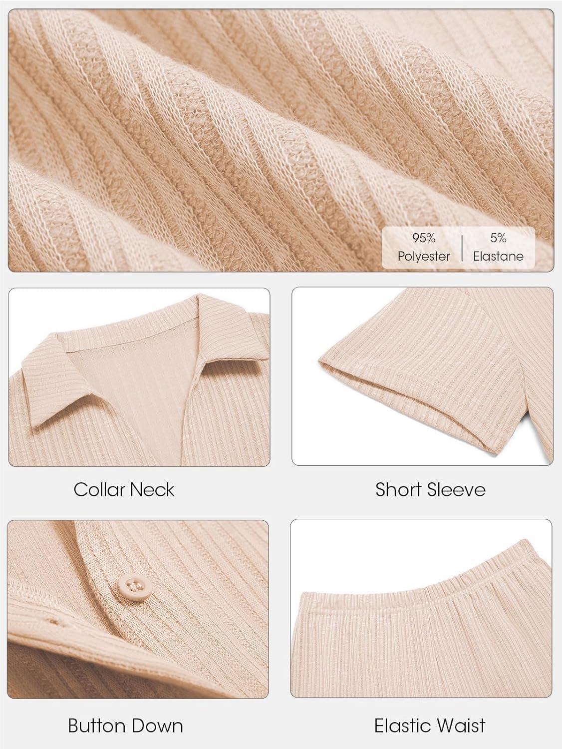 Tankaneo Womens Ribbed Knit 2 Piece Pajama Sets Button Down Short Sleeve Tops and Shorts Set Summer Casual Loungewear(Apricot)