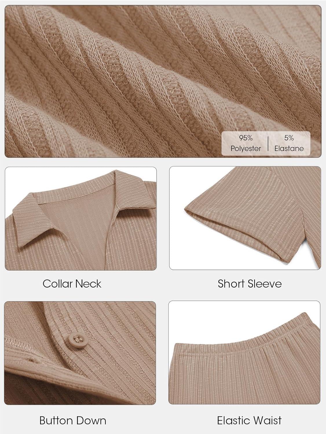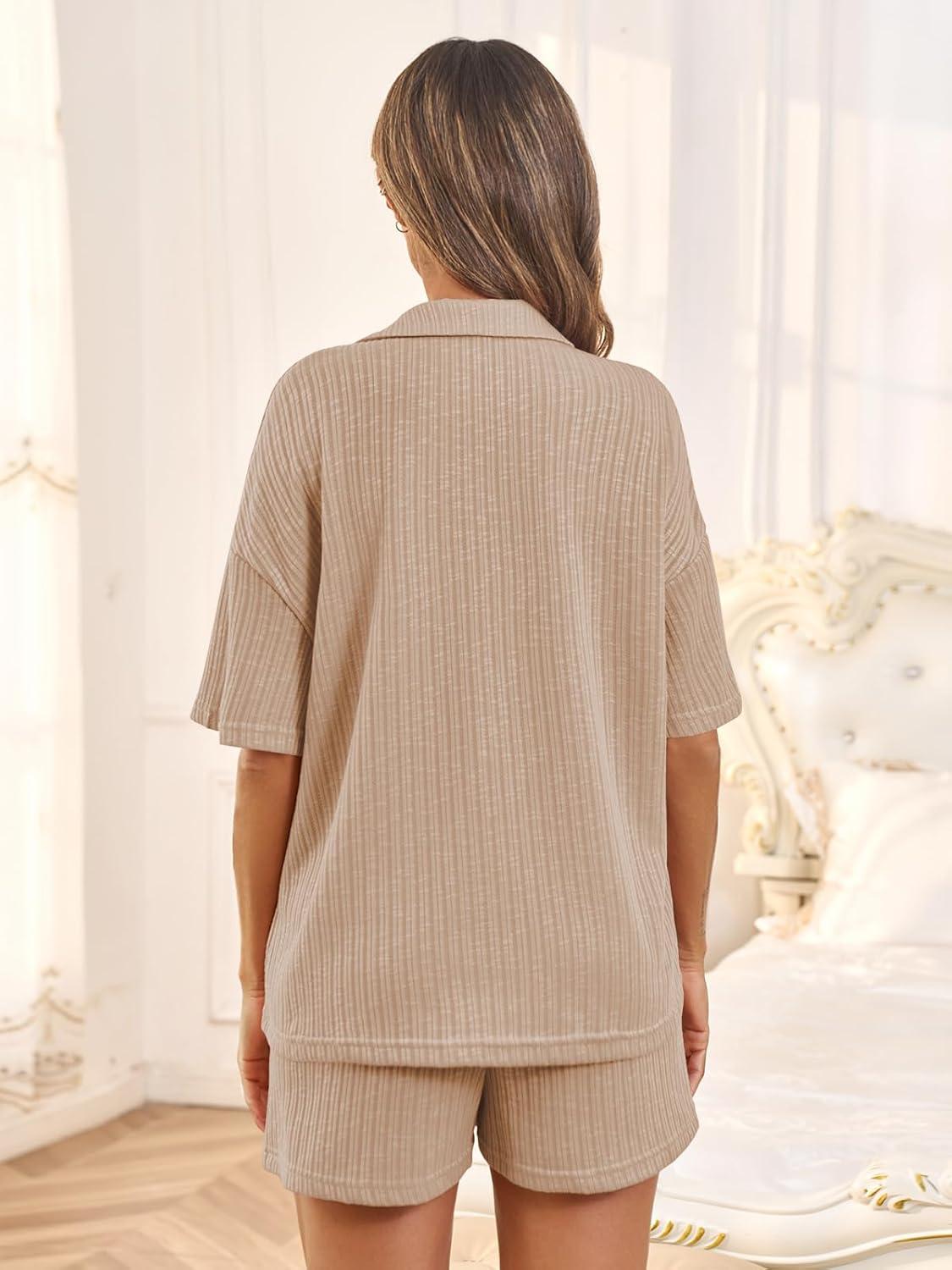 Tankaneo Womens Ribbed Knit 2 Piece Pajama Sets Button Down Short Sleeve Tops and Shorts Set Summer Casual Loungewear(Khaki)