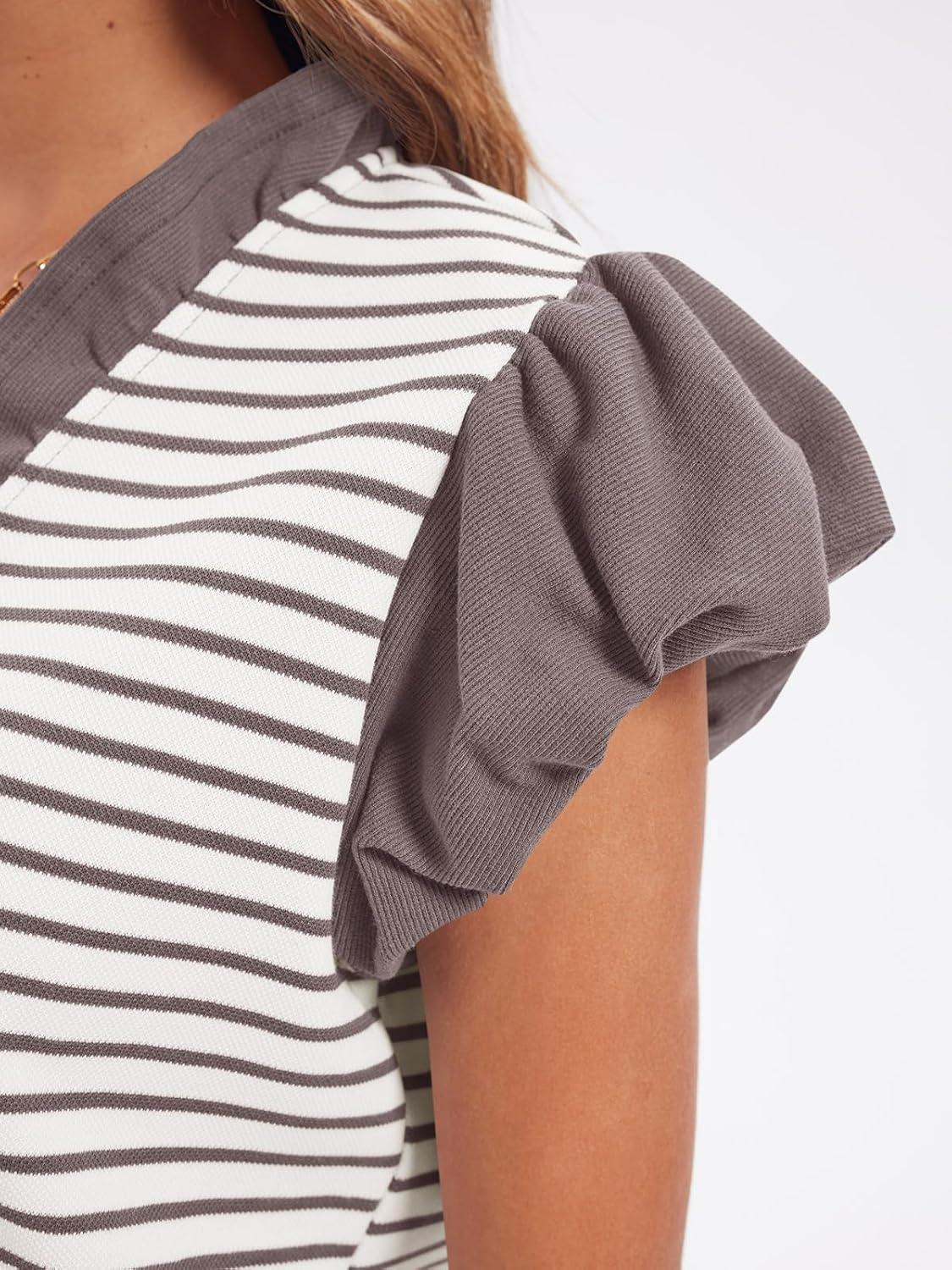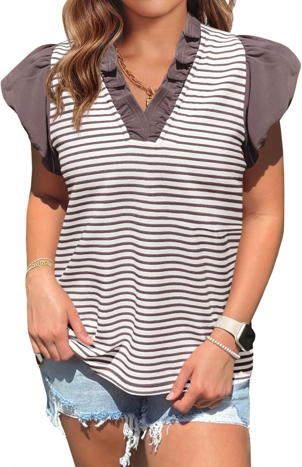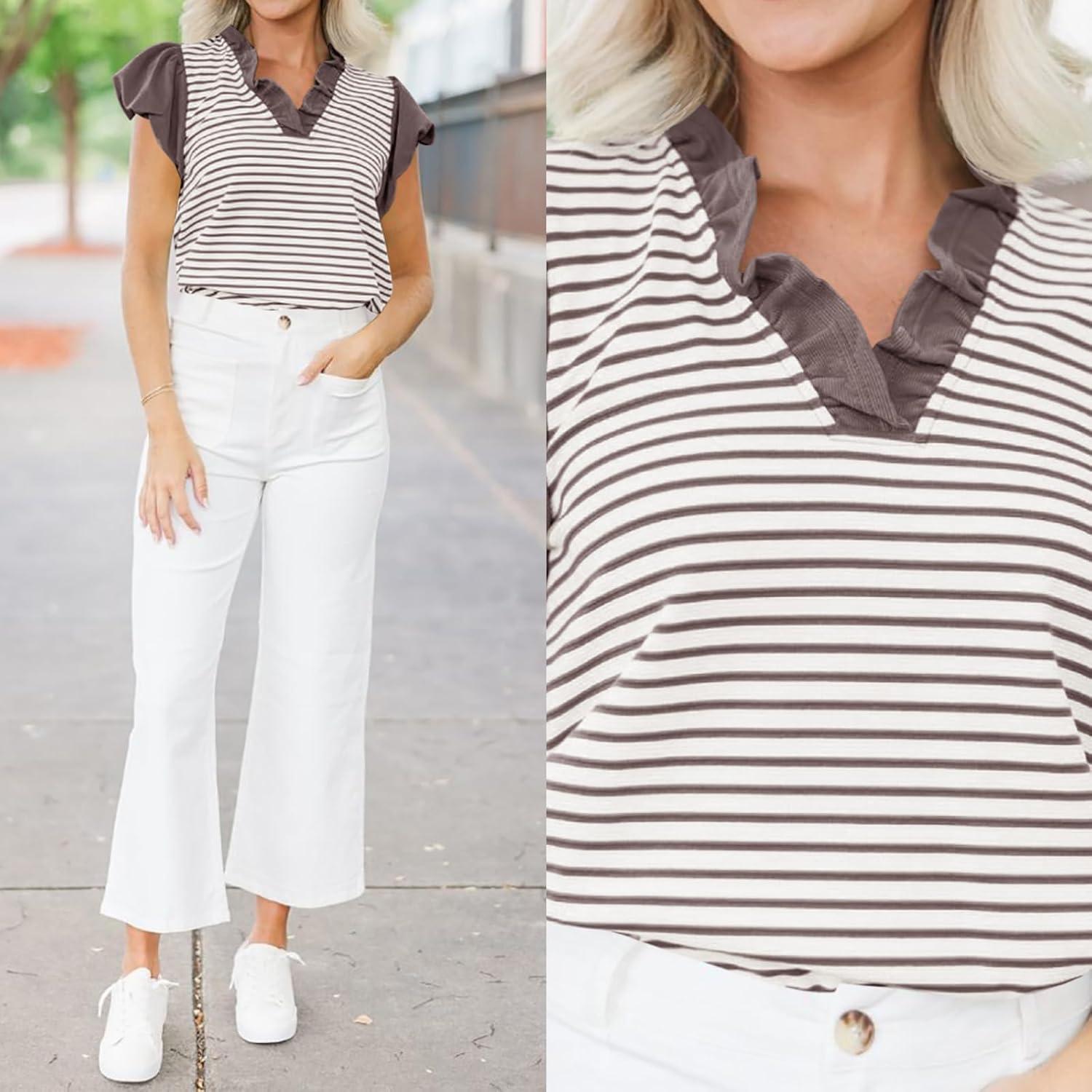 Tankaneo Womens Ruffle Cap Sleeve Tank Tops Summer Casual Cute Color Block Striped Tshirts Pleated V Neck Shirts(Khaki)