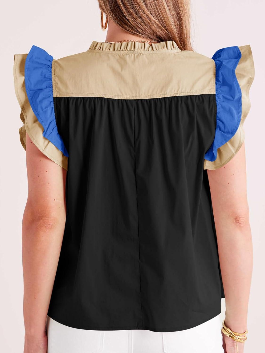 Tankaneo Womens Ruffle Color Block Tank Tops Summer Casual Dressy V Neck Pleated Blouse Loose Fit Sleeveless Shirts(Black)